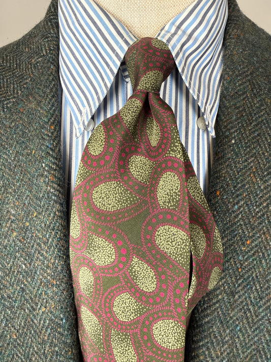 Cravatta meravigliosa, stupenda nella fantasia e al tatto morbida, come solo le cravatte vintage di una certa qualità sanno essere. E di certo sa cosa compra chi si affida alla selezione esperta, alla cortesia, alla visione storica e artigianale di chi cura Treble and Bass.. una selezione intelligente, oculata, a chilometro zero di abbigliamento e accessori vintage di elevata qualità, che vestono il corpo e nutrono l’anima del gusto della qualità e del valore artigianale di ciò che è fatto come si deve e come pochi ancora sanno fare!