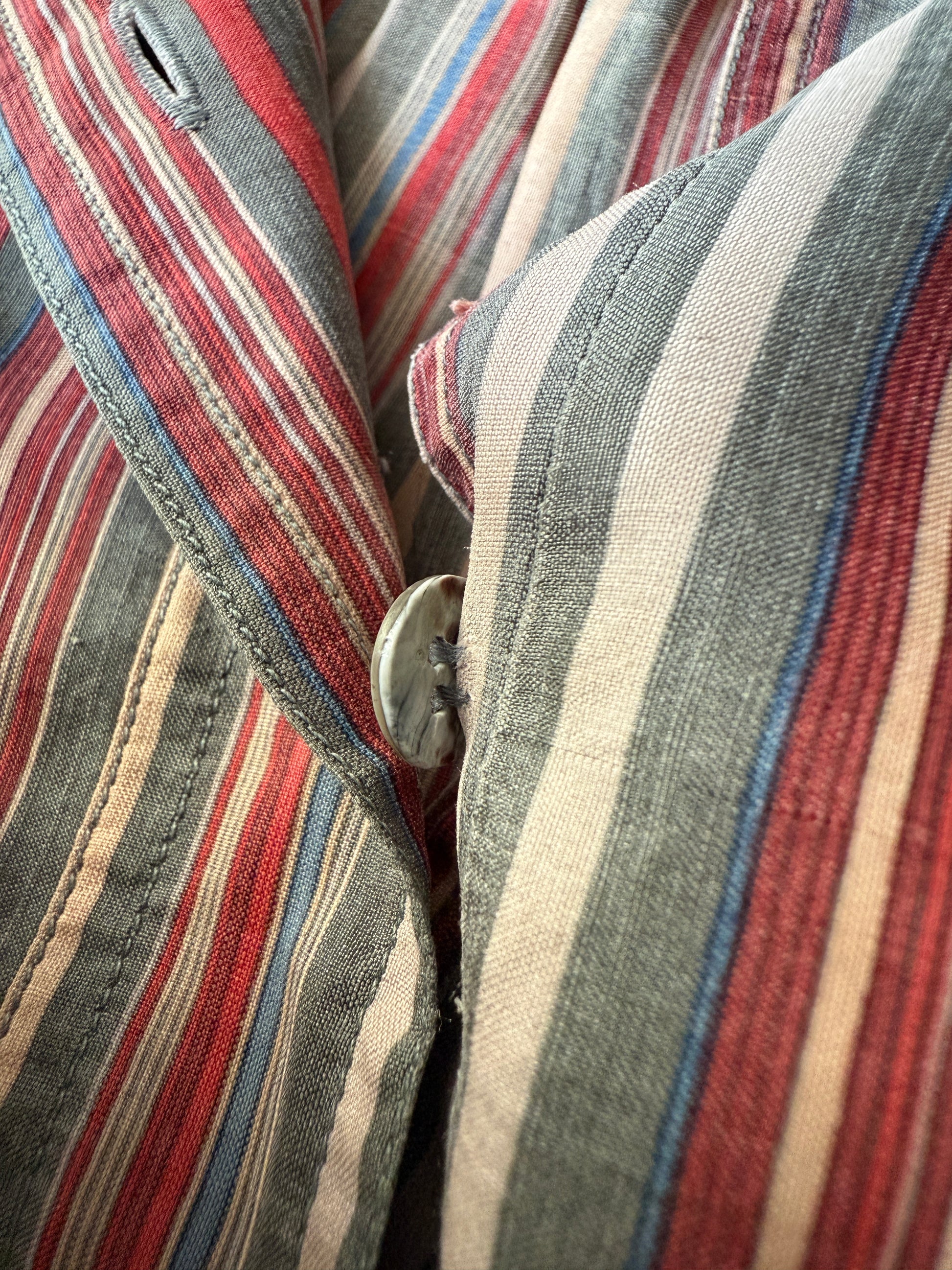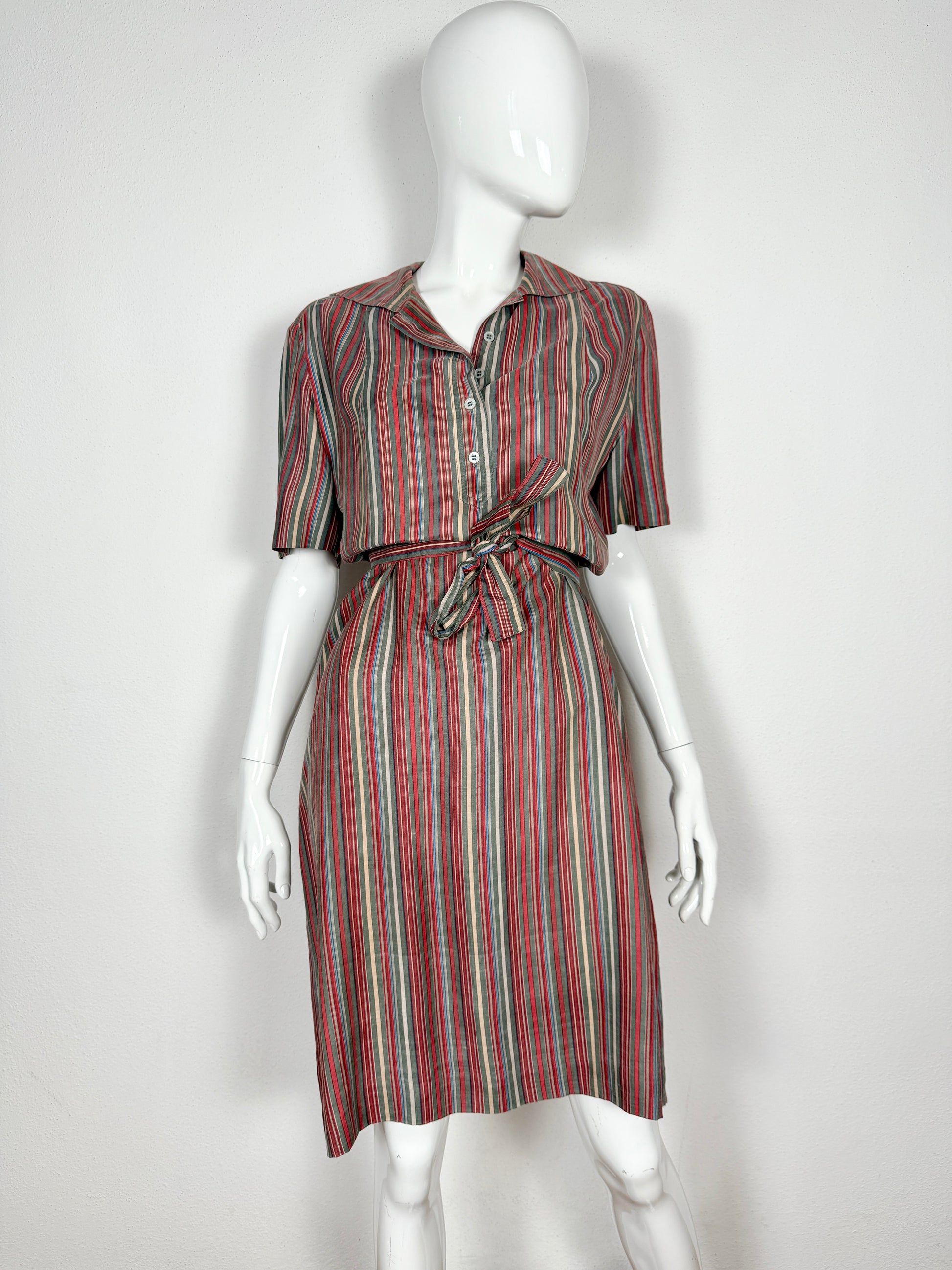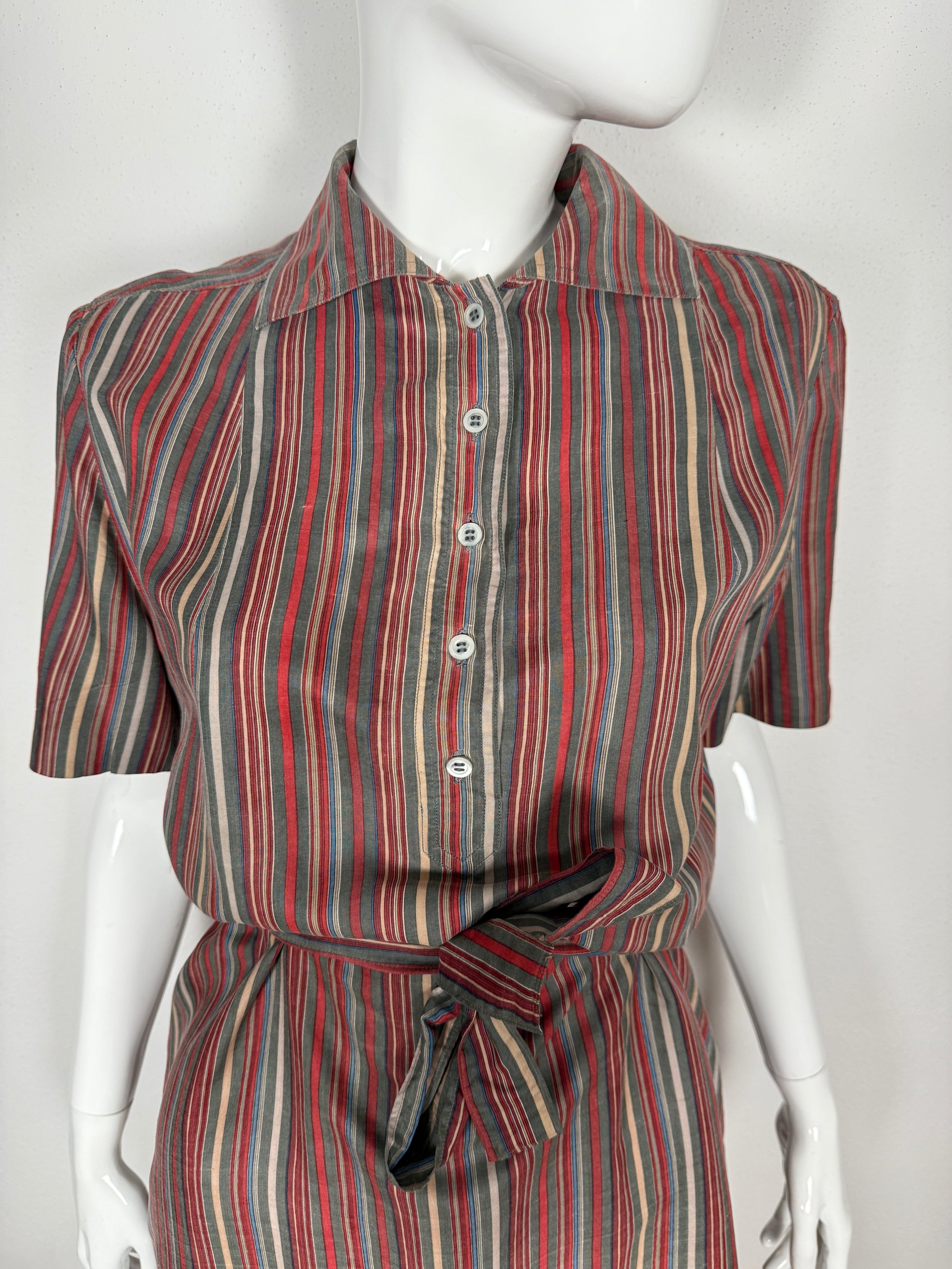 Abito chemisier Saint Laurent linea Rive Gauche, anni ‘70/‘80 made in France, in seta lavata con fantasia a righe sottili sui toni del rosso, ruggine, beige, verde.