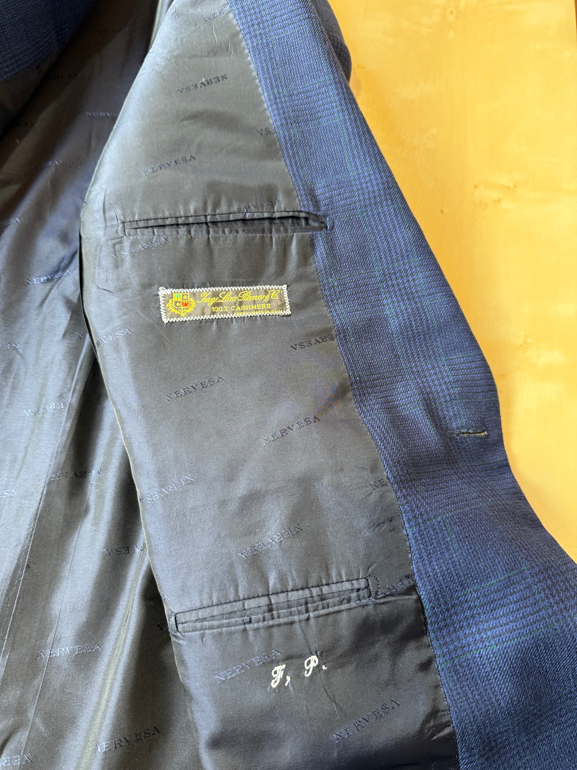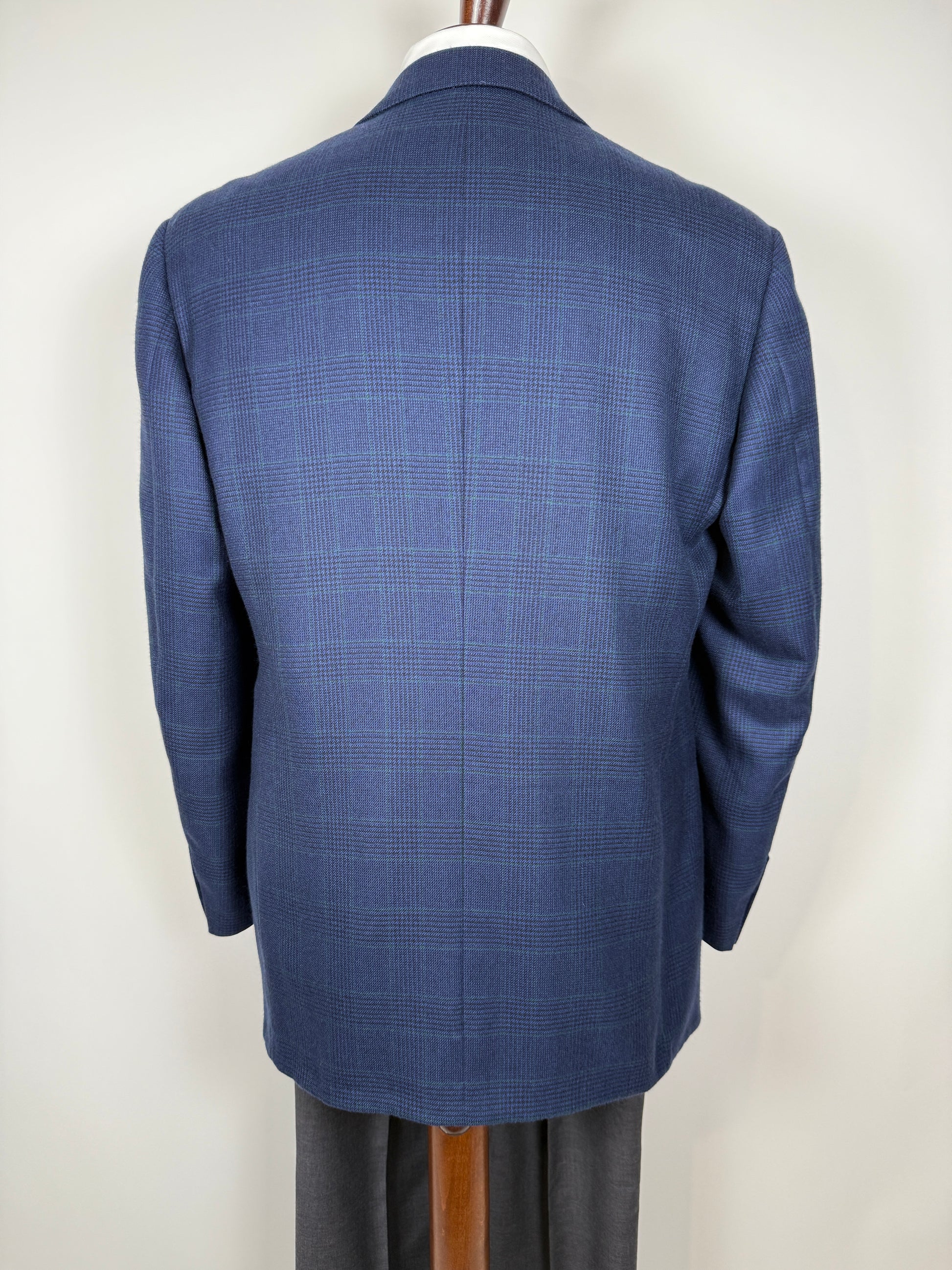 Splendido blazer sartoriale su misura Nervesa, confezionato con un panno in 100% puro cashmere di Loro Piana a fantasia principe di Galles blu scuro.