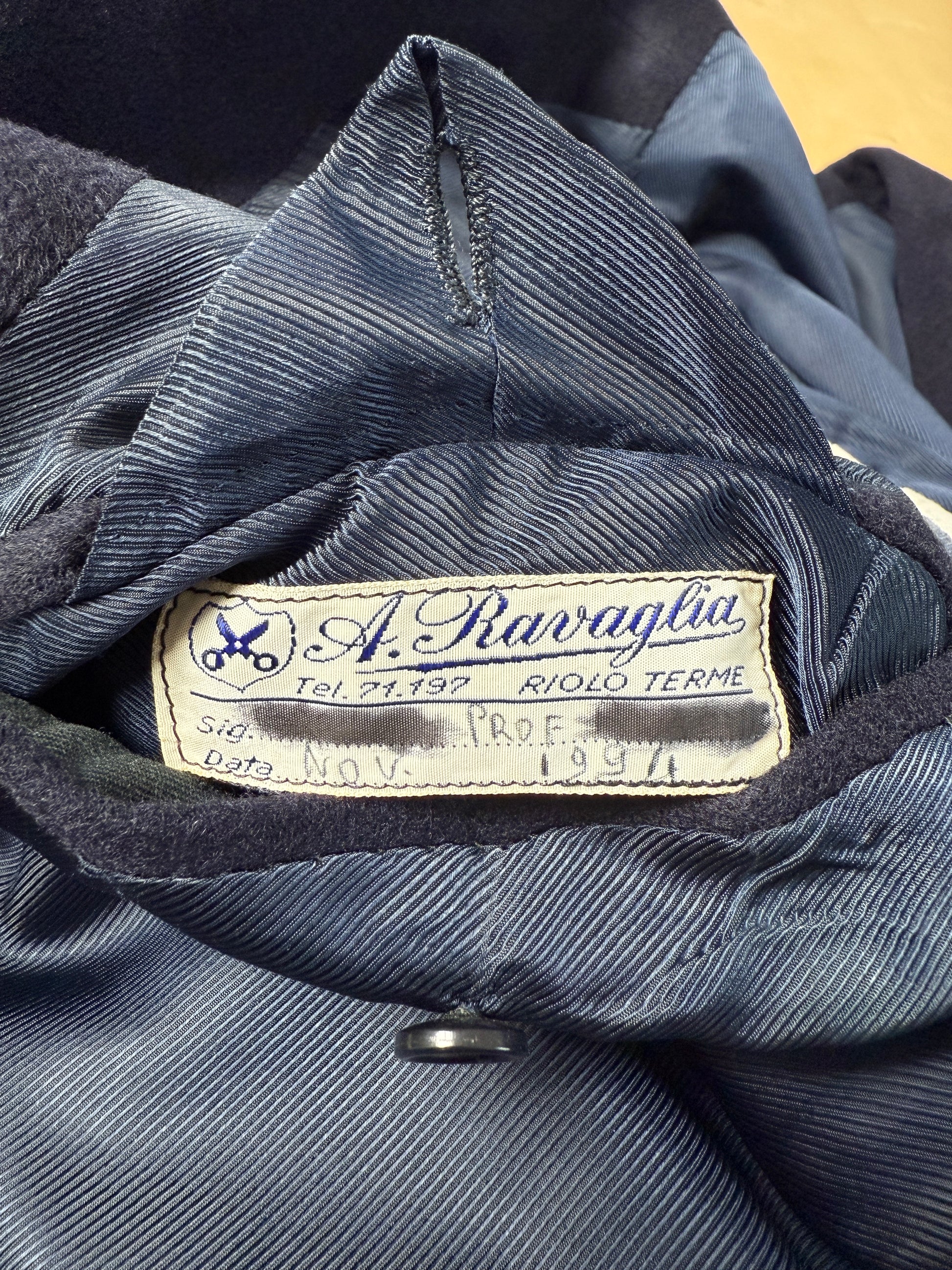 Magnifico blazer sartoriale confezionato interamente a mano, sartoria Ravaglia di Riolo Terme (RA), datato 1994.