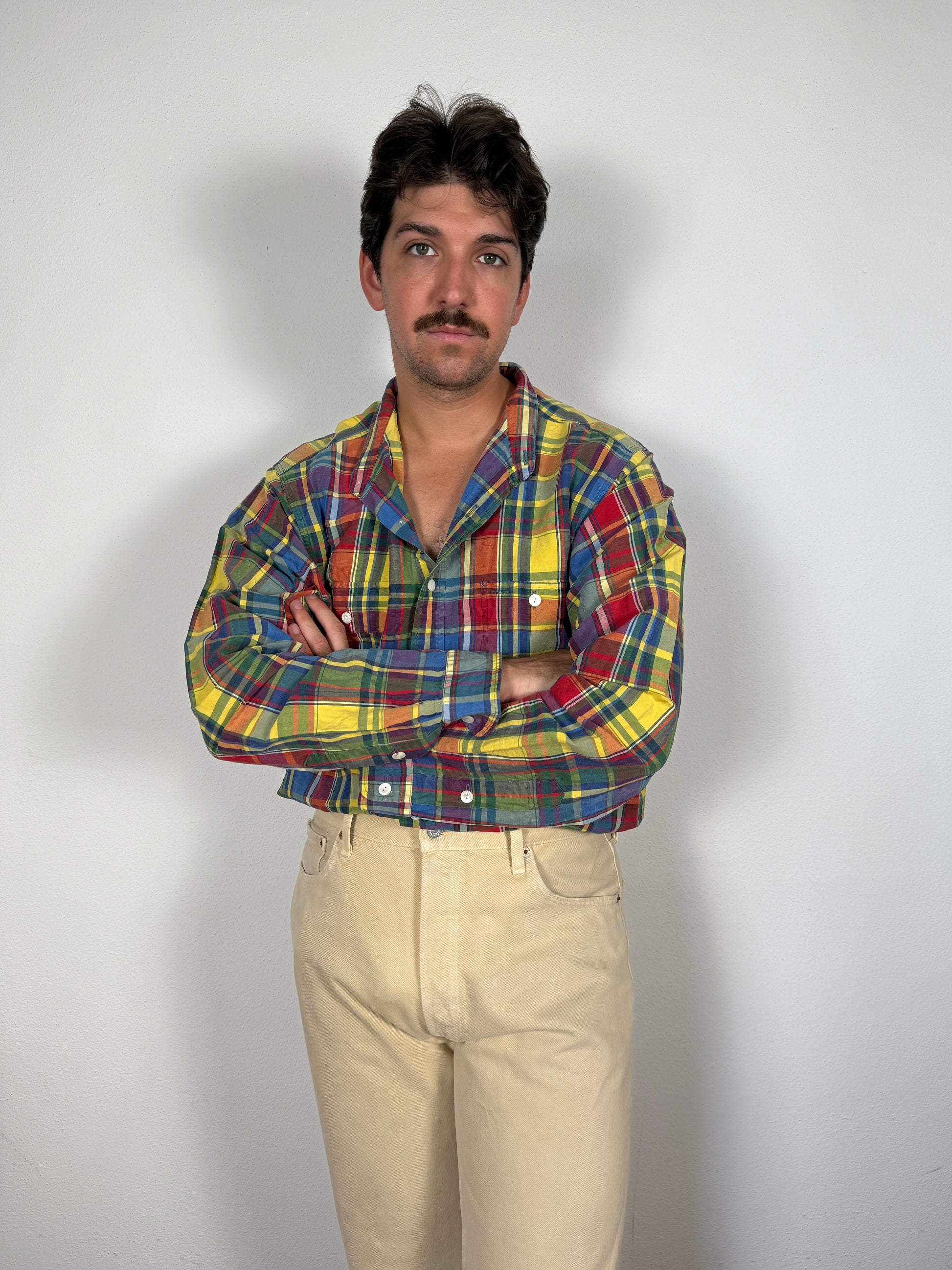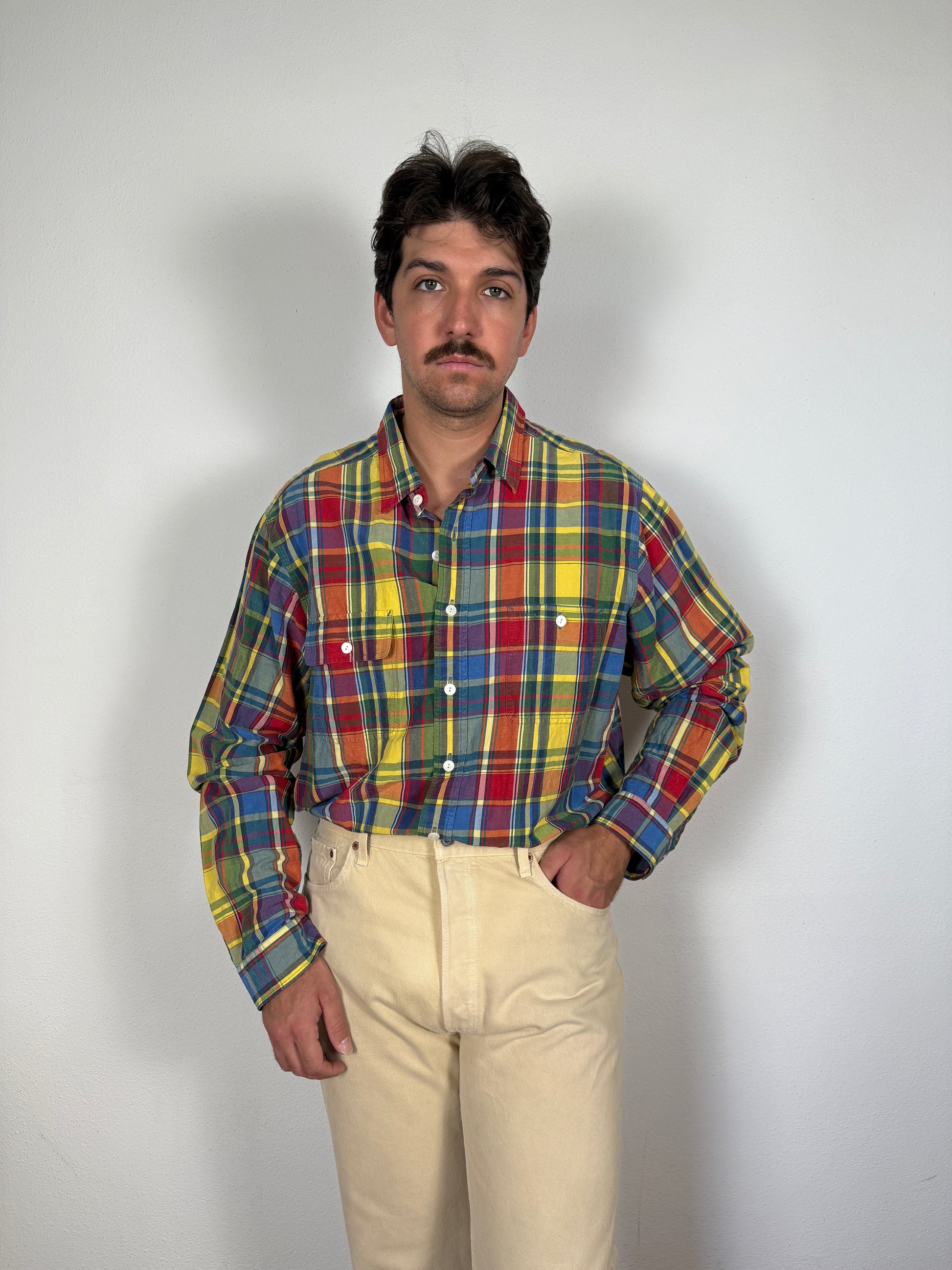Camicia Polo Ralph Lauren con fantasia a quadri multicolore, in un bellissimo tessuto 56% lino e 44% seta, estivo e dalla finitura leggermente grezza.