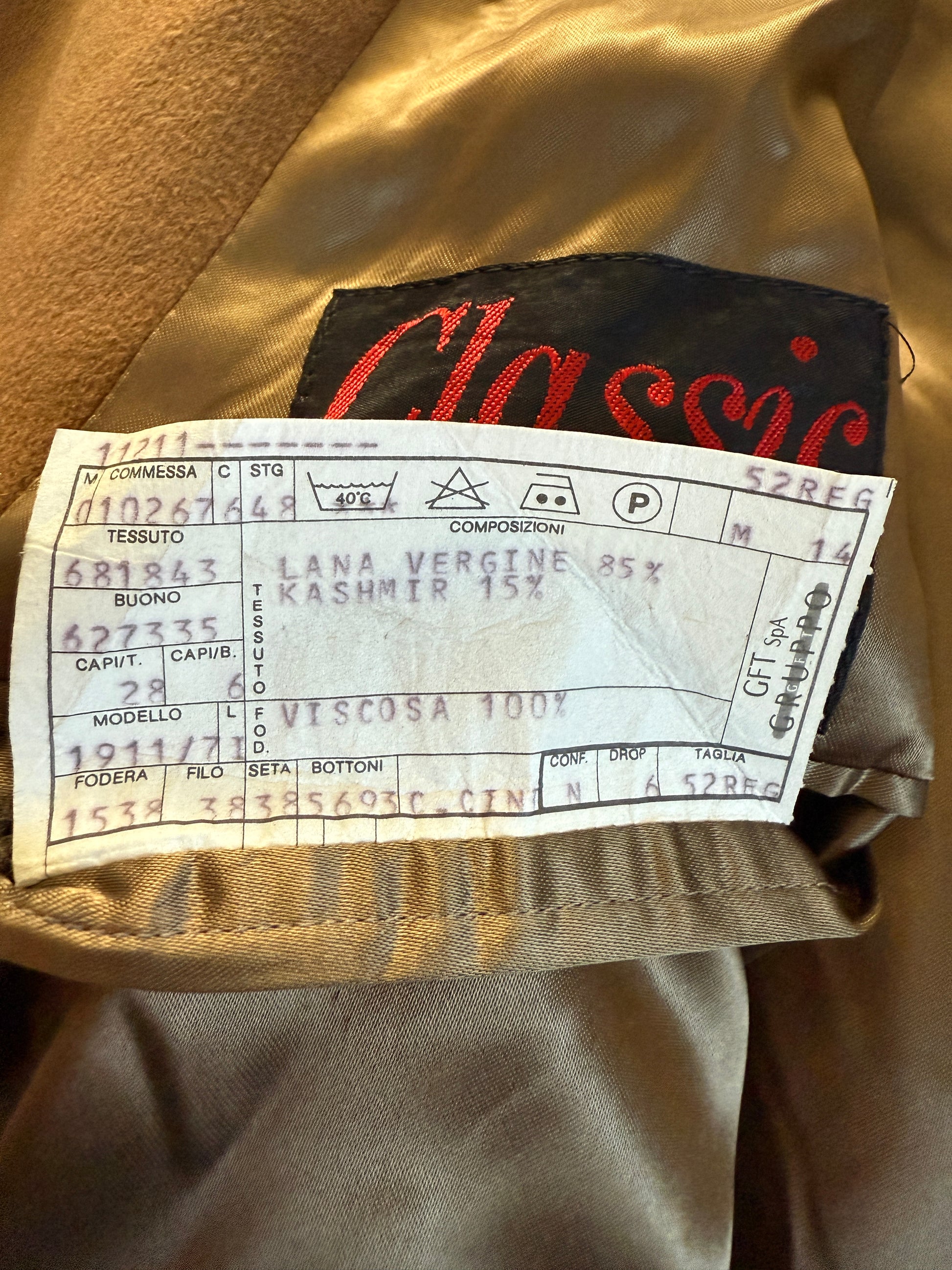 Taglia in etichetta 52: veste bene una 50 o 52 come soprabito (sopra a una giacca), e fino a una 54 se portato con meno strati sottostanti.
