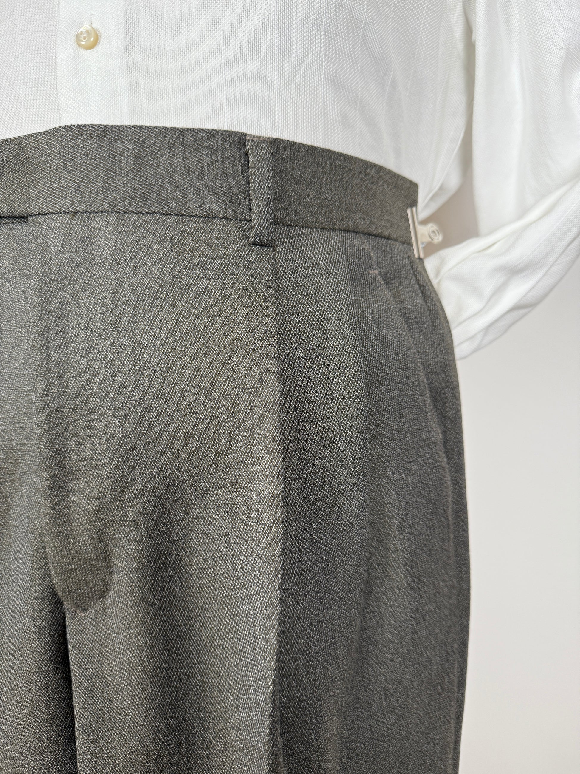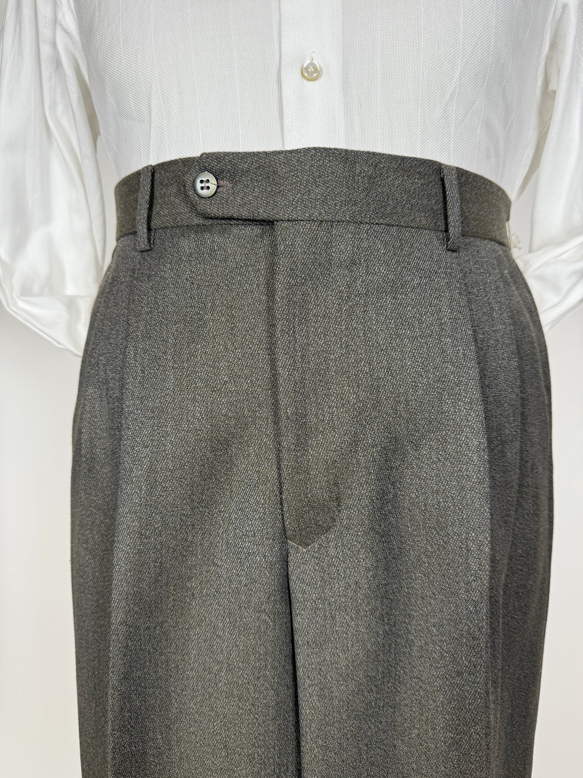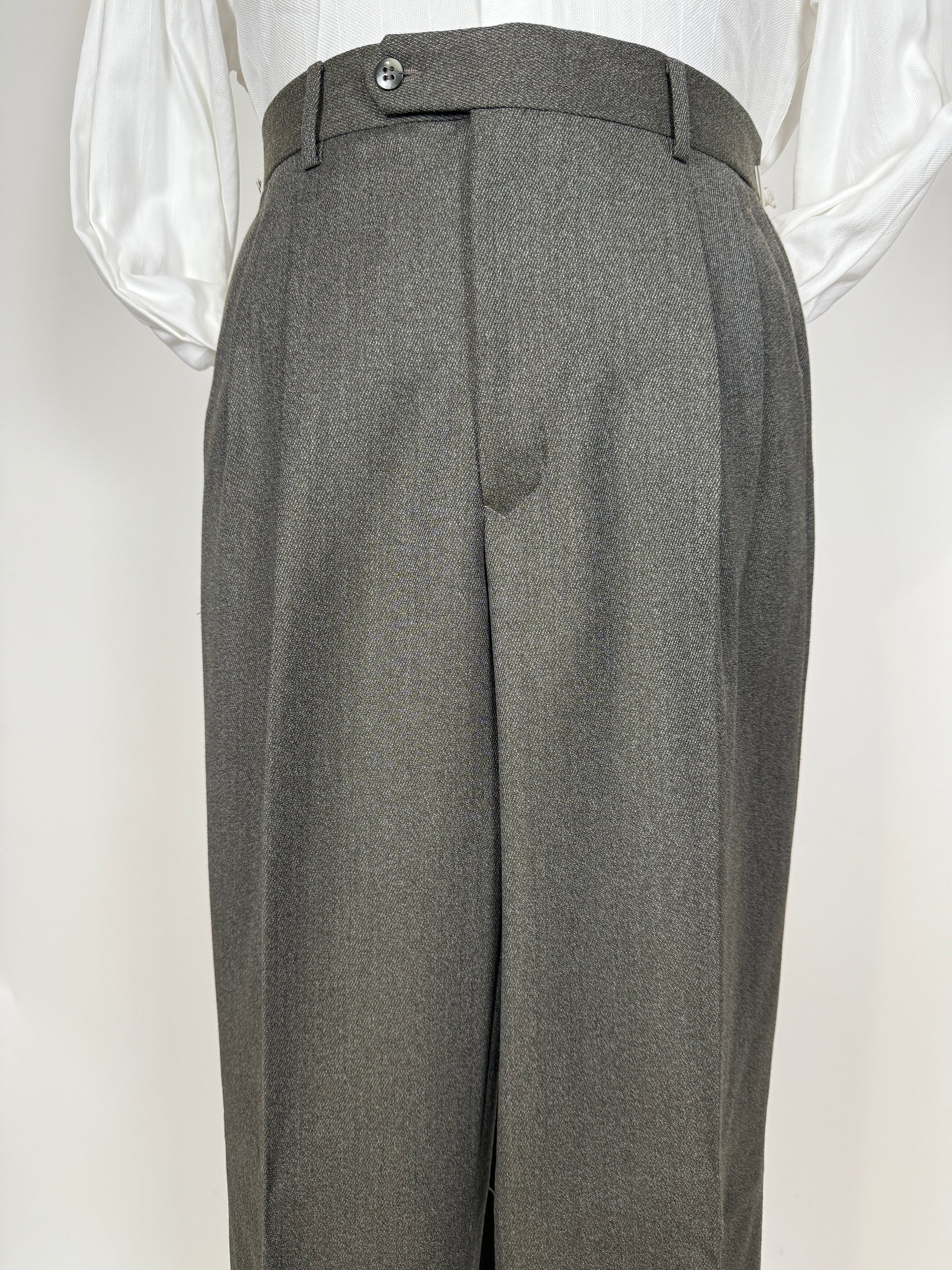 Pantaloni dal taglio classico, a vita alta e con doppie pinces. I pantaloni hanno l’orlo ancora da chiudere, il che rende l’abito adatto anche a stature più alte.