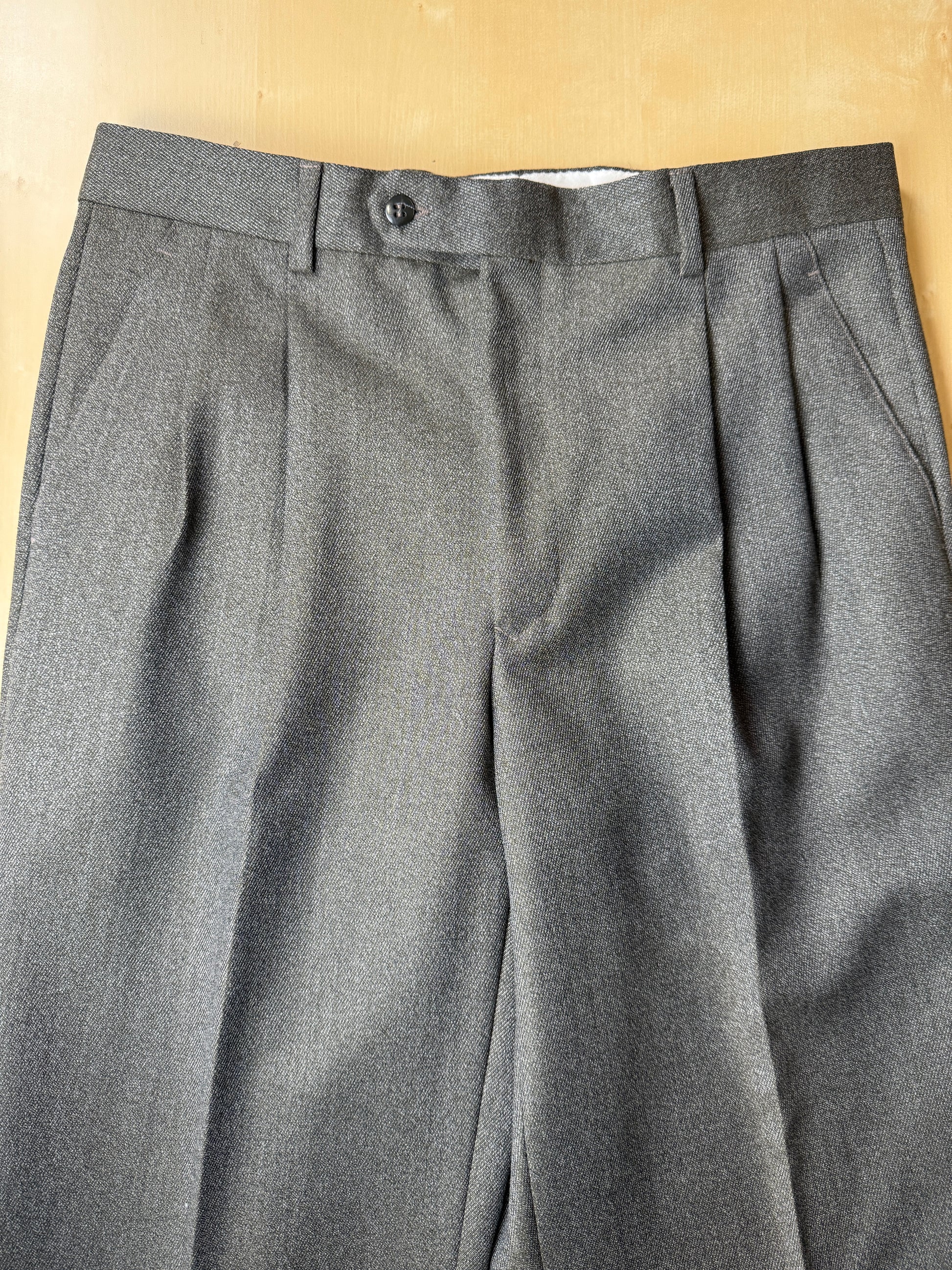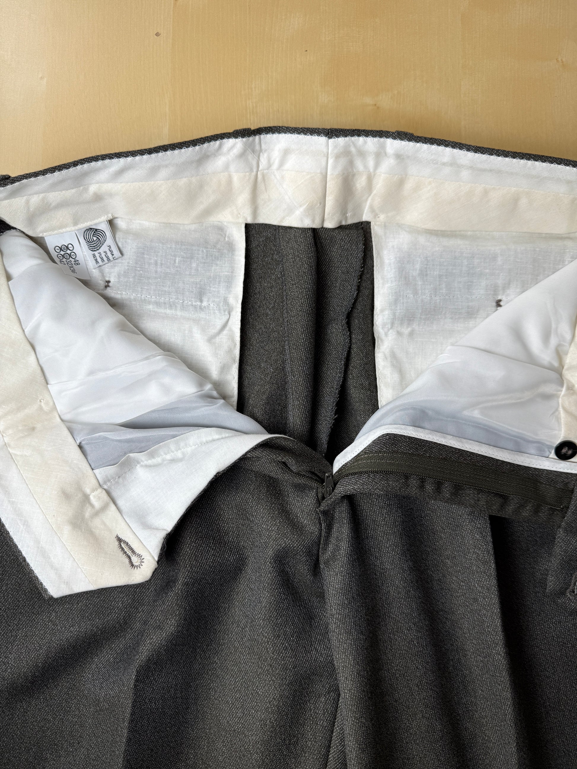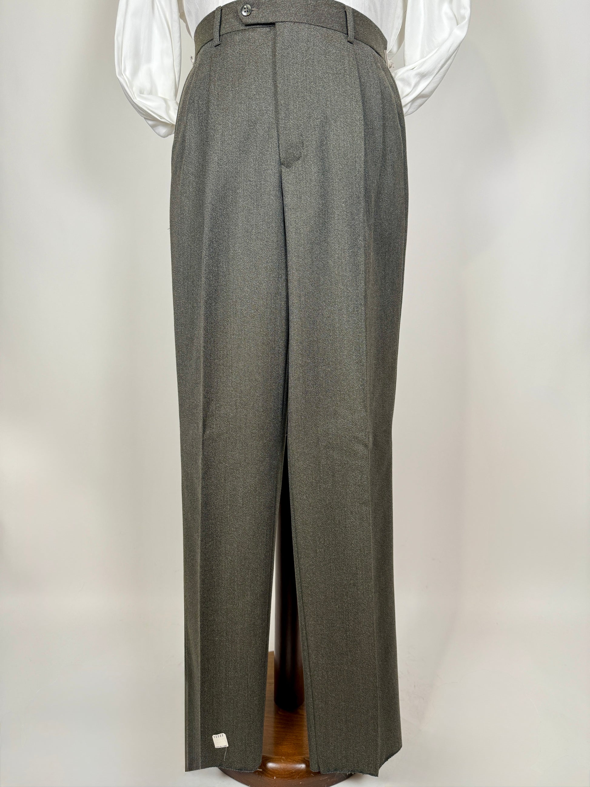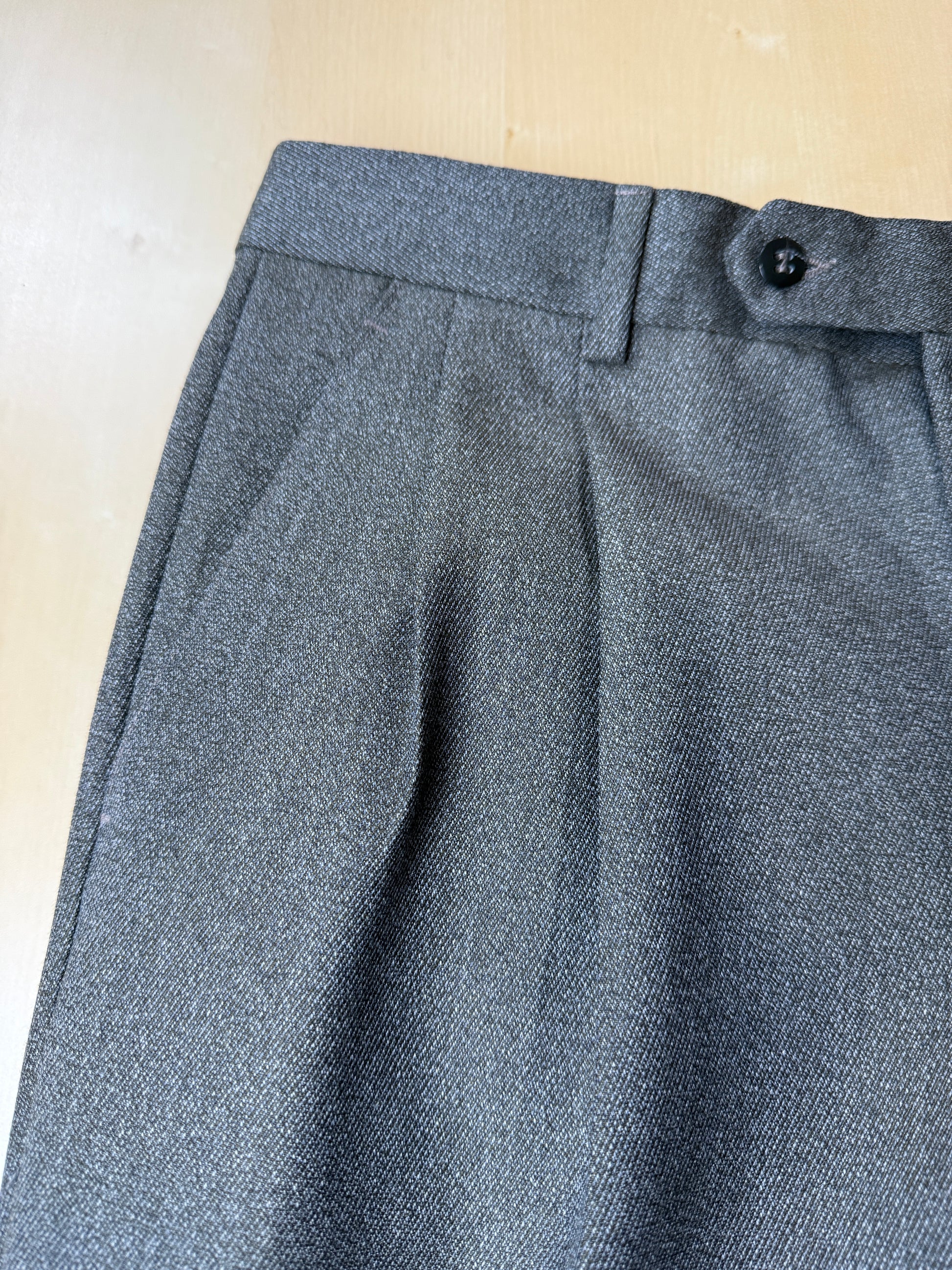 Pantaloni dal taglio classico, a vita alta e con doppie pinces. I pantaloni hanno l’orlo ancora da chiudere, il che rende l’abito adatto anche a stature più alte.