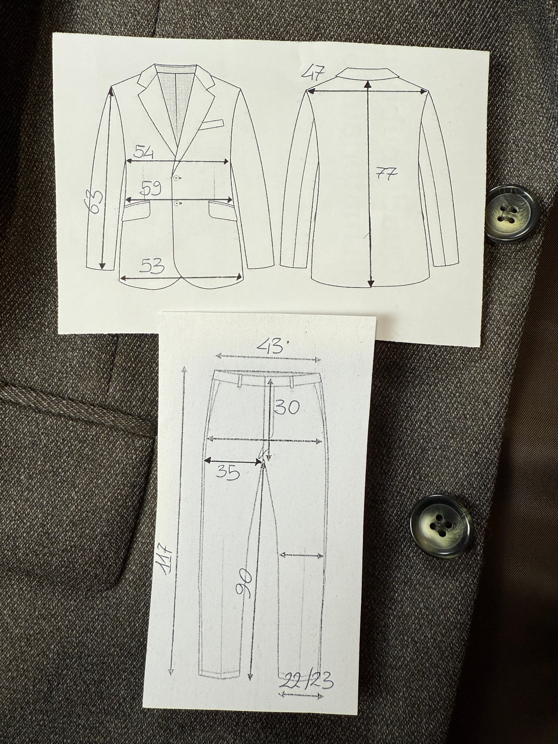 ⚠️ Per un confronto il più utile e accurato possibile, è necessario confrontare le misure solo fra abiti dal taglio simile: ad esempio, un abito dal taglio classico (giacca morbida e pantalone a vita alta) con un altro abito analogo, non con un abito slim fit o con un abito tipo anni '70 dal taglio snello e avvitato (e viceversa).