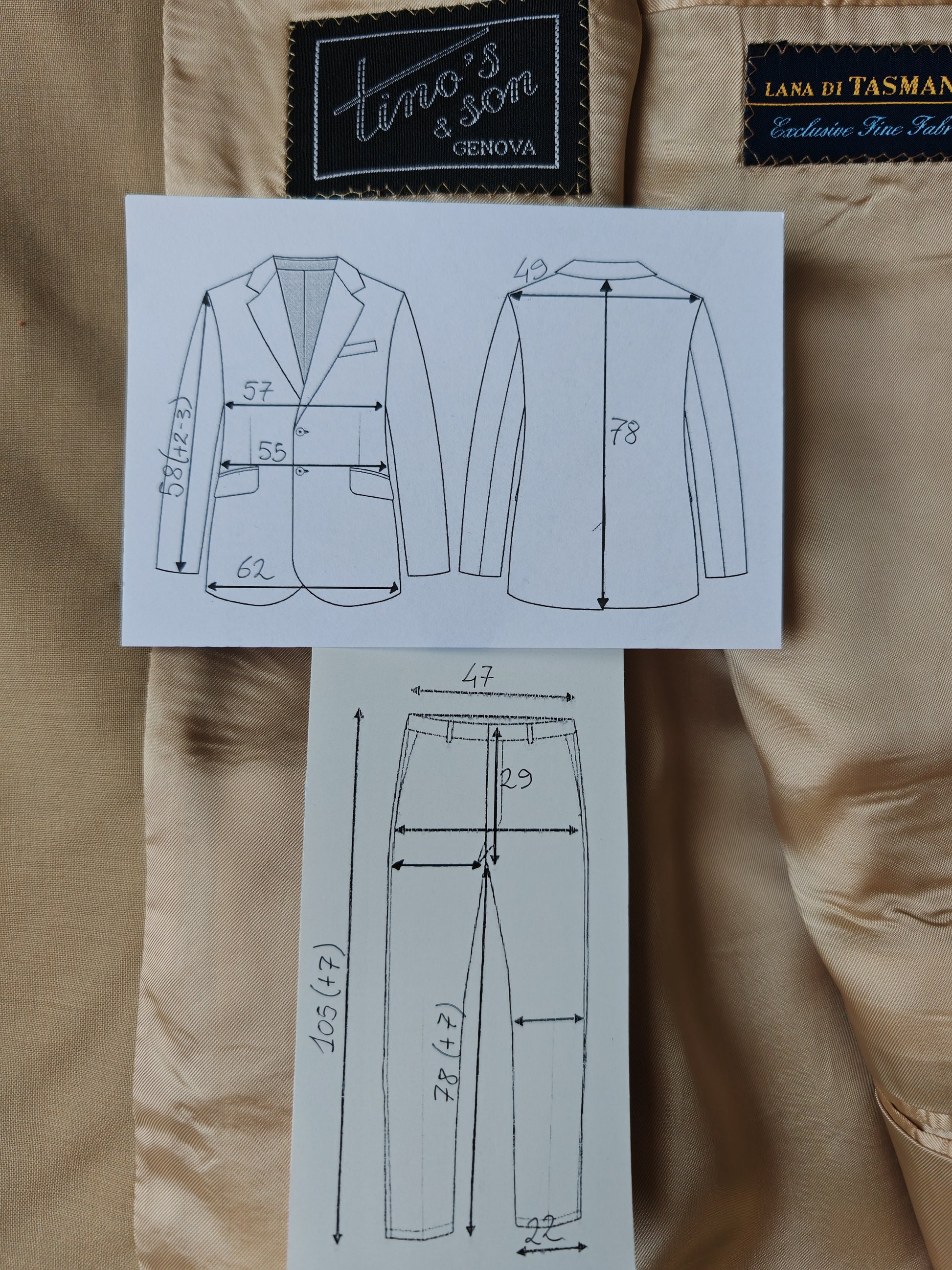 Taglia 52 statura corta. Vedere le misure in cm nell'ultima foto,con particolare attenzione alla lunghezza delle maniche che risulta in proporzione piuttosto corta (58 cm). C'è comunque margine di stoffa per allungare le maniche di un paio di cm.