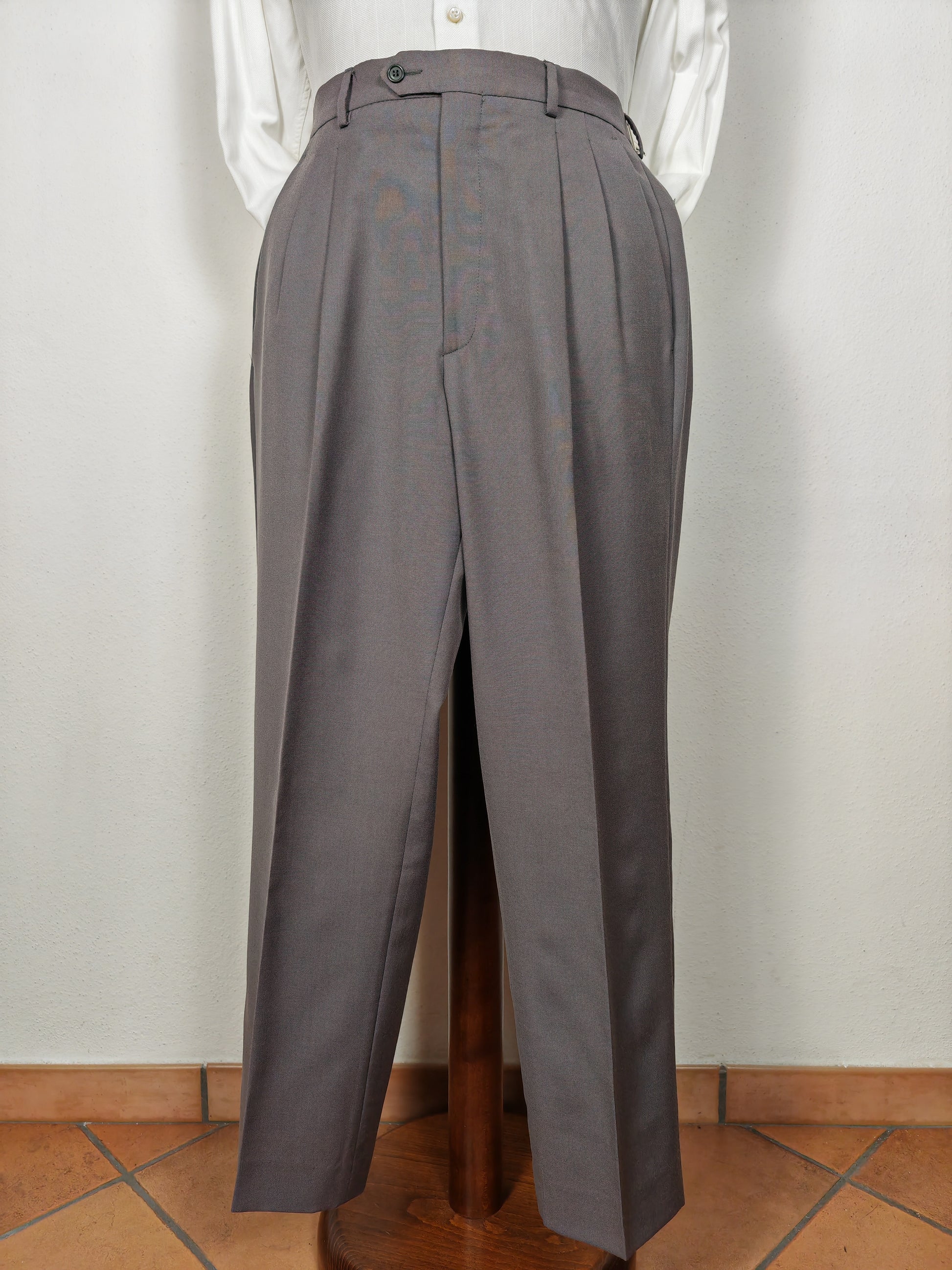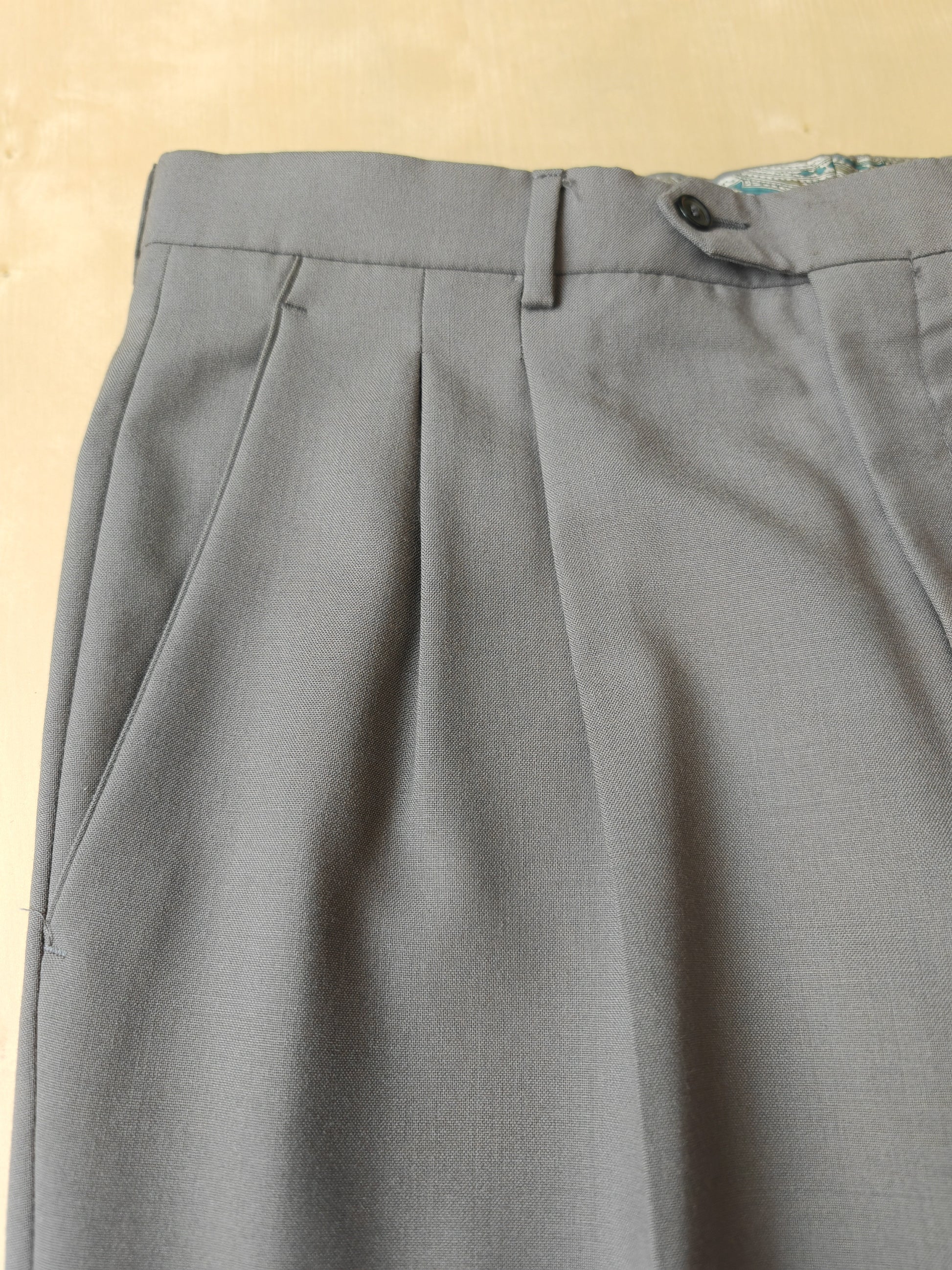 Completo di tipica confezione anni '80 in tela fresco lana 100%. Bel colore a metà tra il verde salvia/petrolio e il grigio.
