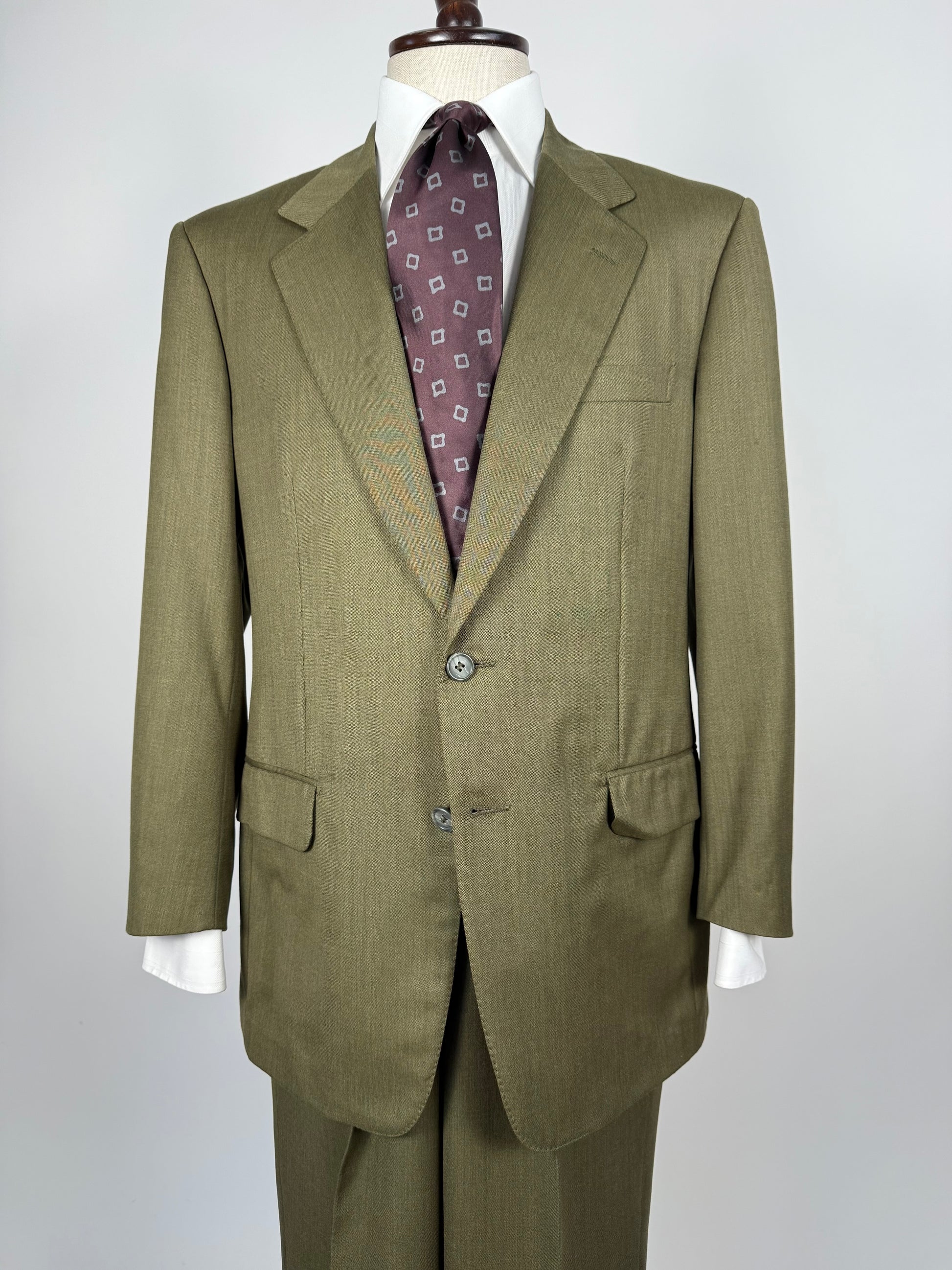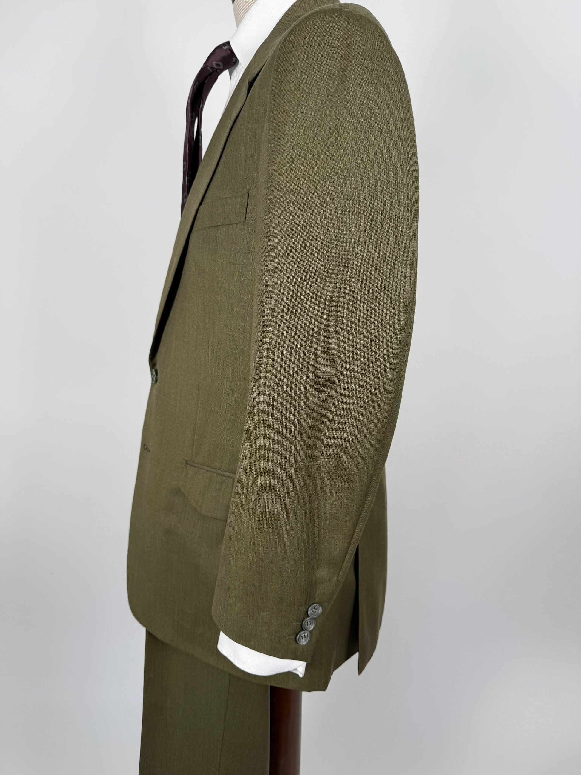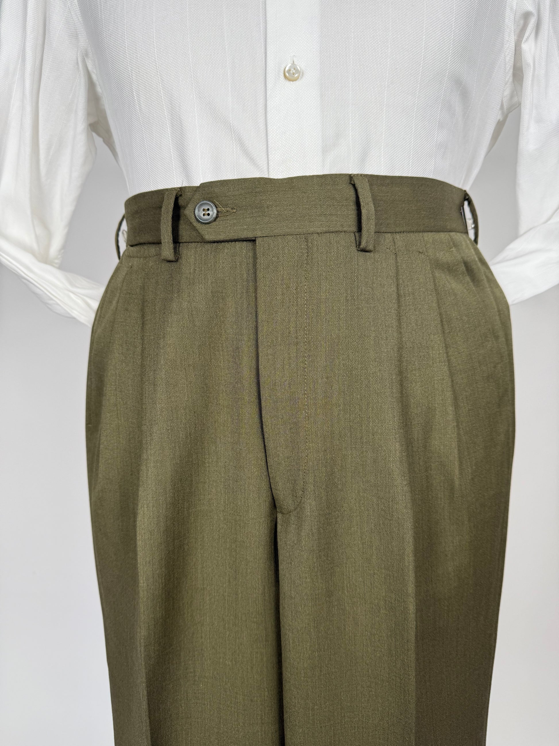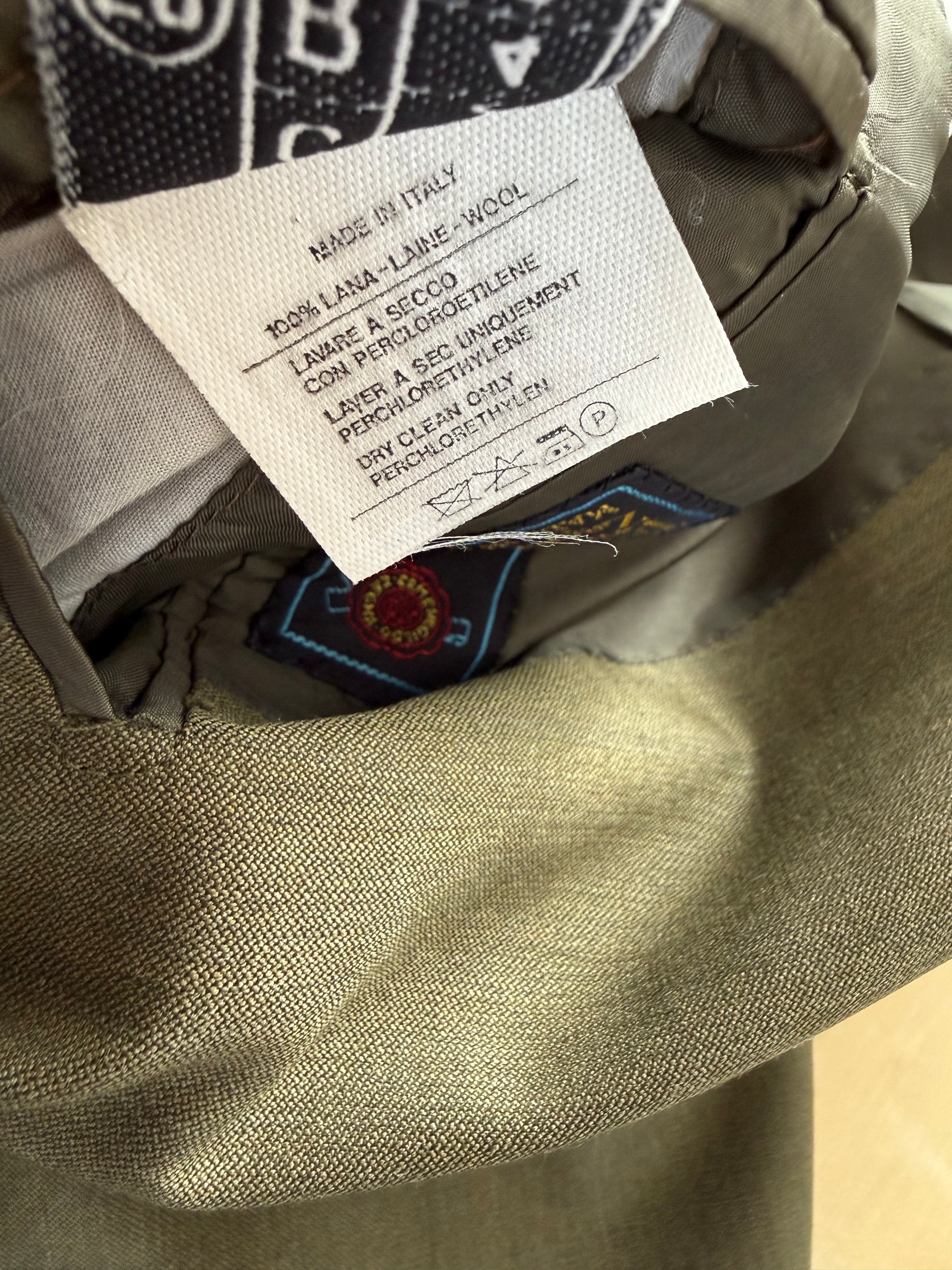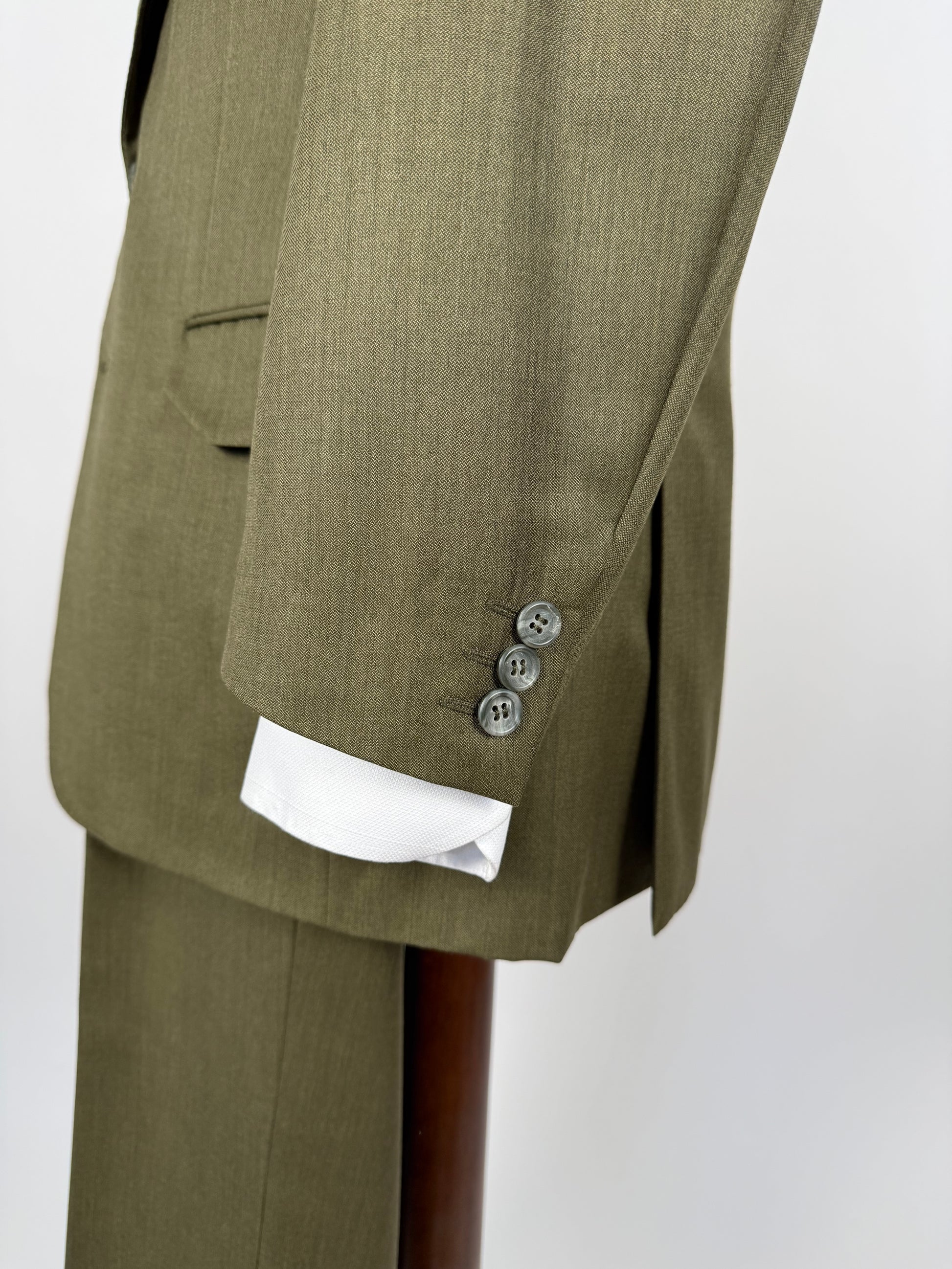 Abito di ottima confezione anni ‘80 Zanolini, confezionato con un tessuto Ermenegildo Zegna in 100% lana pettinata di un bellissimo verde oliva.