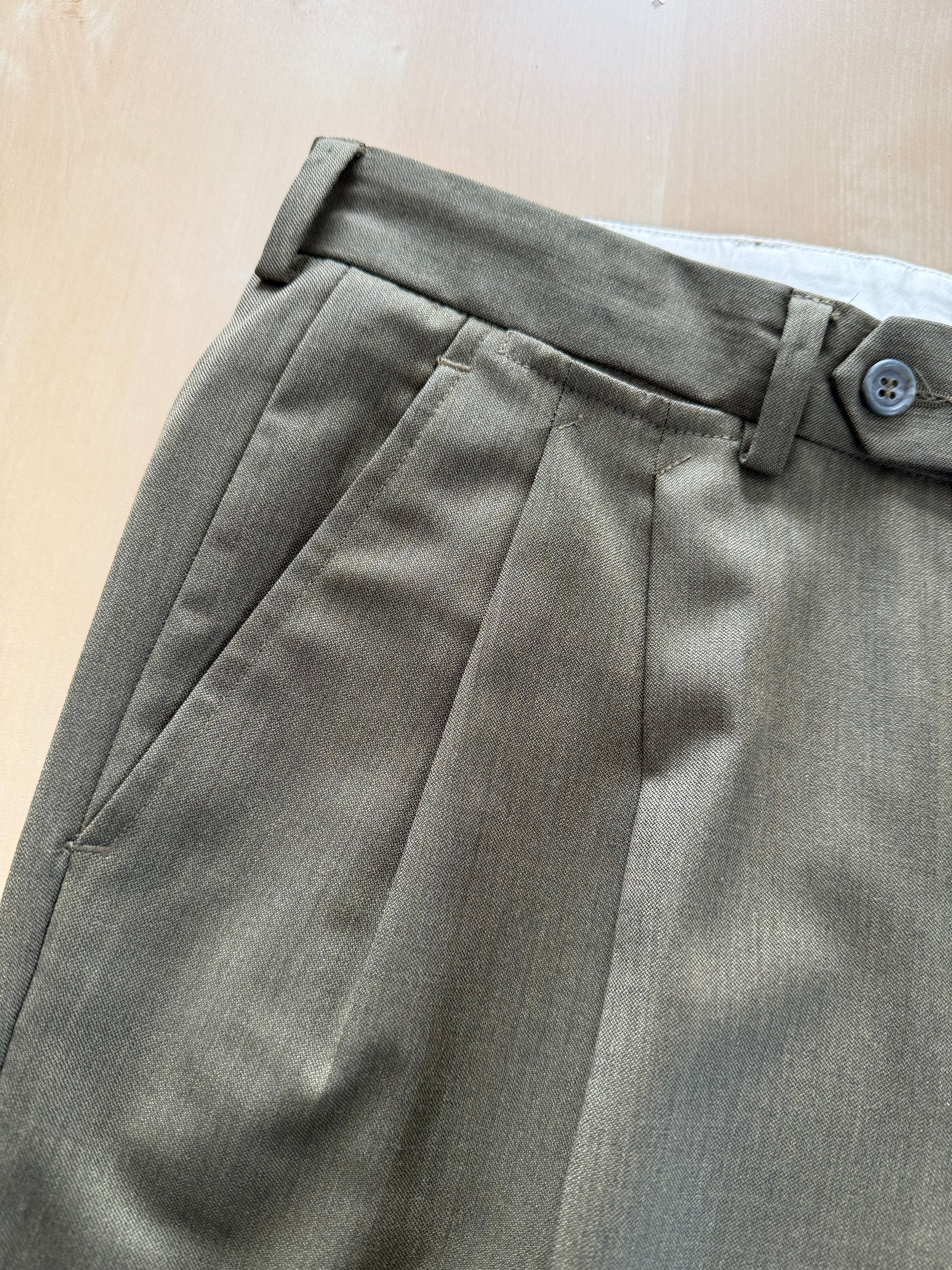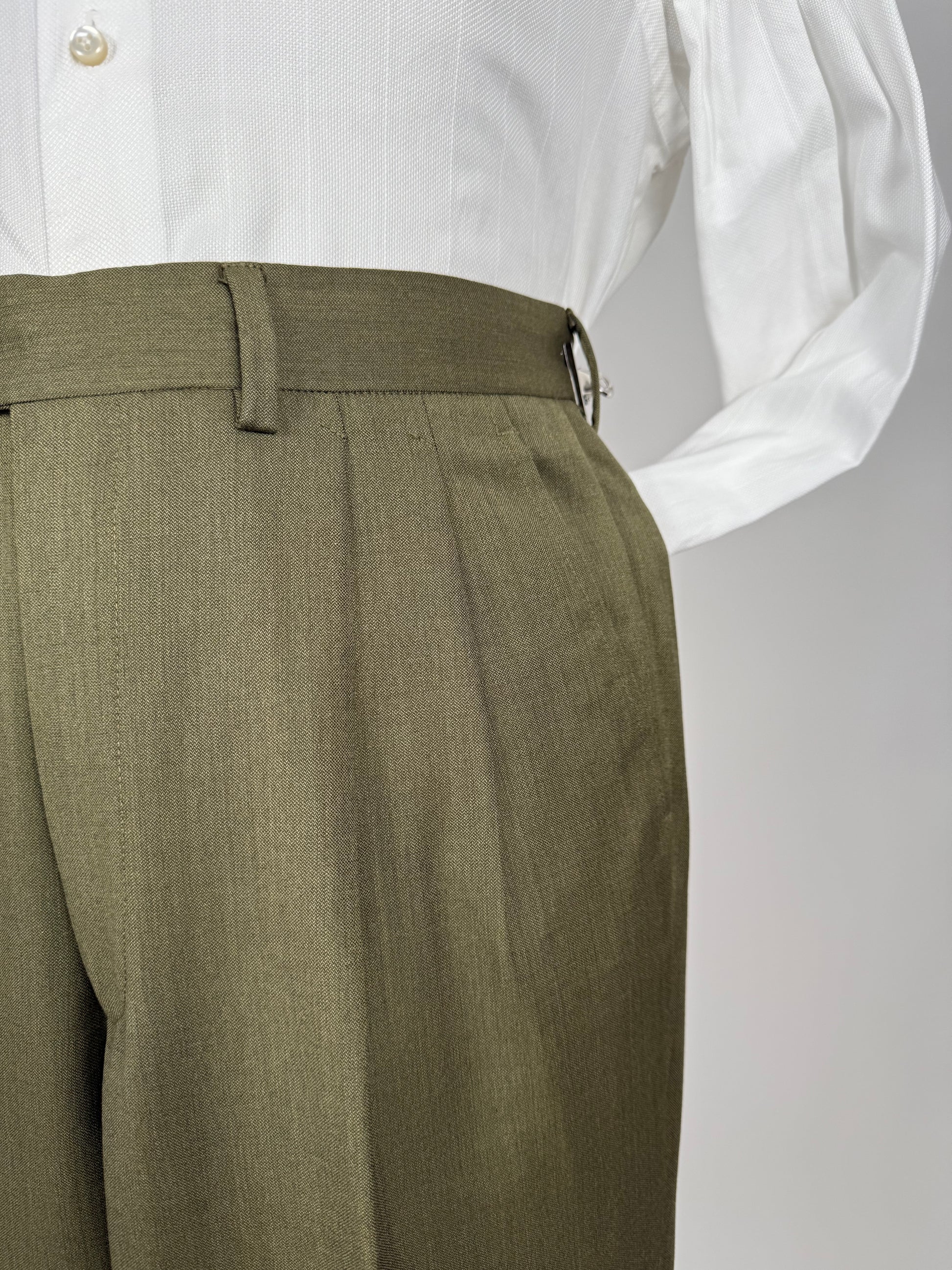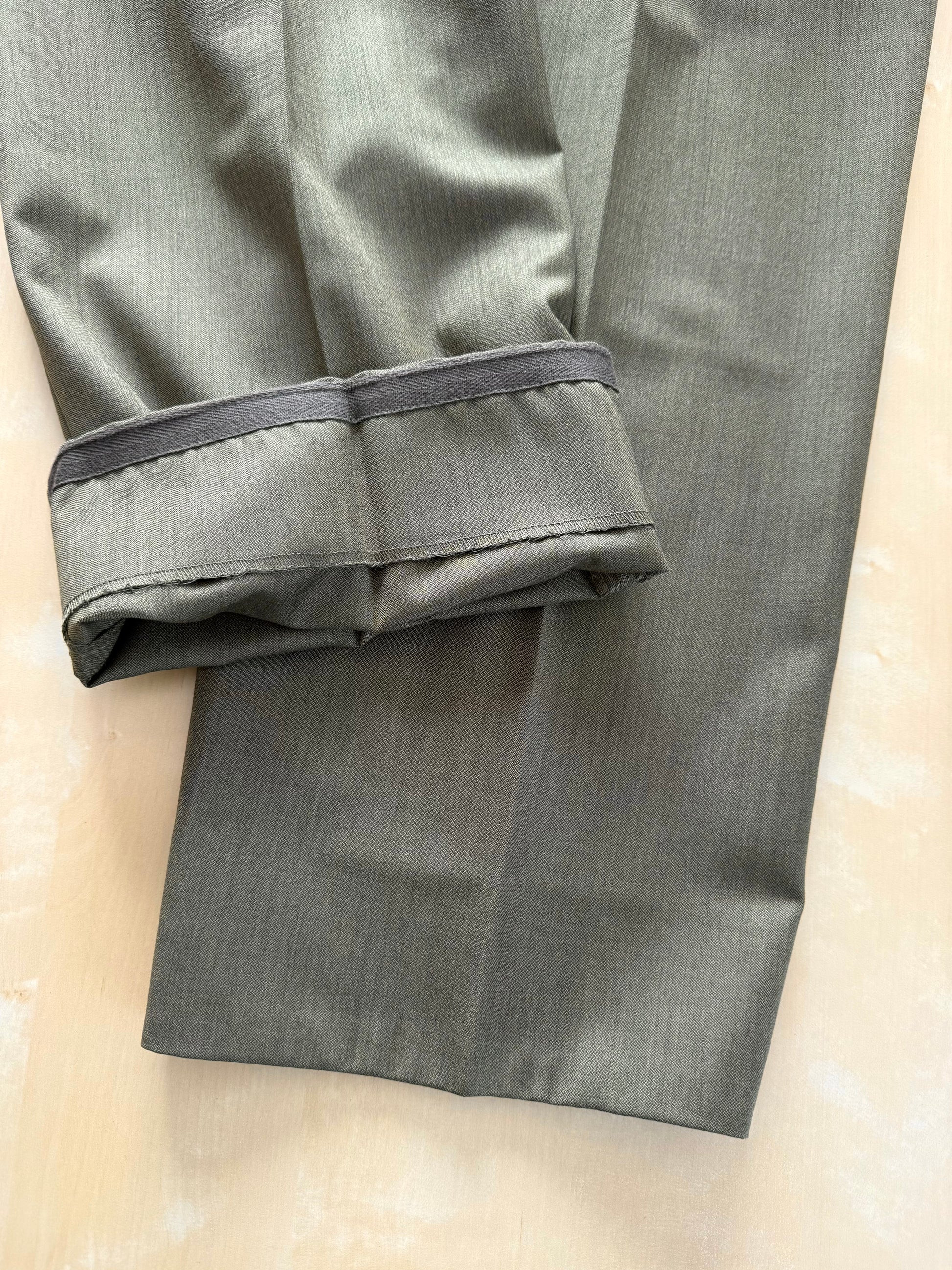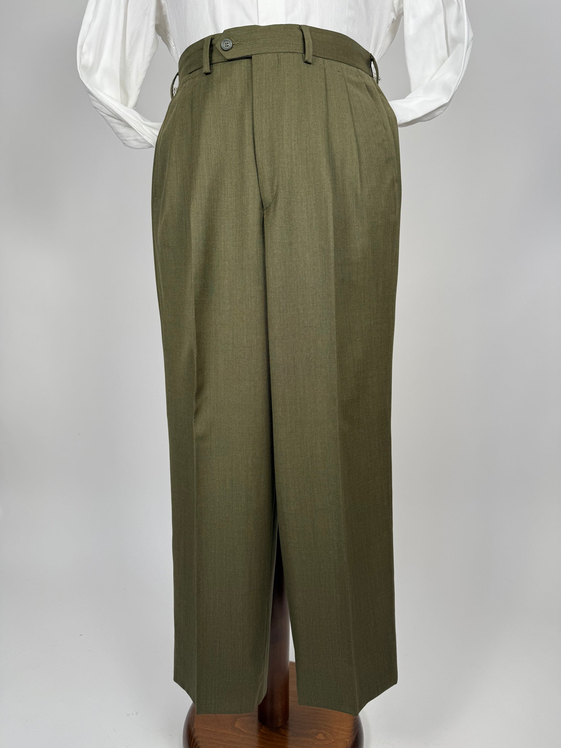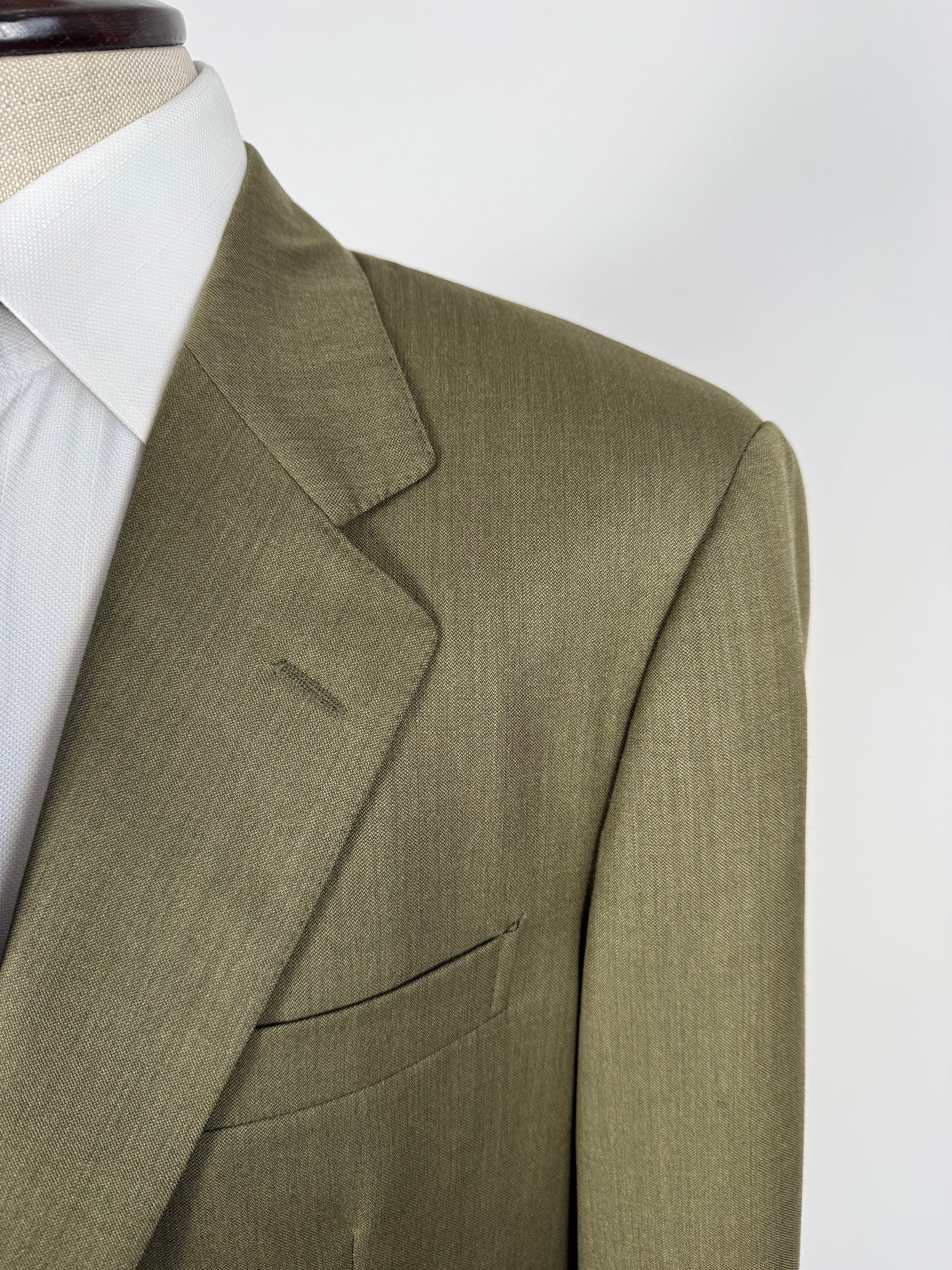 Abito di ottima confezione anni ‘80 Zanolini, confezionato con un tessuto Ermenegildo Zegna in 100% lana pettinata di un bellissimo verde oliva.