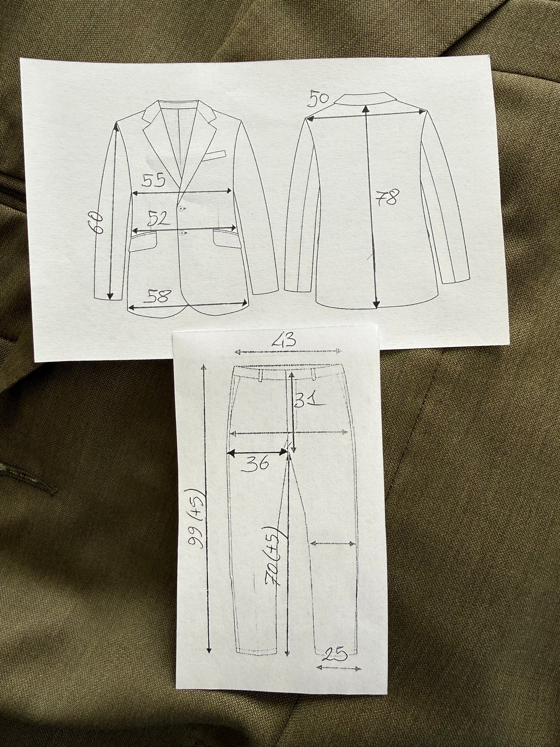⚠️ Per un confronto il più utile e accurato possibile, è necessario confrontare le misure solo fra abiti dal taglio simile: ad esempio, un abito dal taglio classico (giacca morbida e pantalone a vita alta) con un altro abito analogo, non con un abito slim fit o con un abito tipo anni '70 dal taglio snello e avvitato (e viceversa).