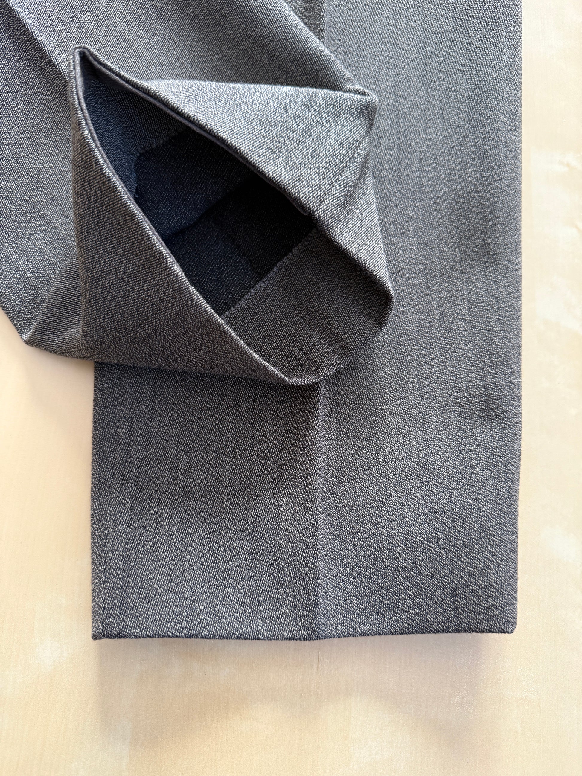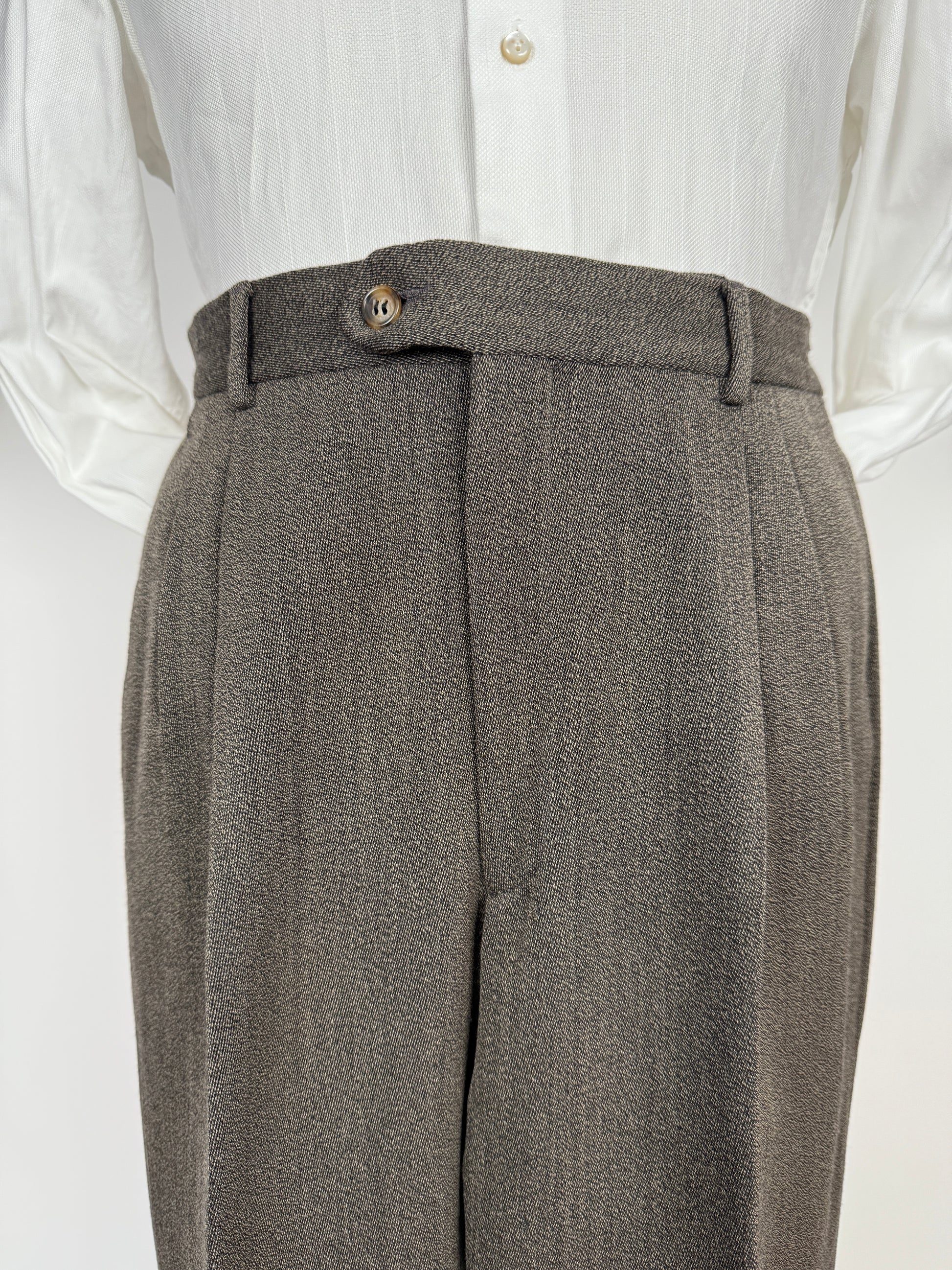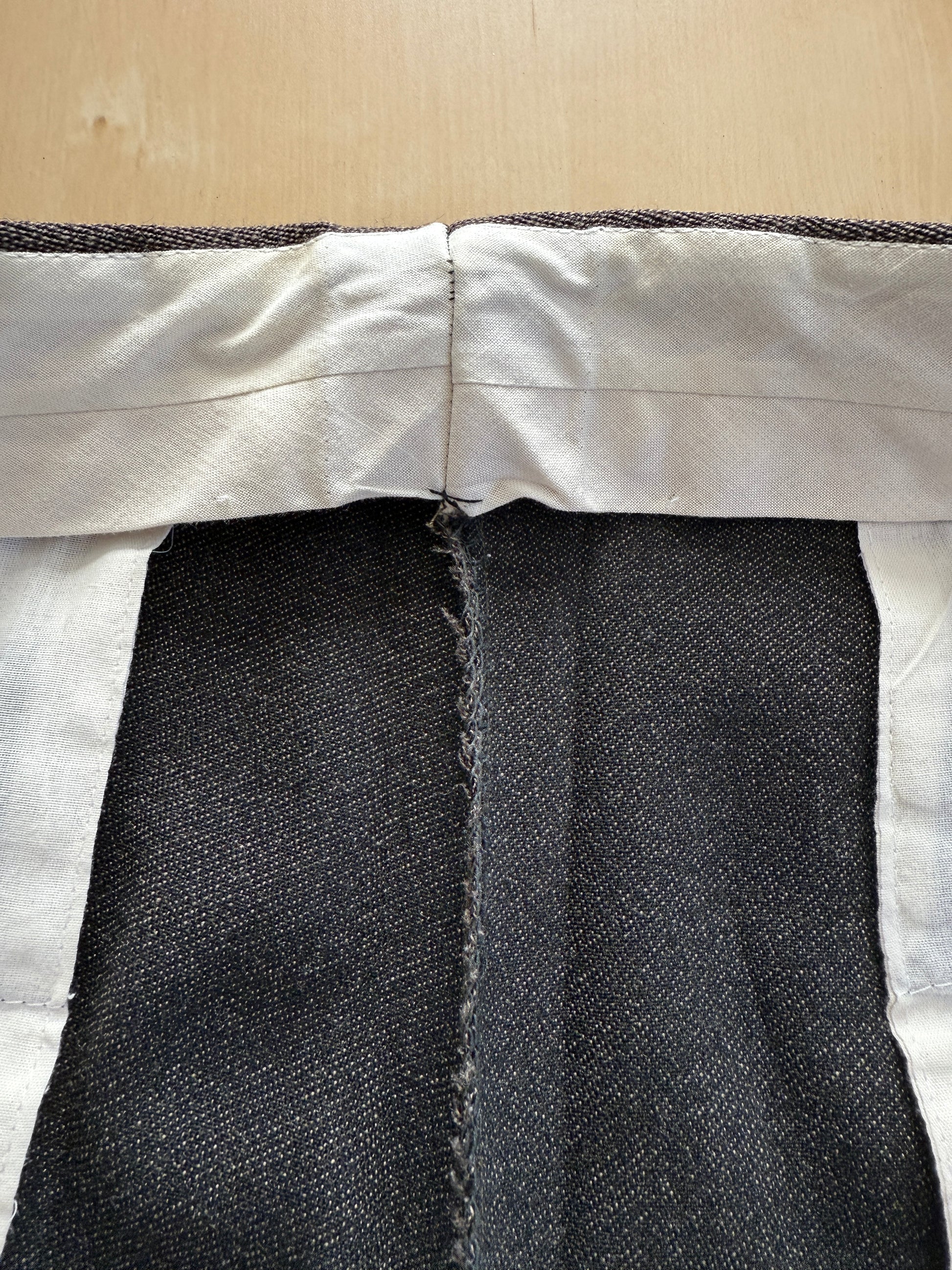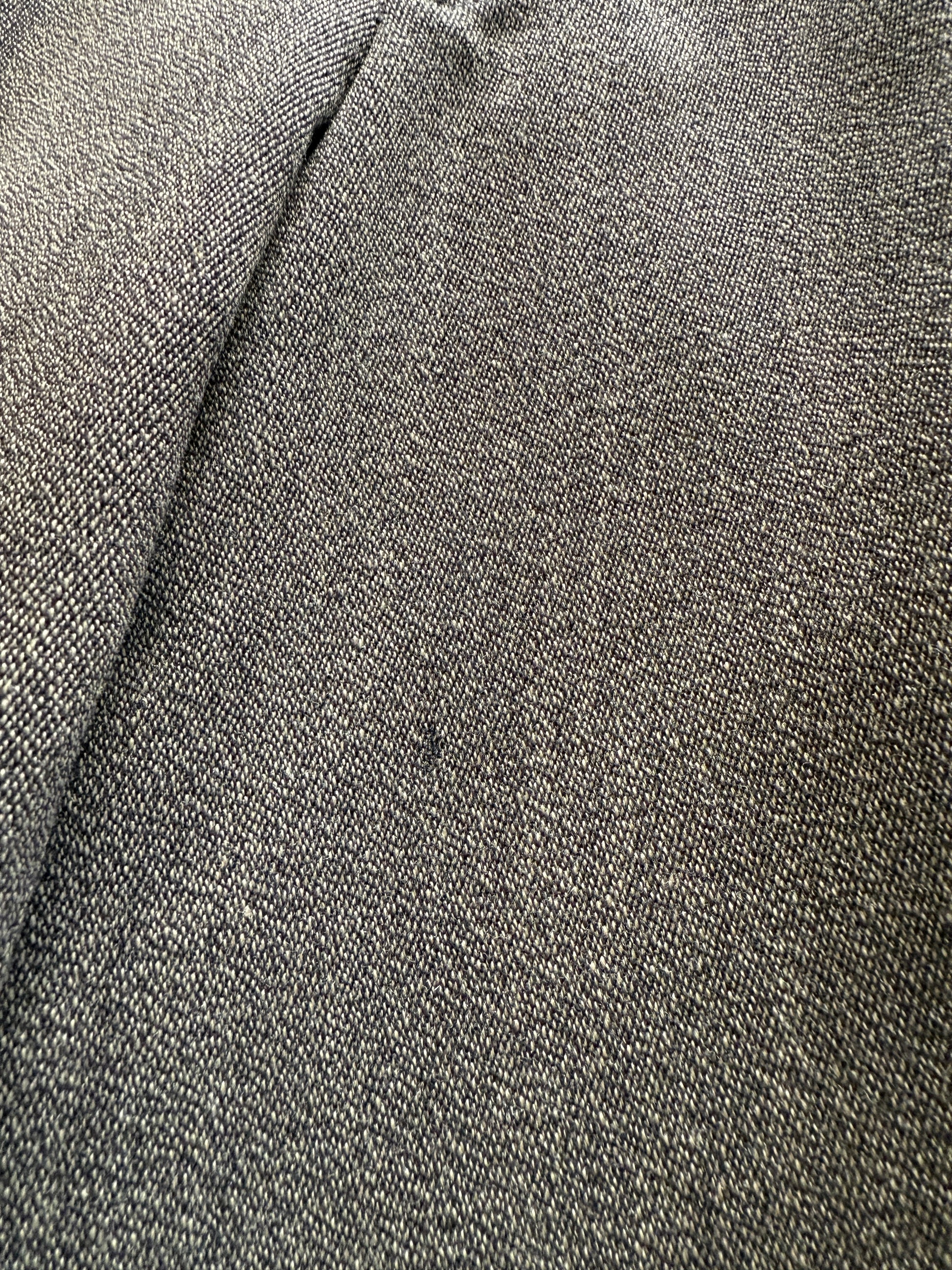 L‘abito veste una taglia 48/50: da segnalare che le misure attuali del pantalone sono frutto di una modifica (ben eseguita) in allargamento, perciò non c’è margine di stoffa per allargare il pantalone ulteriormente.