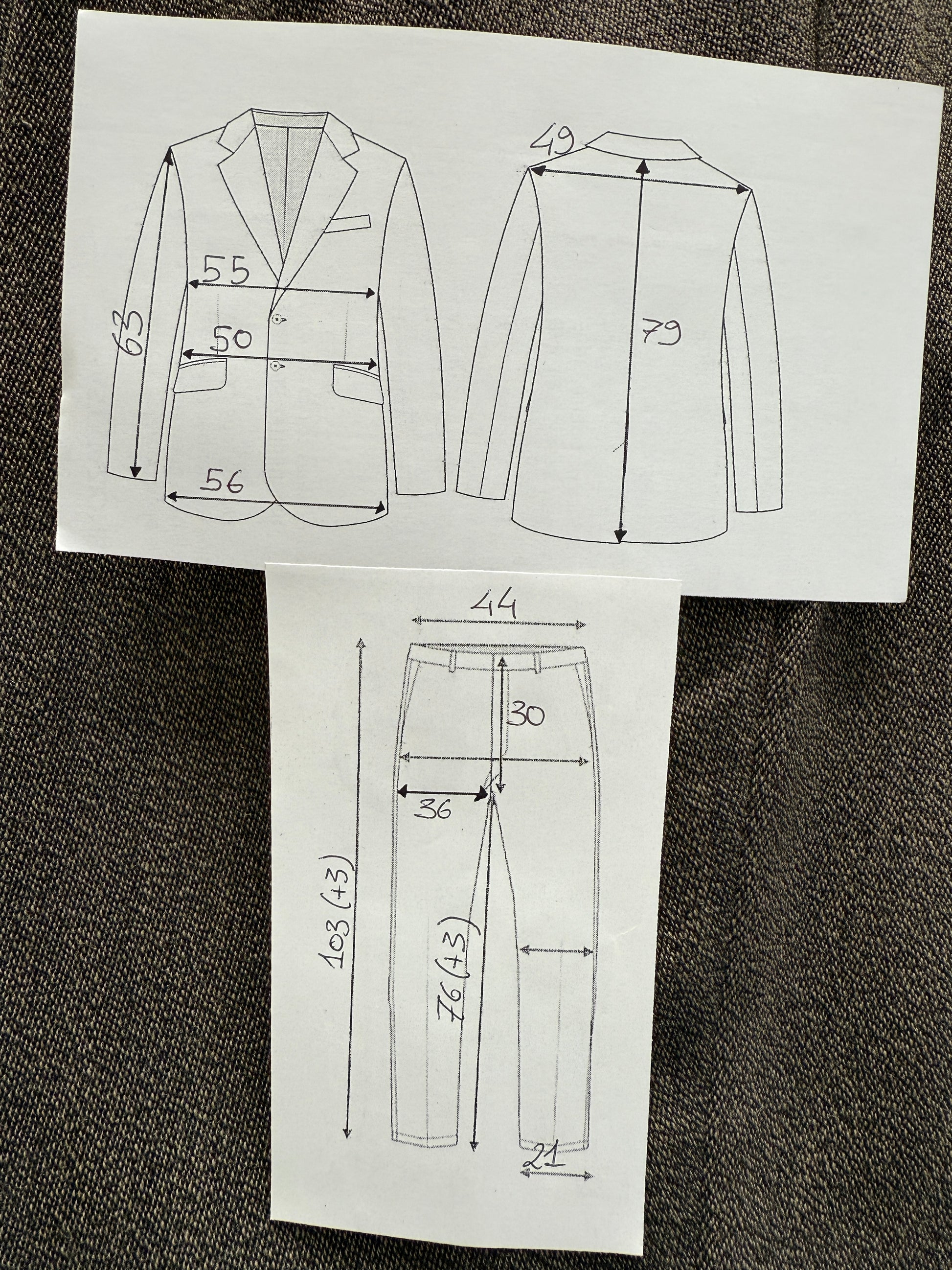 ⚠️ Per un confronto il più utile e accurato possibile, è necessario confrontare le misure solo fra abiti dal taglio simile: ad esempio, un abito dal taglio classico (giacca morbida e pantalone a vita alta) con un altro abito analogo, non con un abito slim fit o con un abito tipo anni '70 dal taglio snello e avvitato (e viceversa).