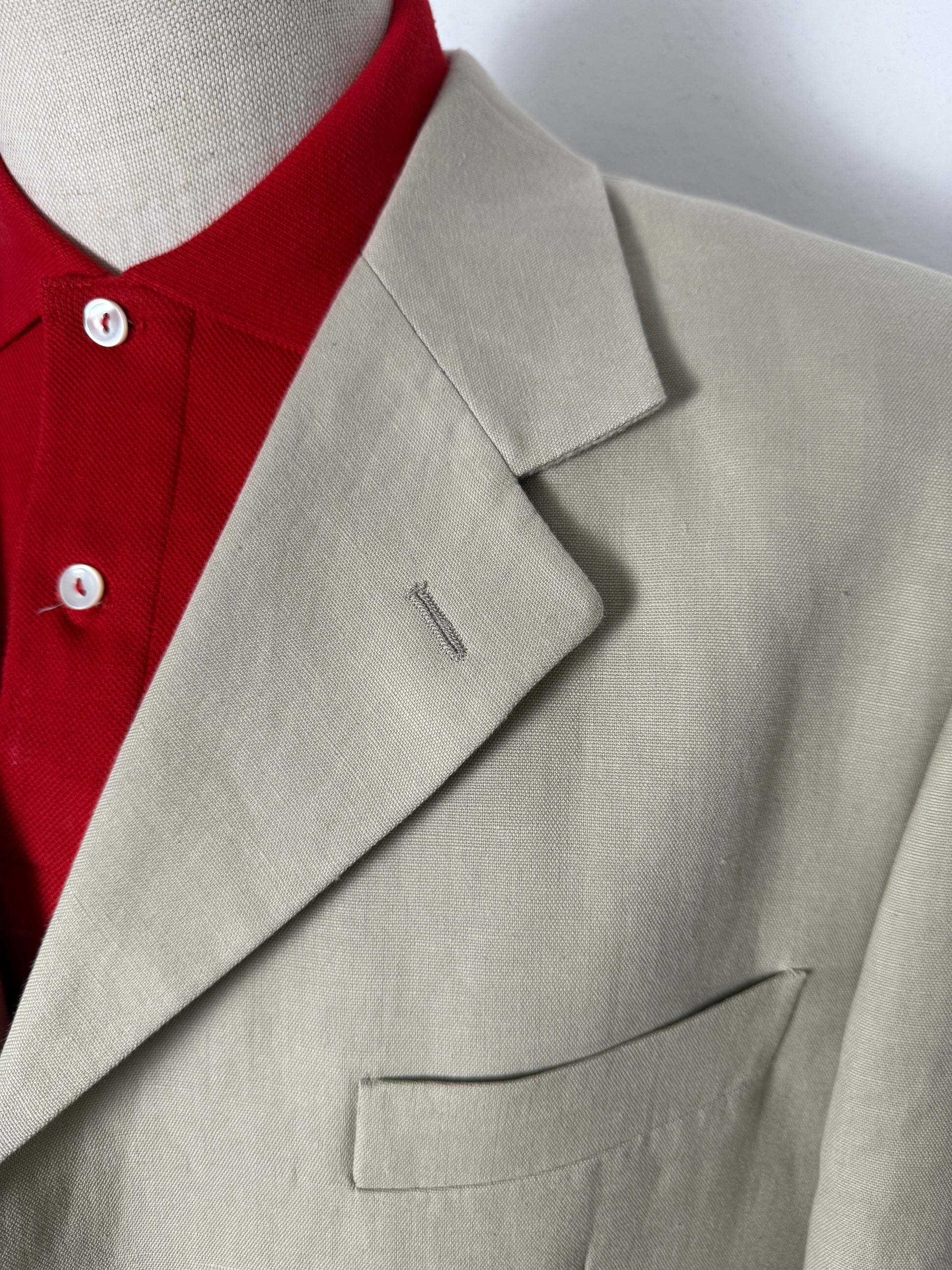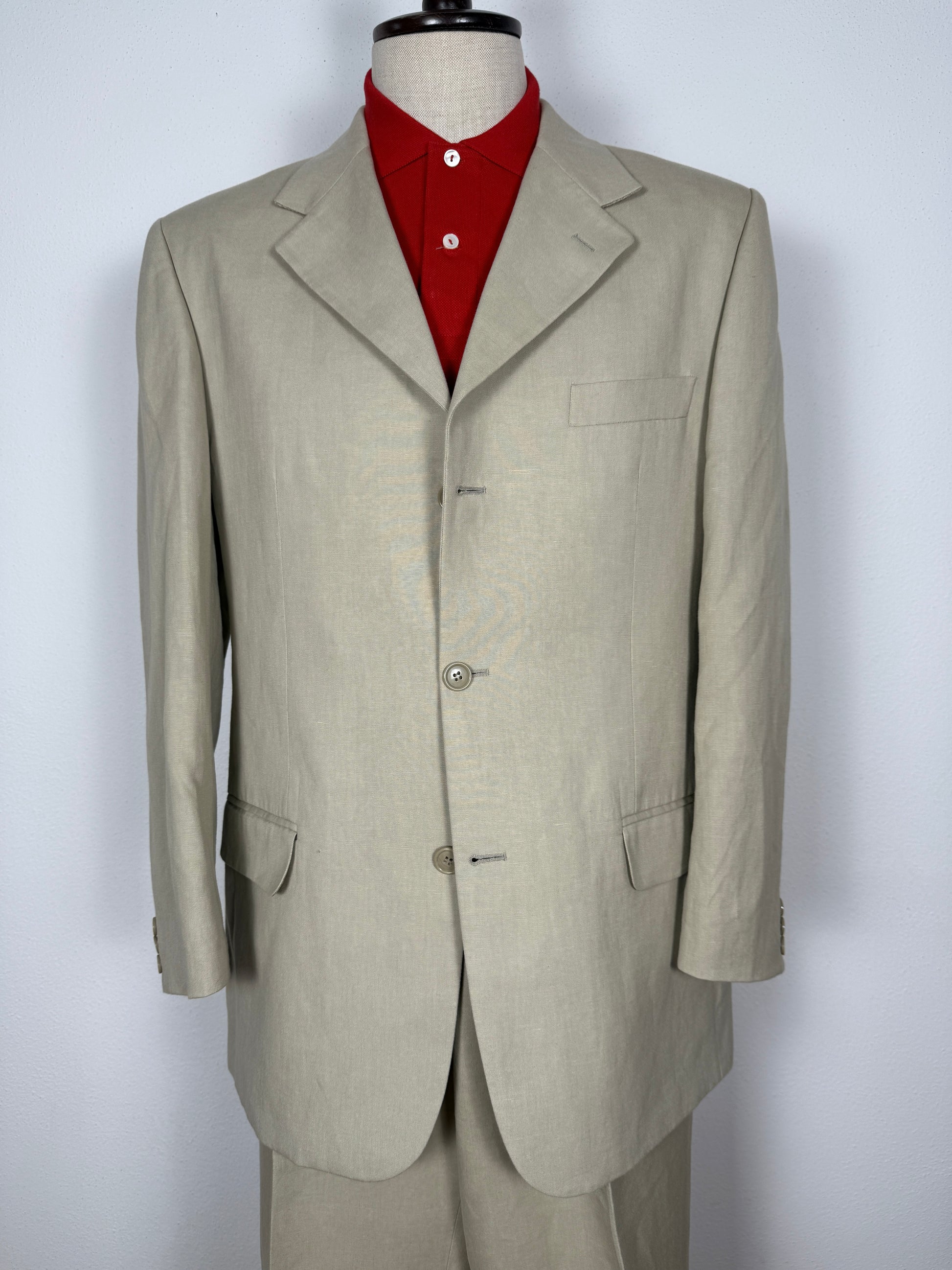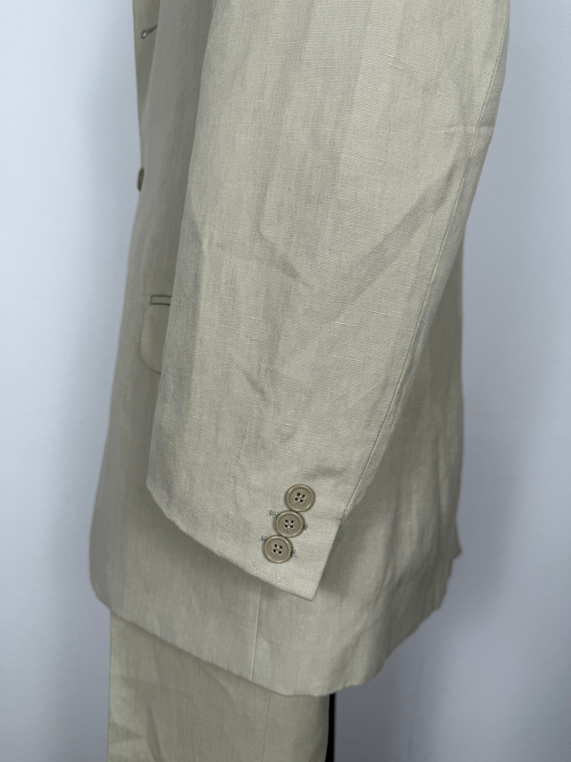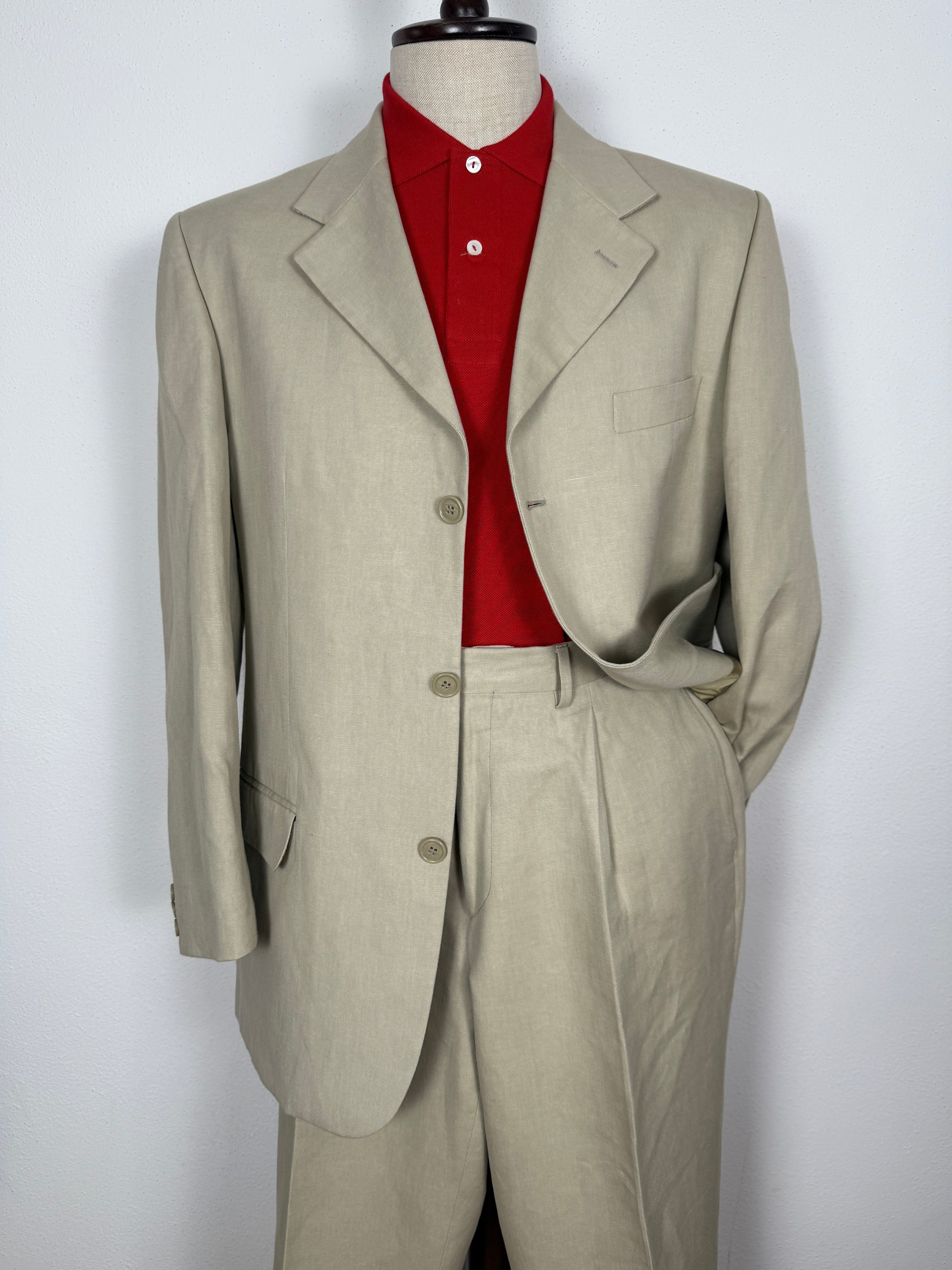 L'abito è interamente foderato ma molto leggero. Taglia indicata 52, che riflette bene le misure dell'abito, anche se il pantalone veste piuttosto fra la 50 e la 52 (45 cm in vita).