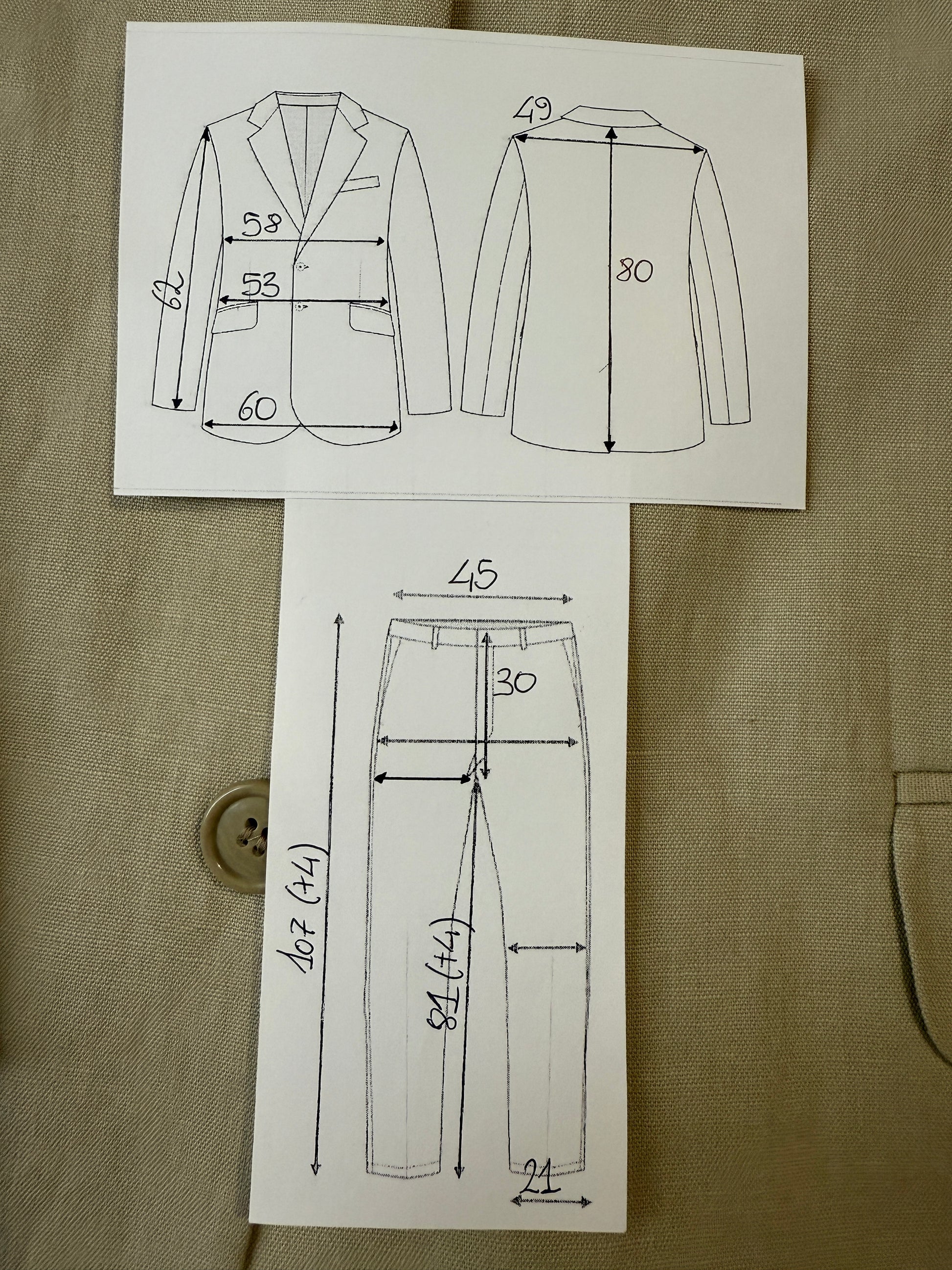 ⚠️ Per un confronto il più utile e accurato possibile, è necessario confrontare le misure solo fra abiti dal taglio simile: ad esempio, un abito dal taglio classico (giacca morbida e pantalone a vita alta) con un altro abito analogo, non con un abito slim fit o con un abito tipo anni '70 dal taglio snello e avvitato (e viceversa).