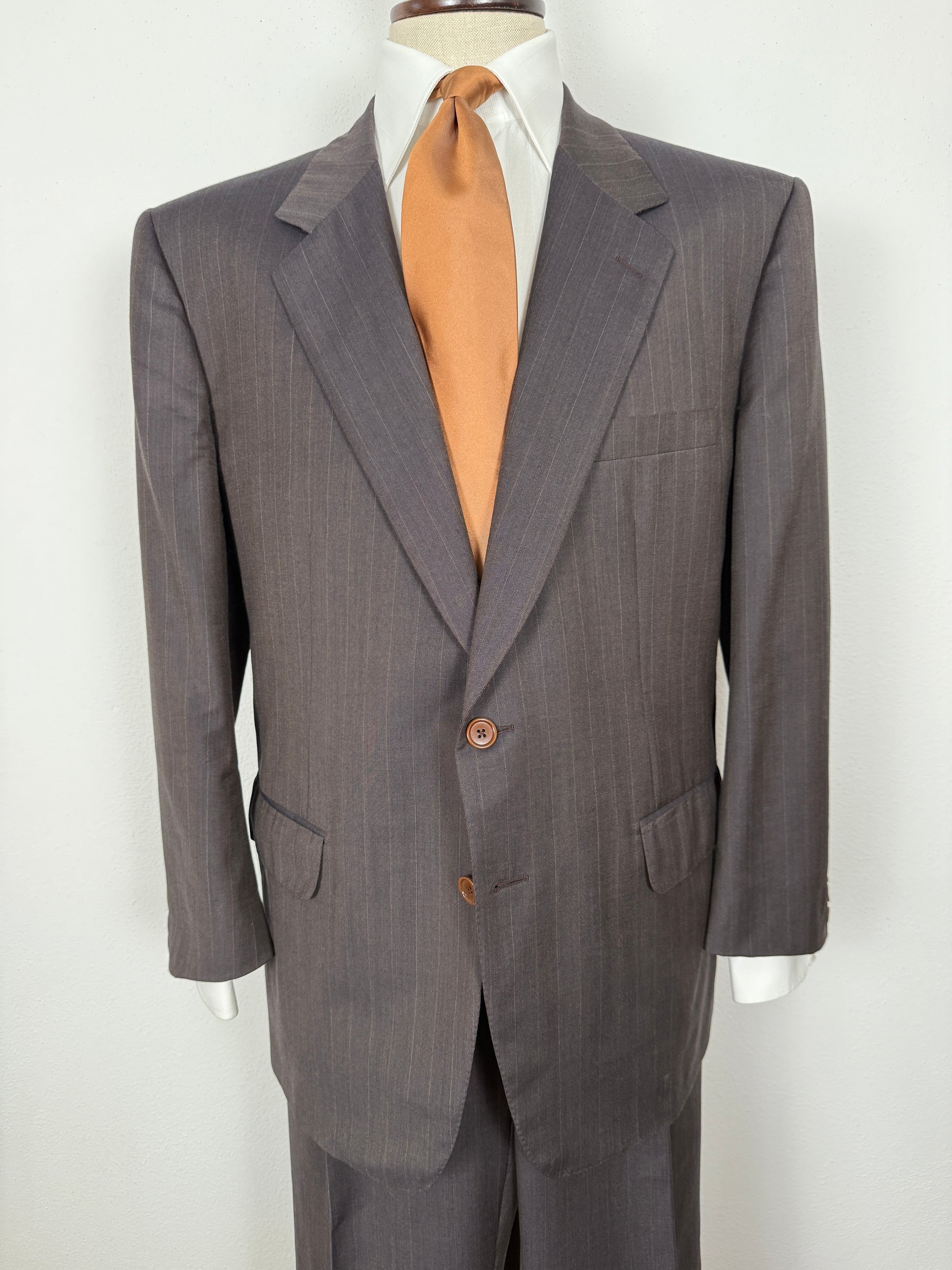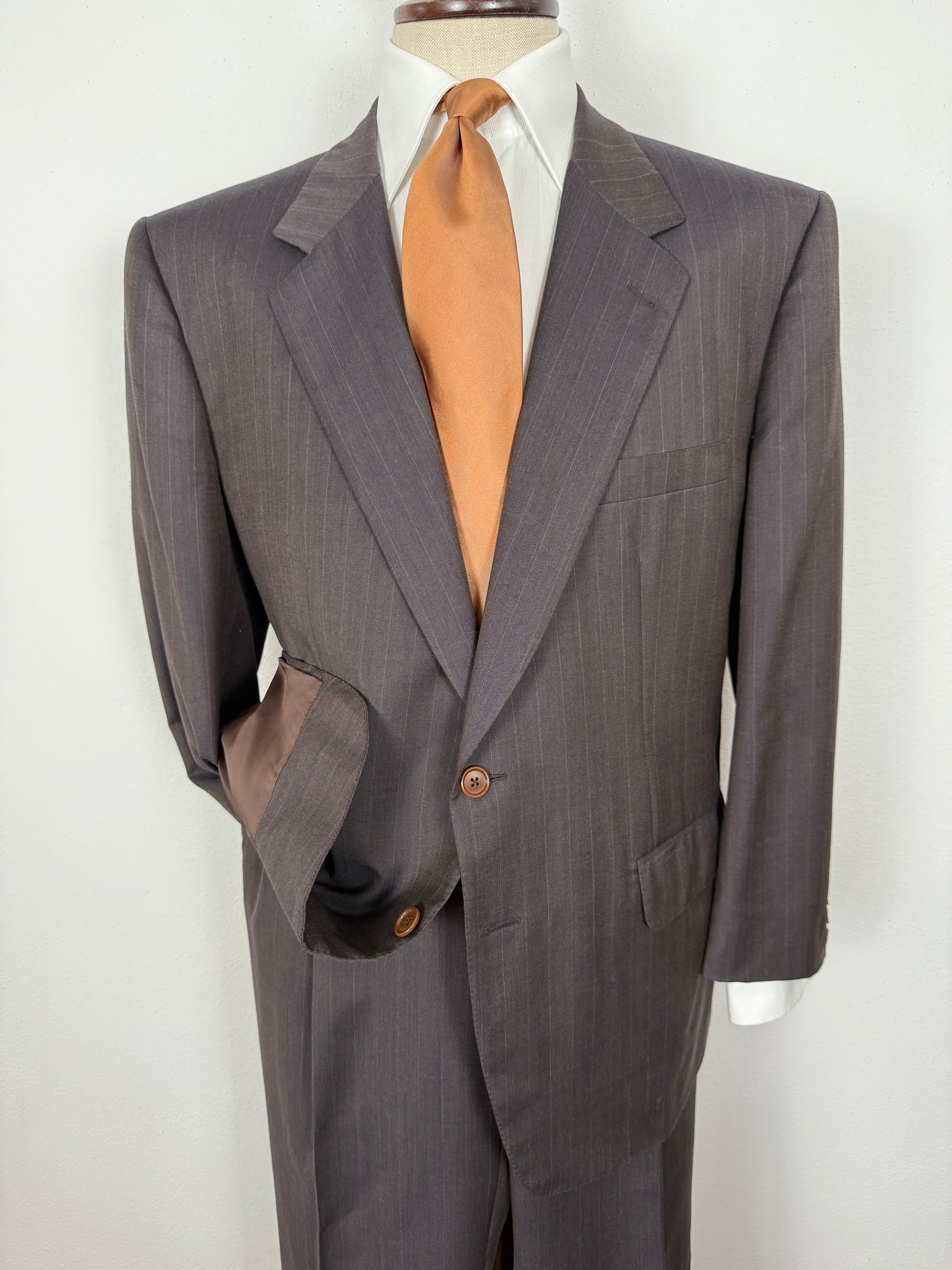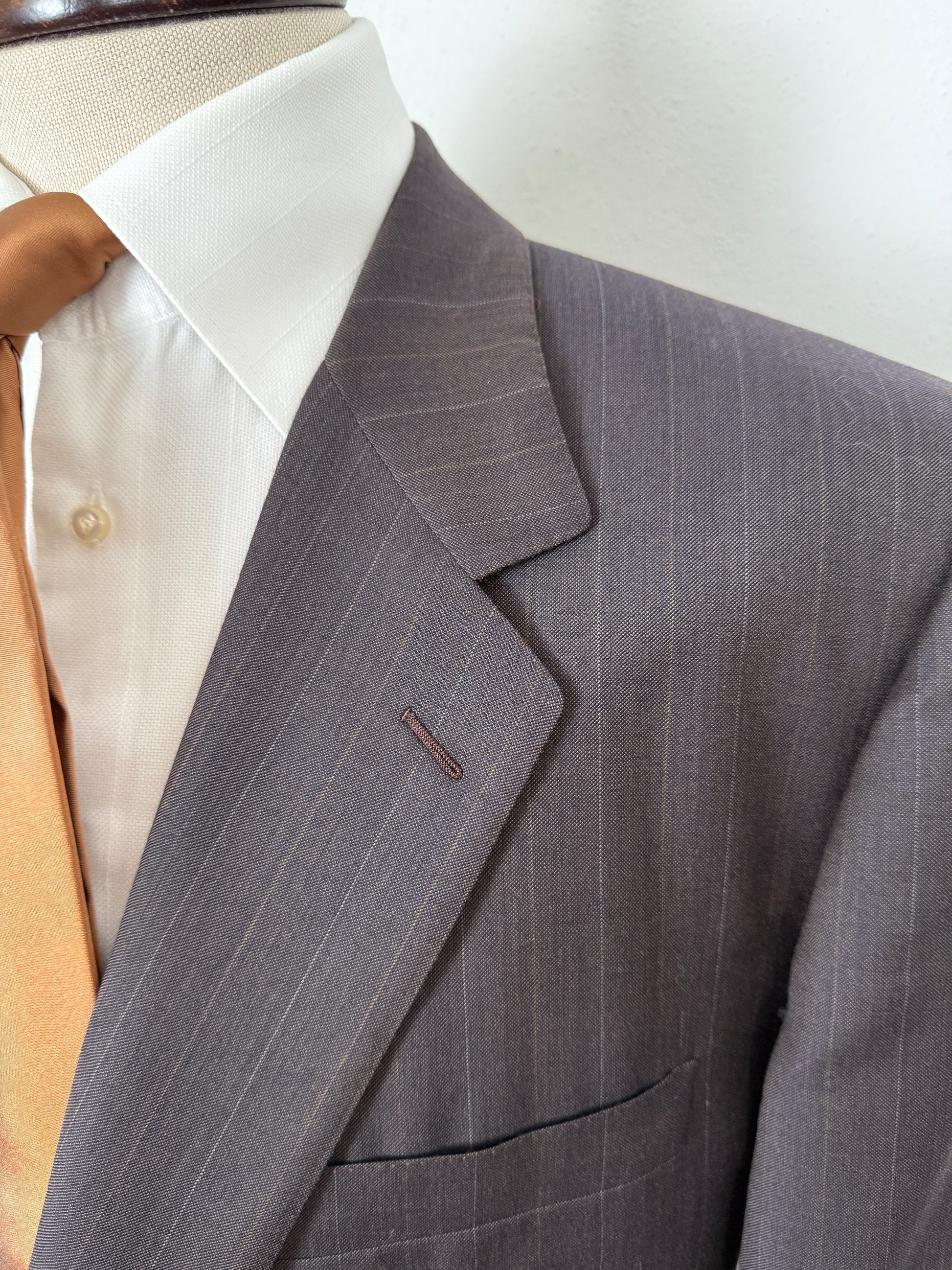 Abito di eccellente confezione Belvest, in lana pettinata leggera colore marrone scuro gessato. Tessuto appena un po' più pesante di un classico fresco lana a tela estivo.