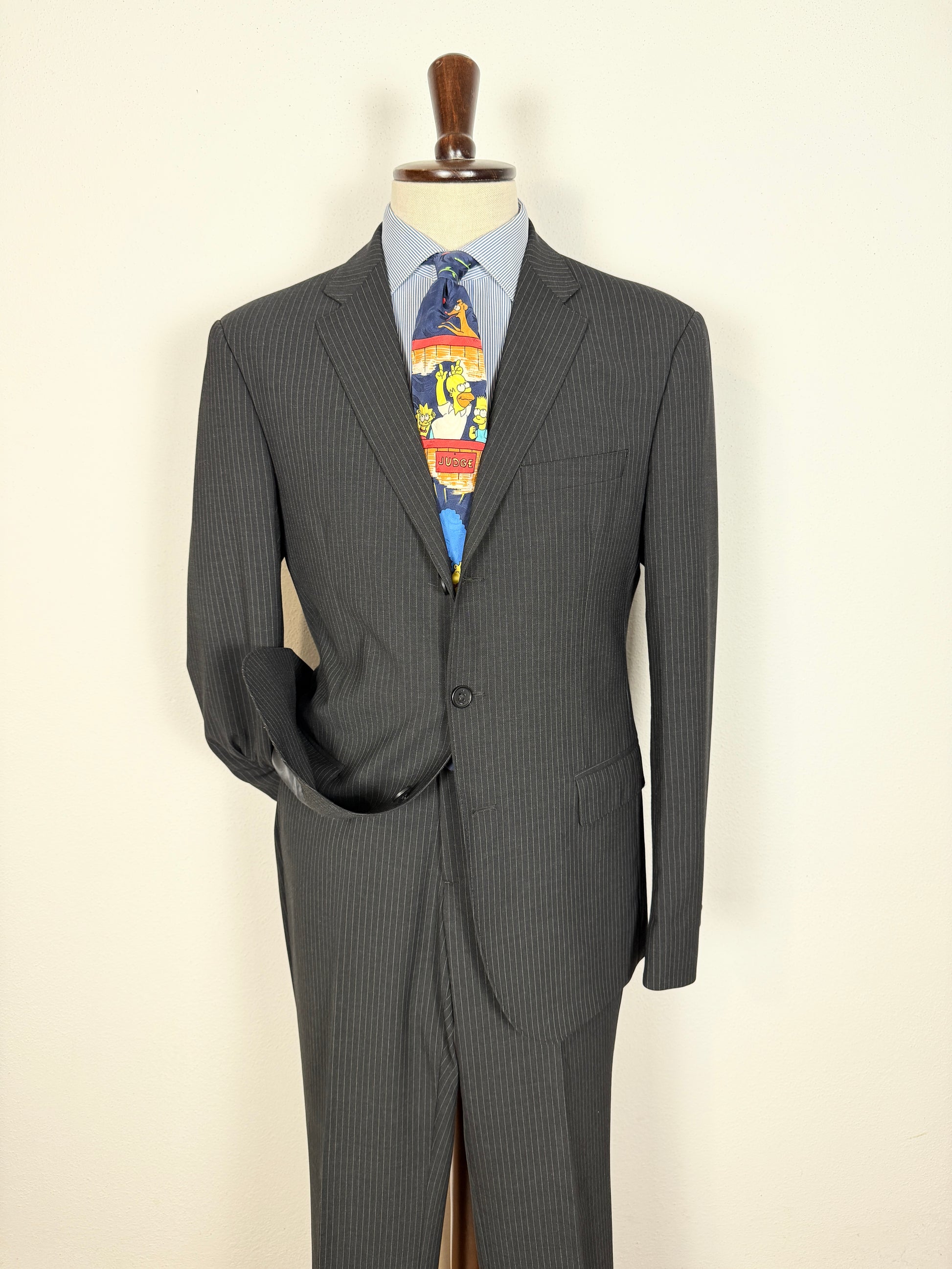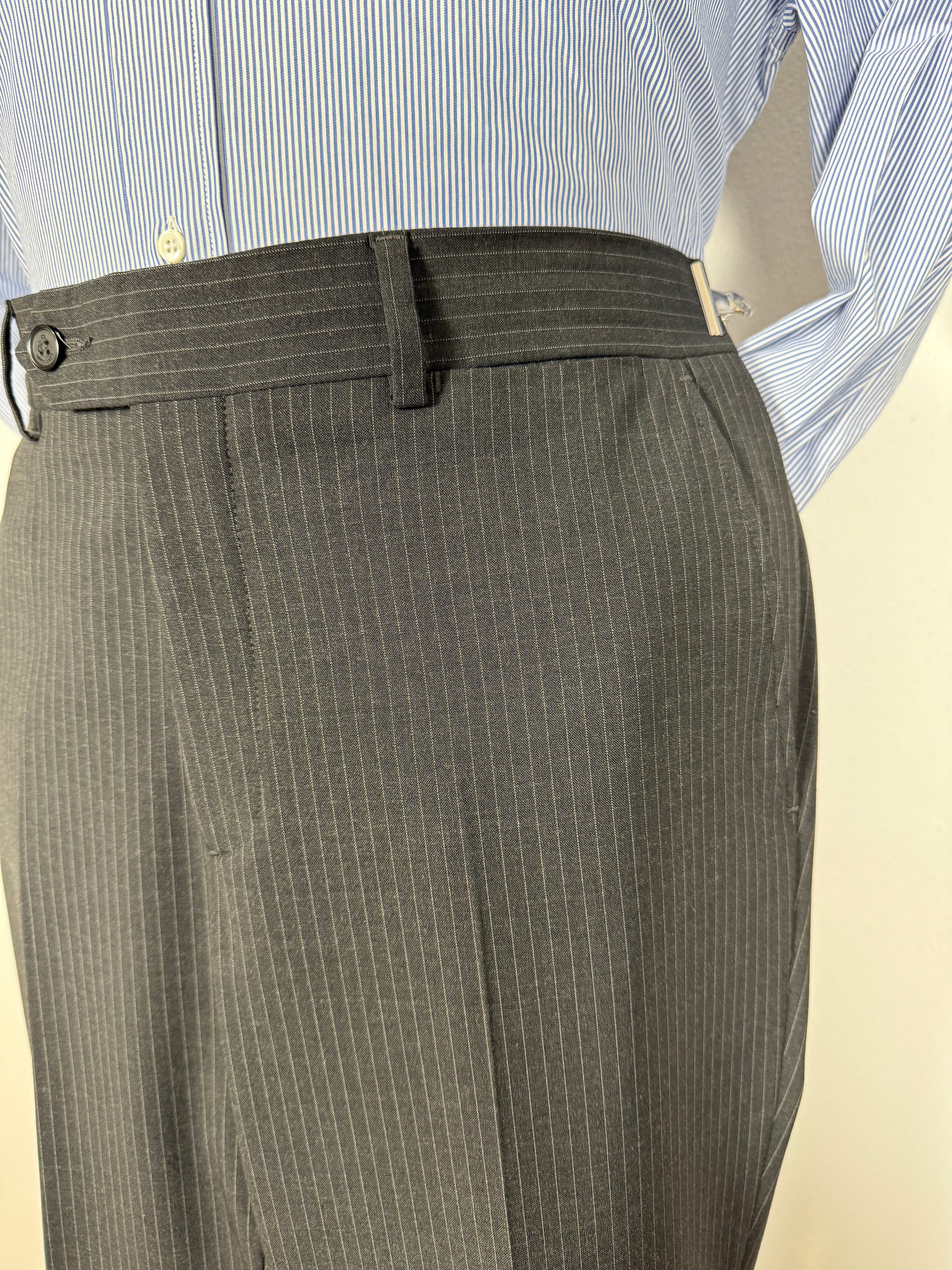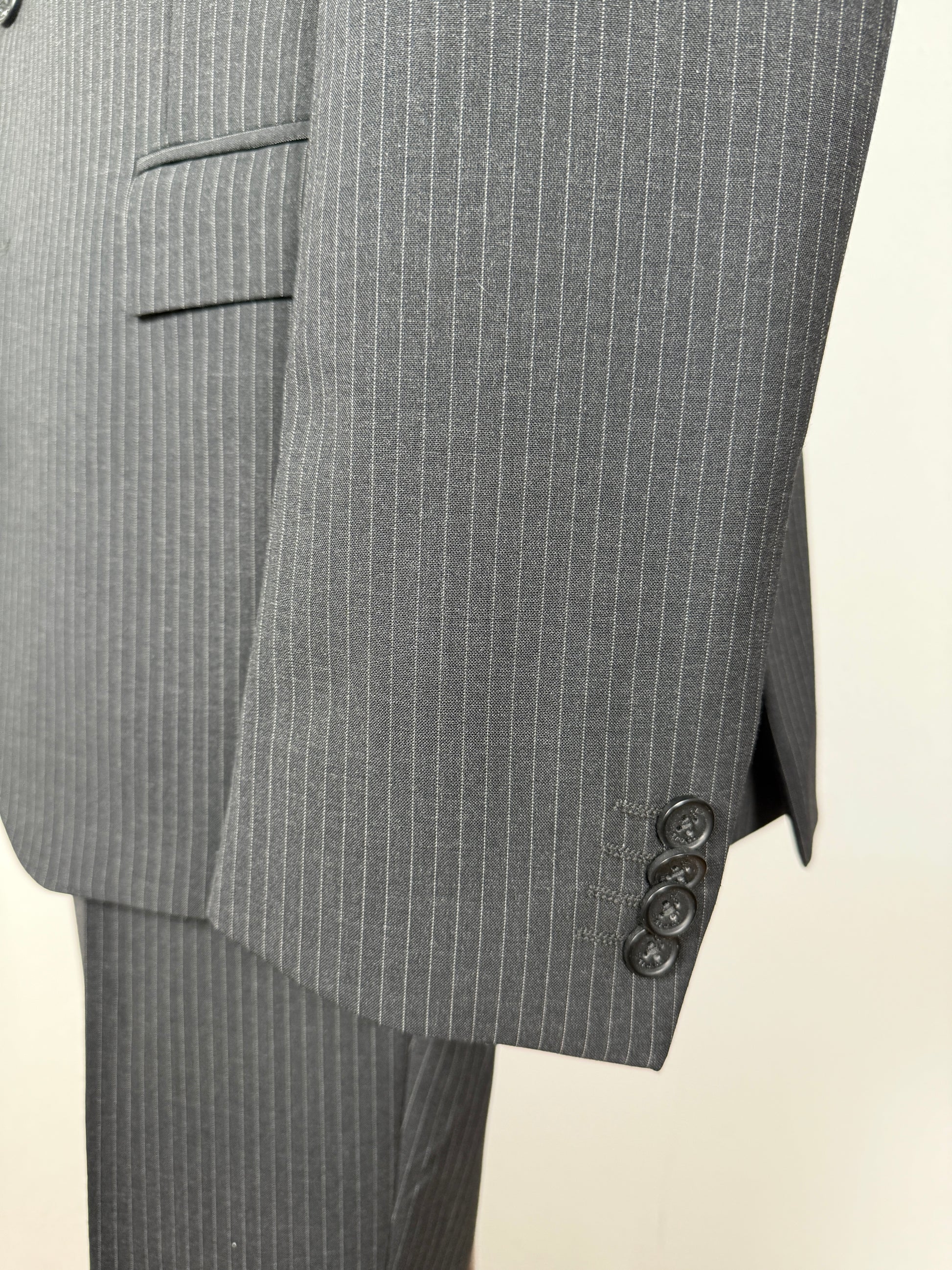 Moderno abito Calvin Klein colore grigio antracite gessato a riga chiara sottile.