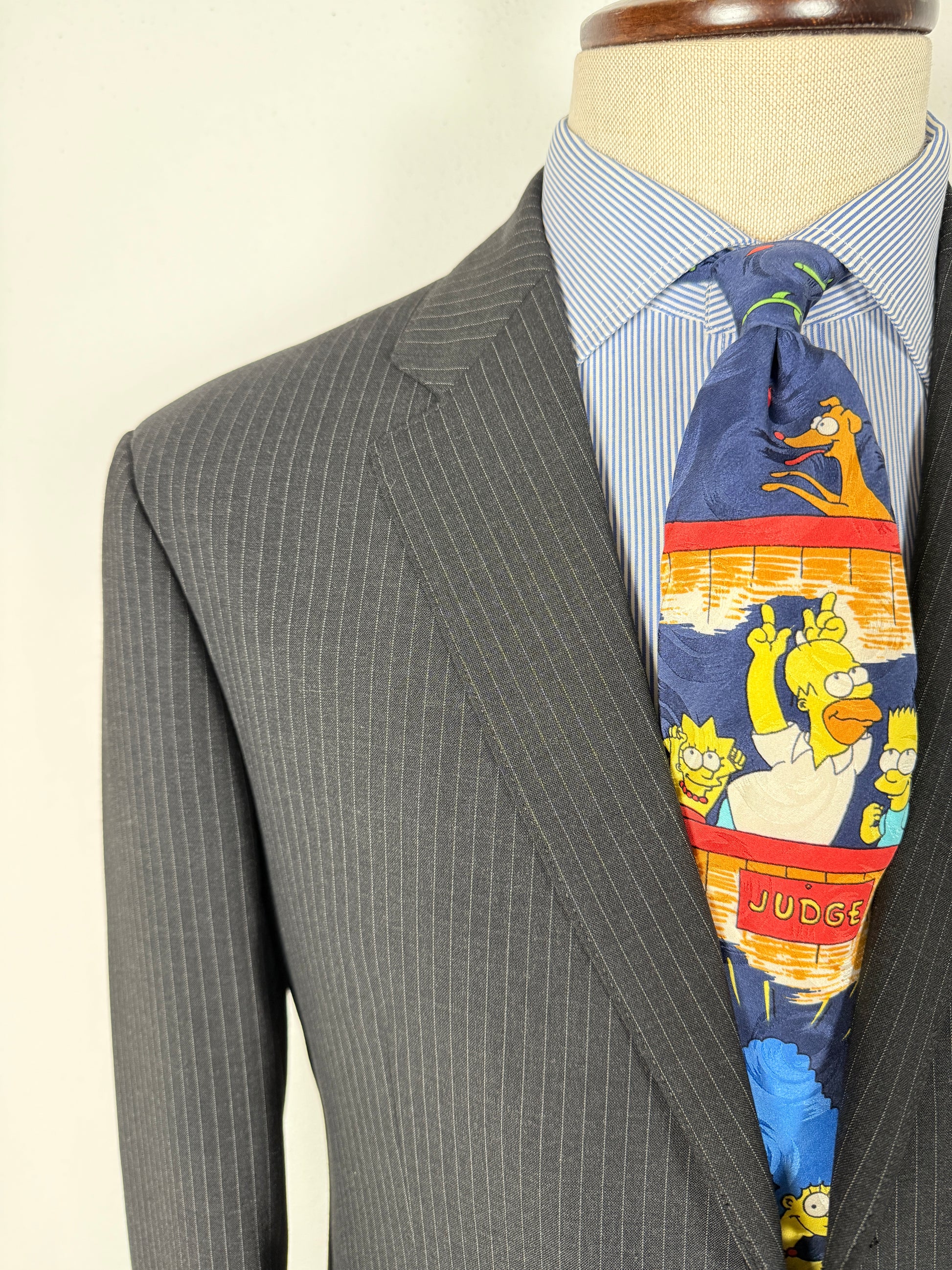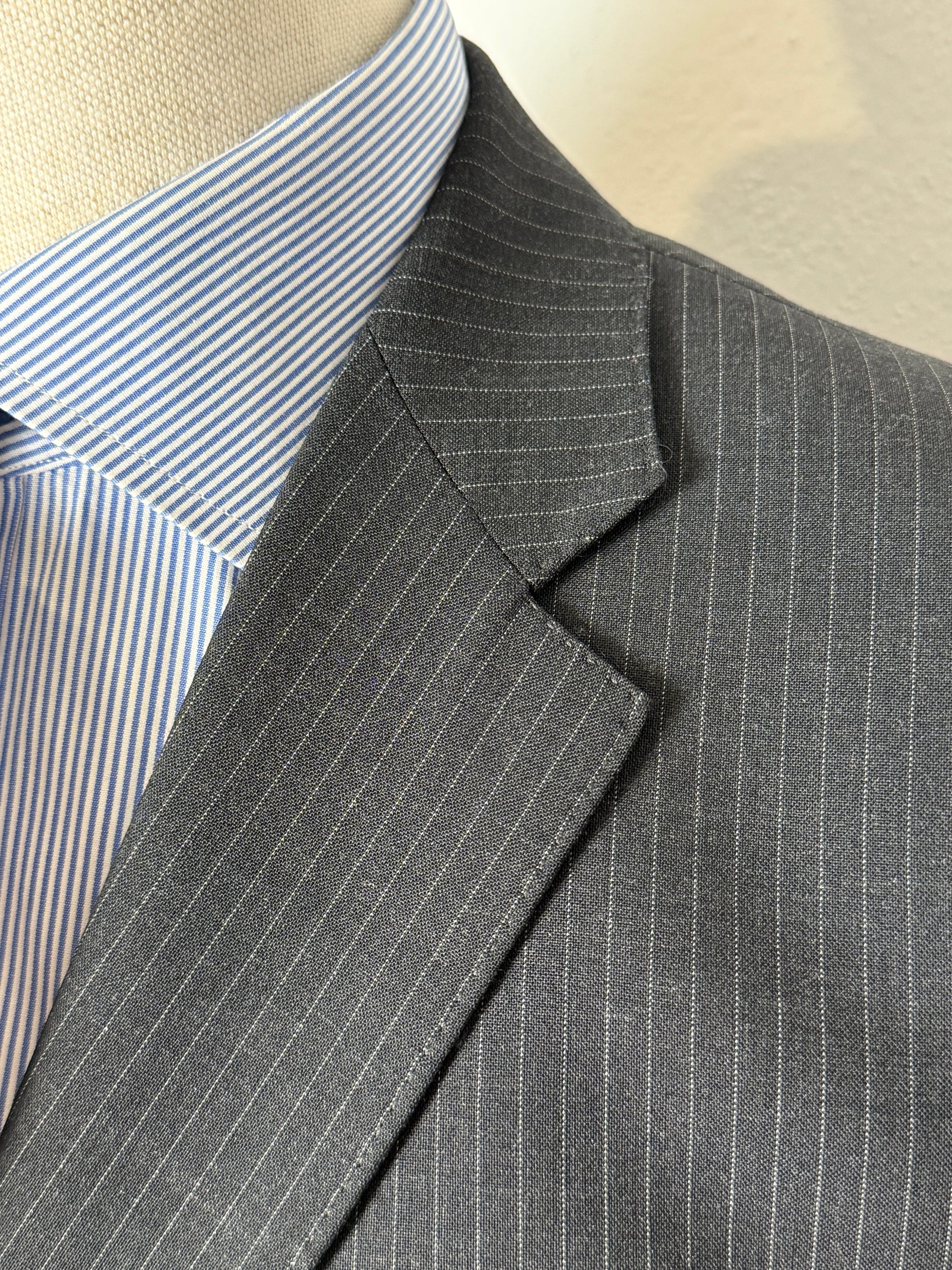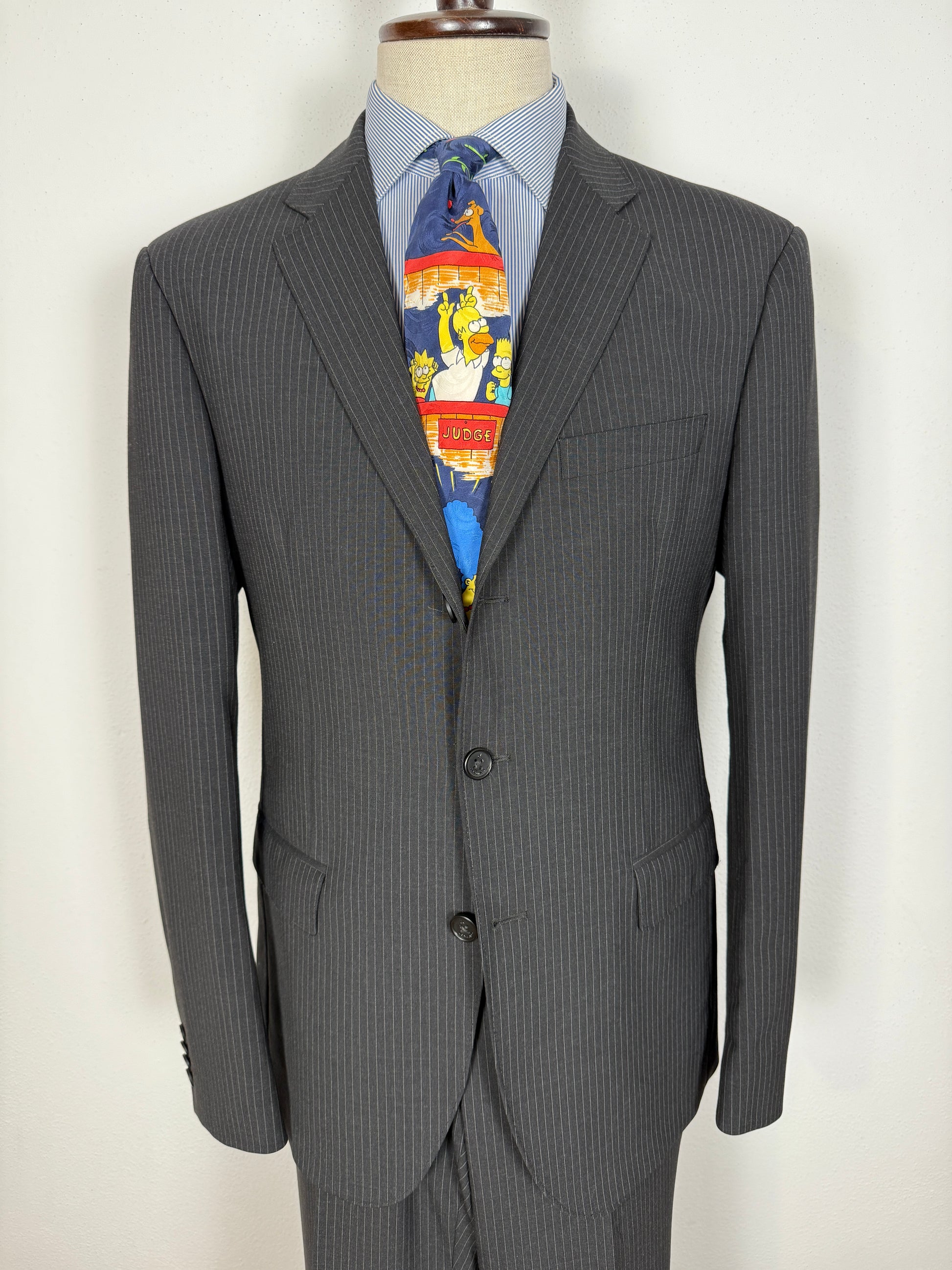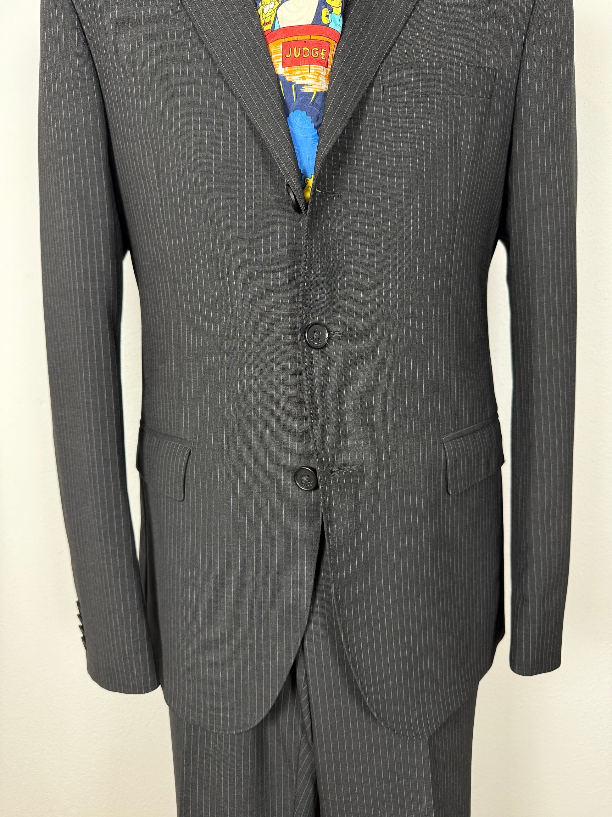 Moderno abito Calvin Klein colore grigio antracite gessato a riga chiara sottile.