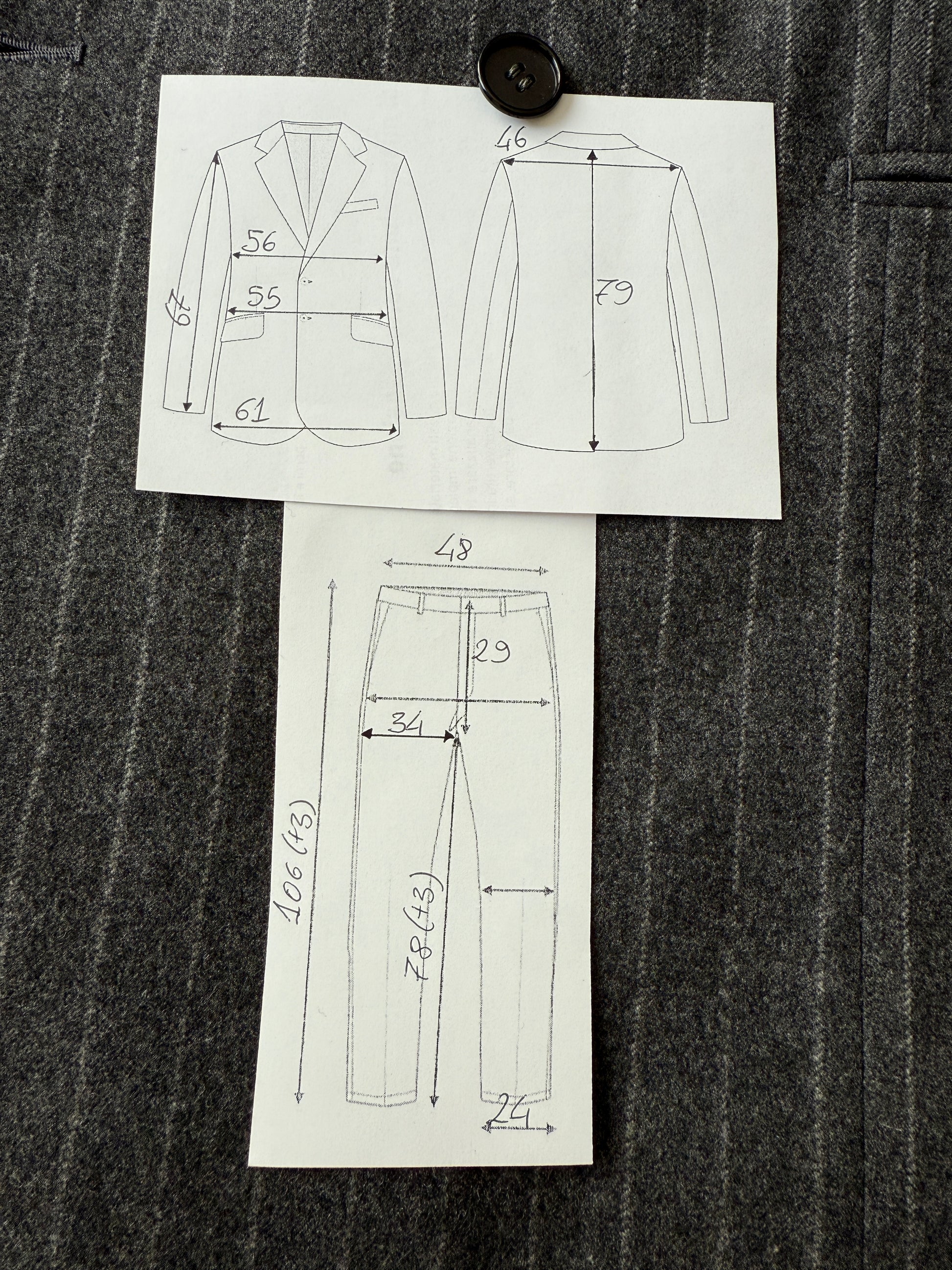 ⚠️ Per un confronto il più utile e accurato possibile, è necessario confrontare le misure solo fra abiti dal taglio simile: ad esempio, un abito dal taglio classico (giacca morbida e pantalone a vita alta) con un altro abito analogo, non con un abito slim fit o con un abito tipo anni '70 dal taglio snello e avvitato (e viceversa).