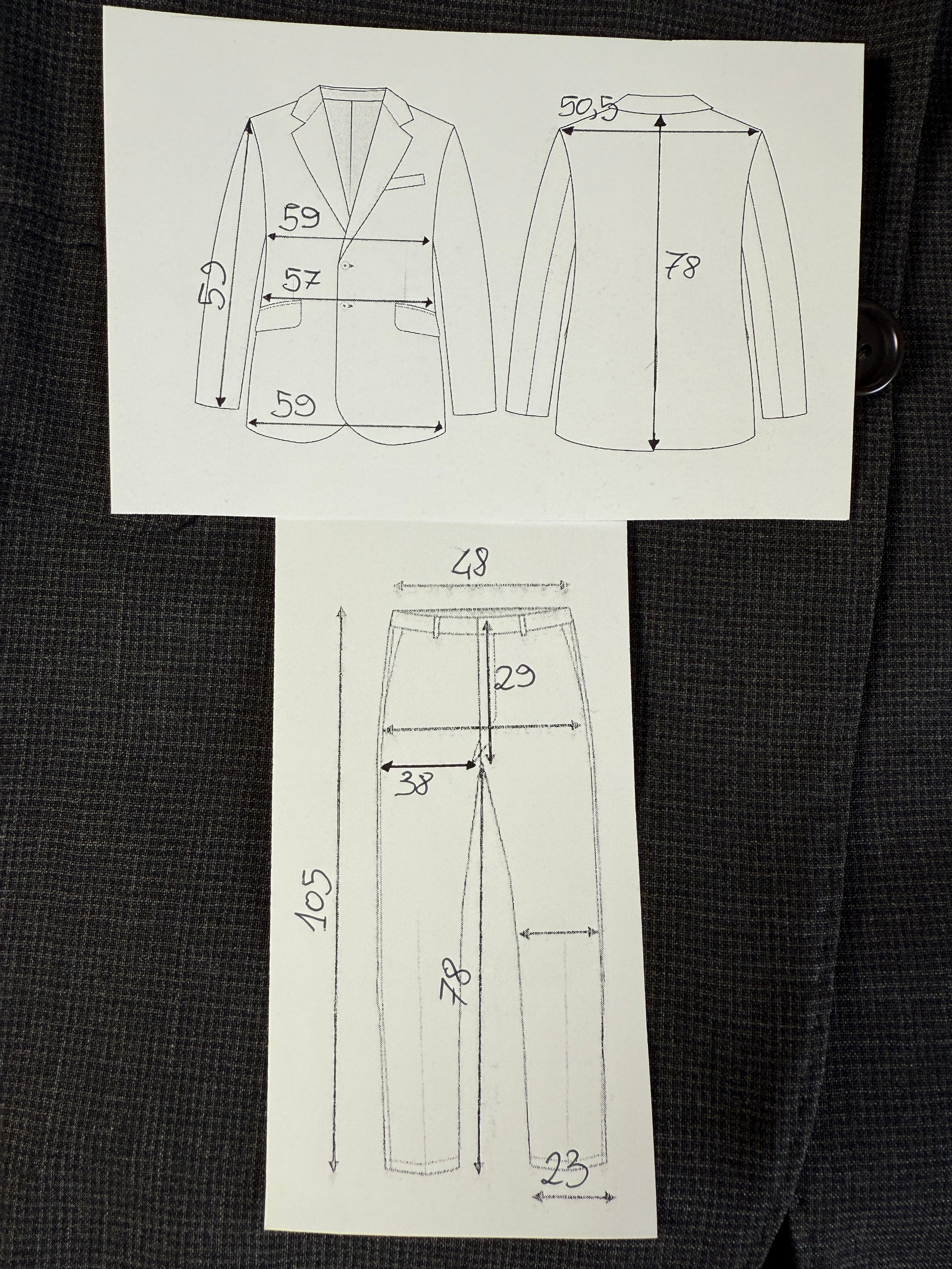⚠️ Per un confronto il più utile e accurato possibile, è necessario confrontare le misure solo fra abiti dal taglio simile: ad esempio, un abito dal taglio classico (giacca morbida e pantalone a vita alta) con un altro abito analogo, non con un abito slim fit o con un abito tipo anni '70 dal taglio snello e avvitato (e viceversa).