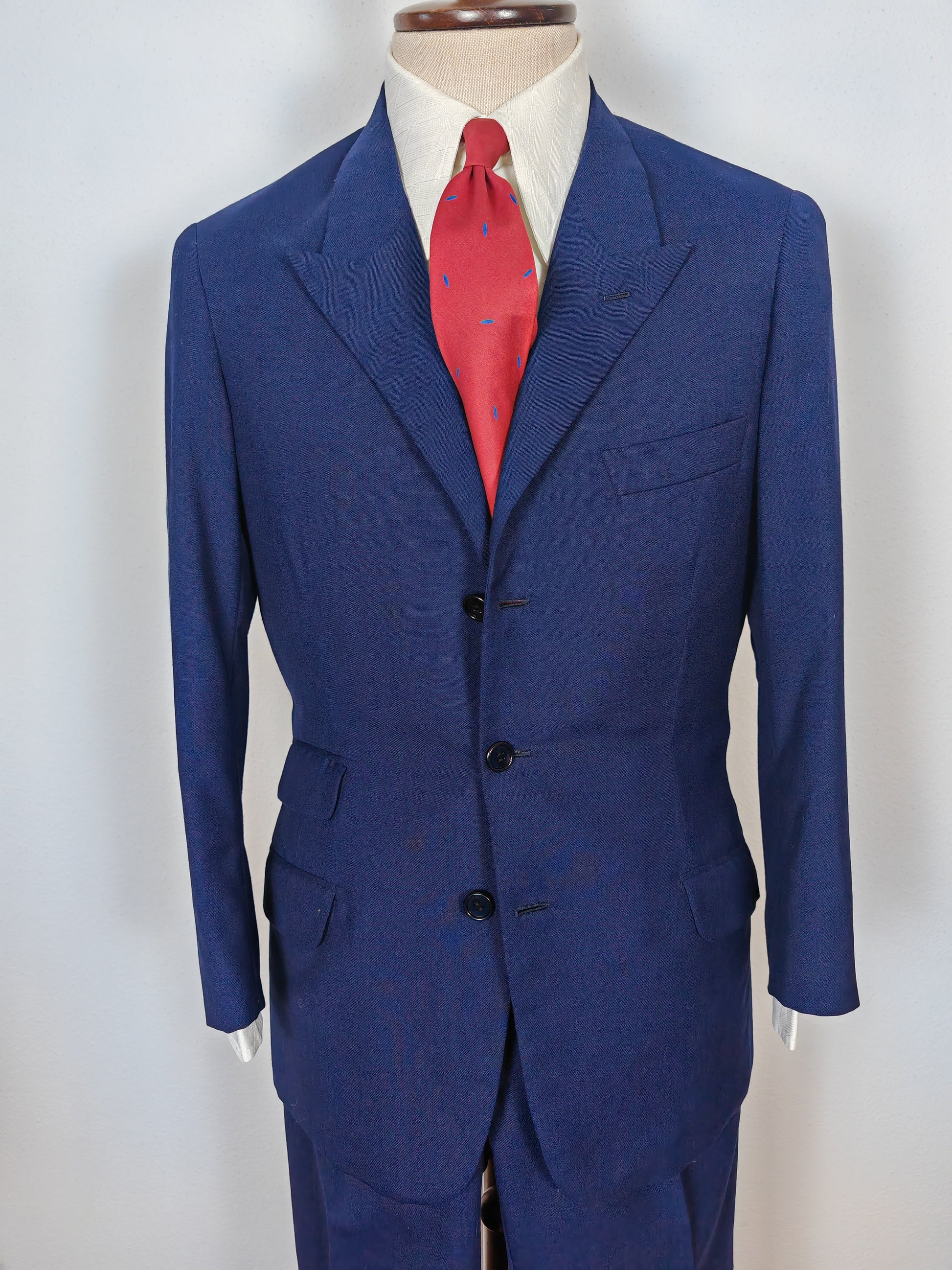 - Giacca monopetto a 3 bottoni dal taglio molto particolare, che richiama i primi decenni del '900: tasche a pattina oblique con ticket pocket, revers stretti a lancia (particolarissimi su un monopetto), spacco singolo posteriore, silhouette sfiancata.
