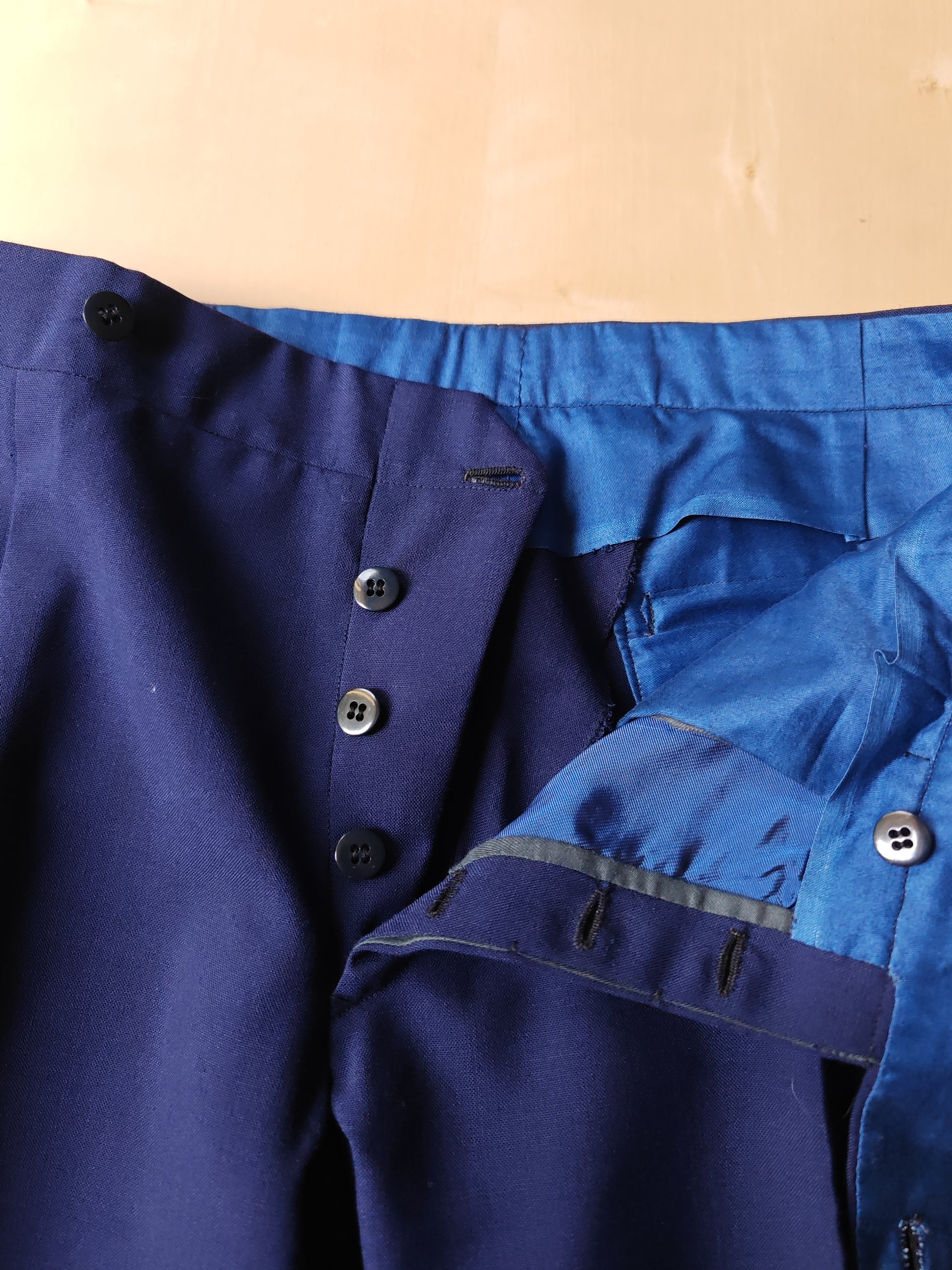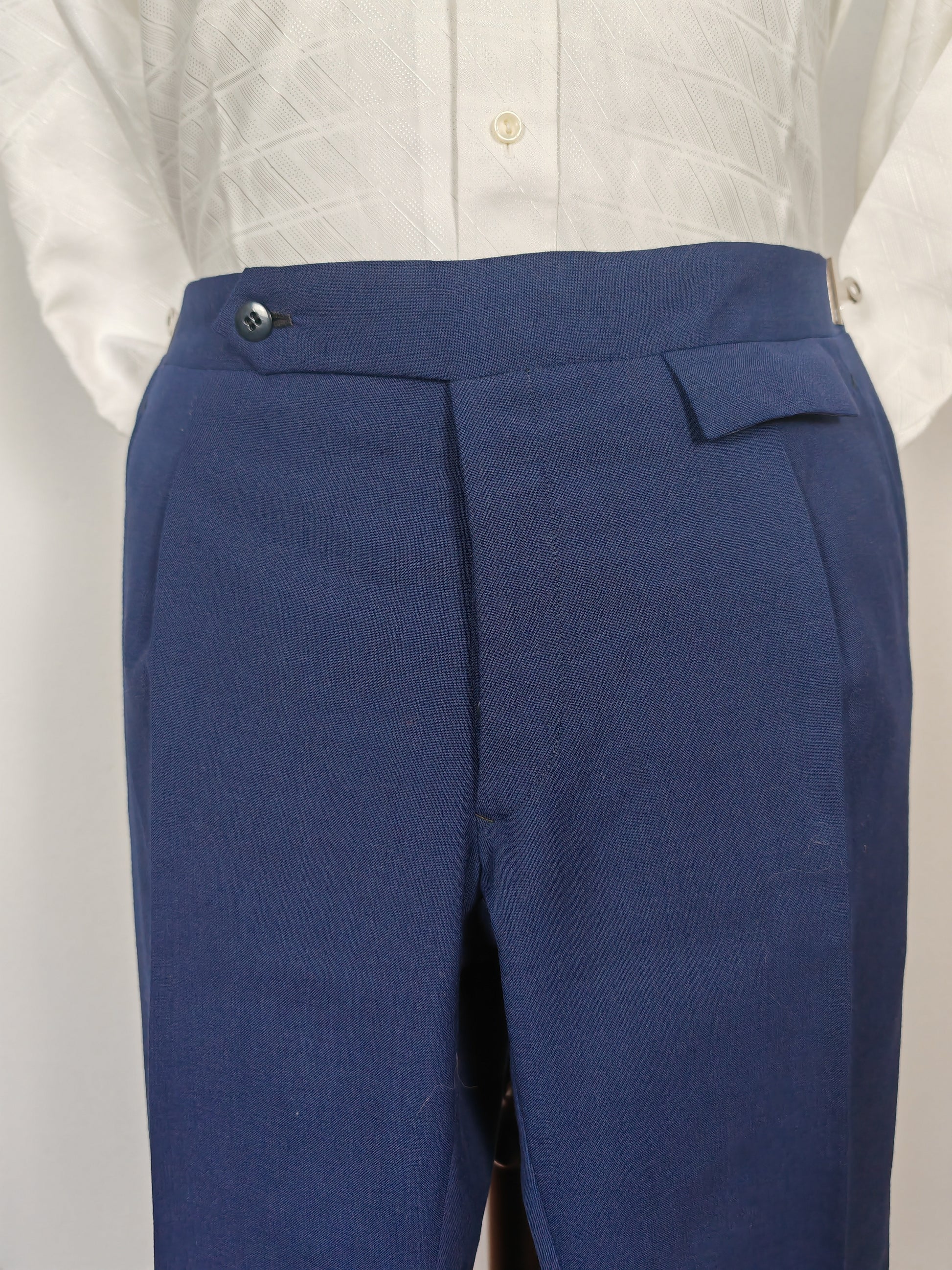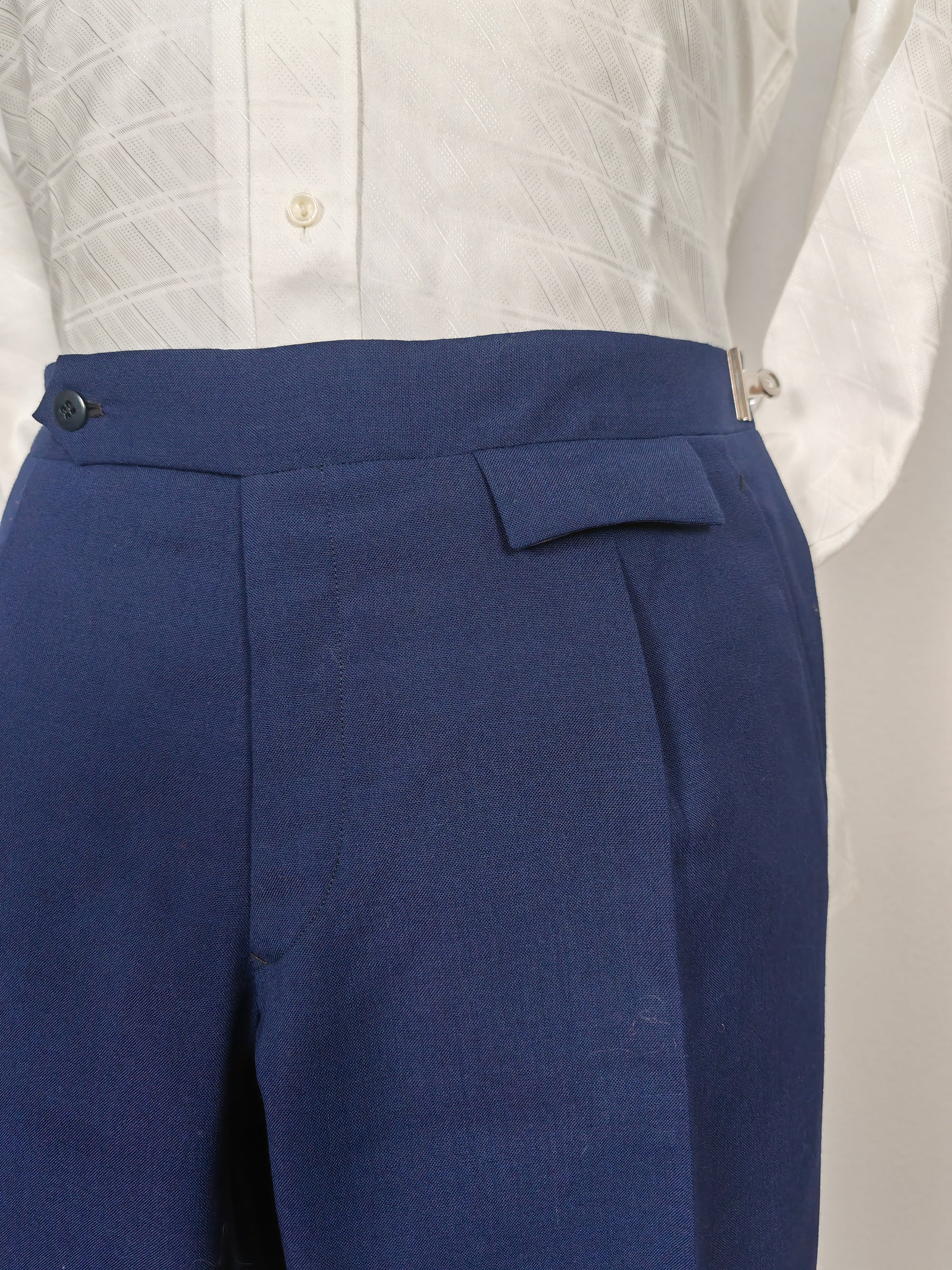 - Pantalone a vita altezza media, con bel dettaglio della pattina nelle tasche posteriori e nel taschino alla cintura, risvolto 3 cm con strisce battitacco cucite a mano, chiusura con patta a bottoni e interno fatto in gran parte a mano.