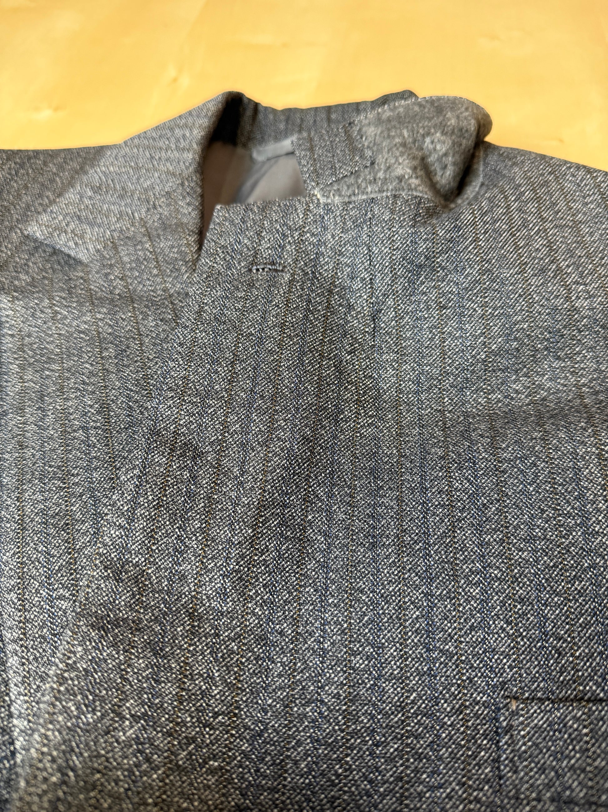 L'abito veste una taglia 50/52 per quanto riguarda la giacca. I pantaloni hanno invece già subito una modifica che li ha leggermente allargati portandoli a una 52 abbondante: non c'è quindi margine per allargarli ulteriormente se si vuole un lavoro pulito.