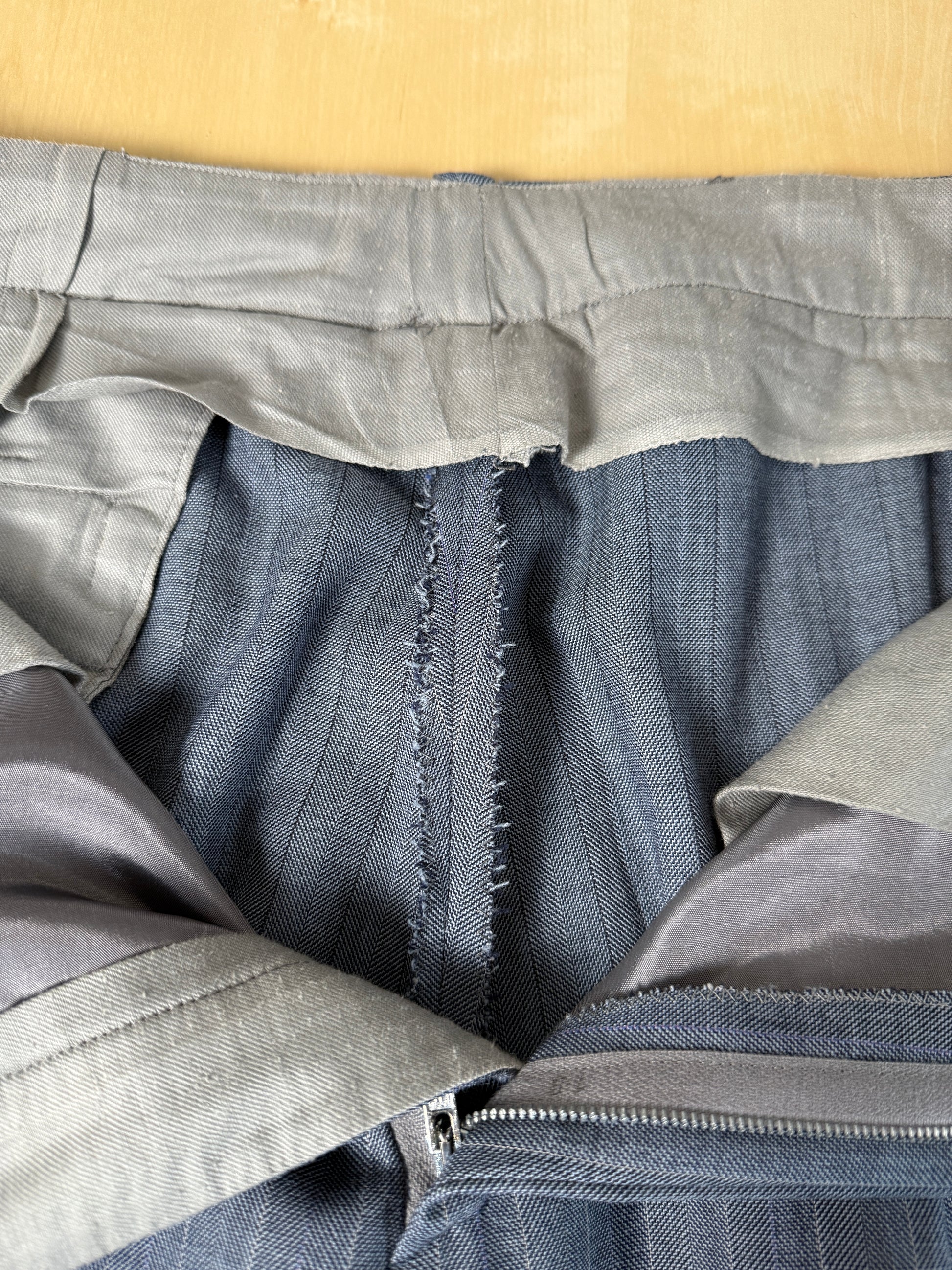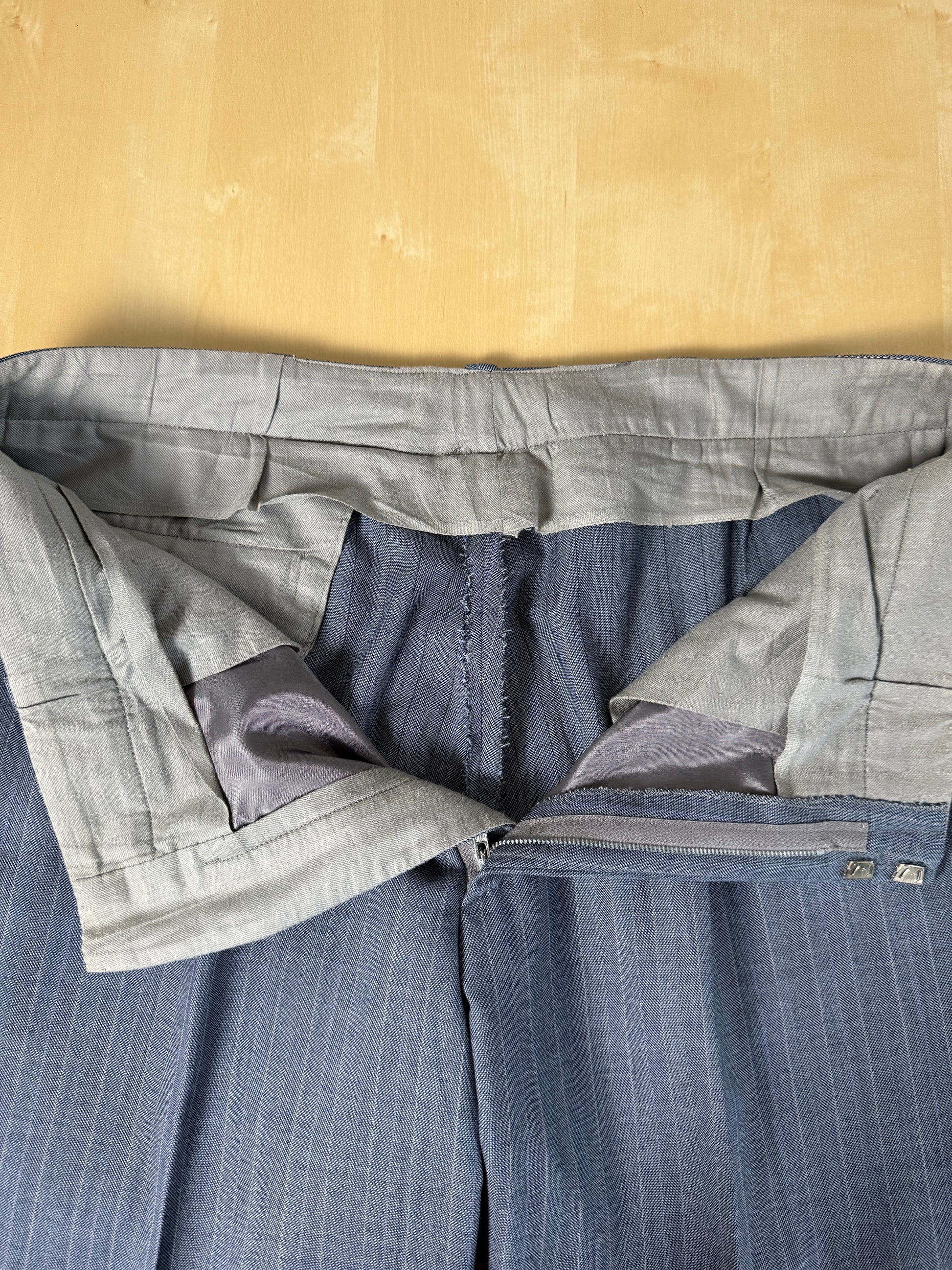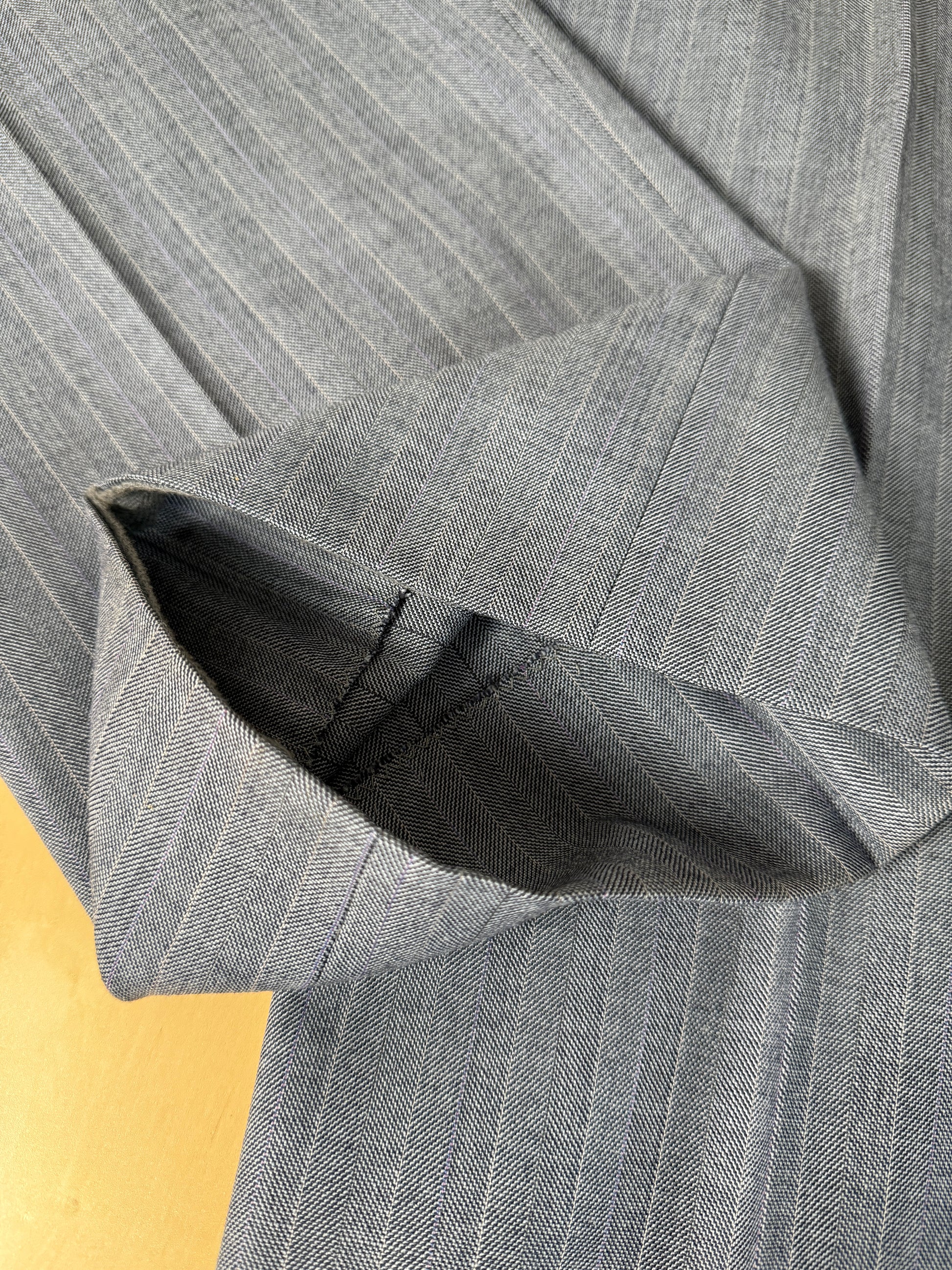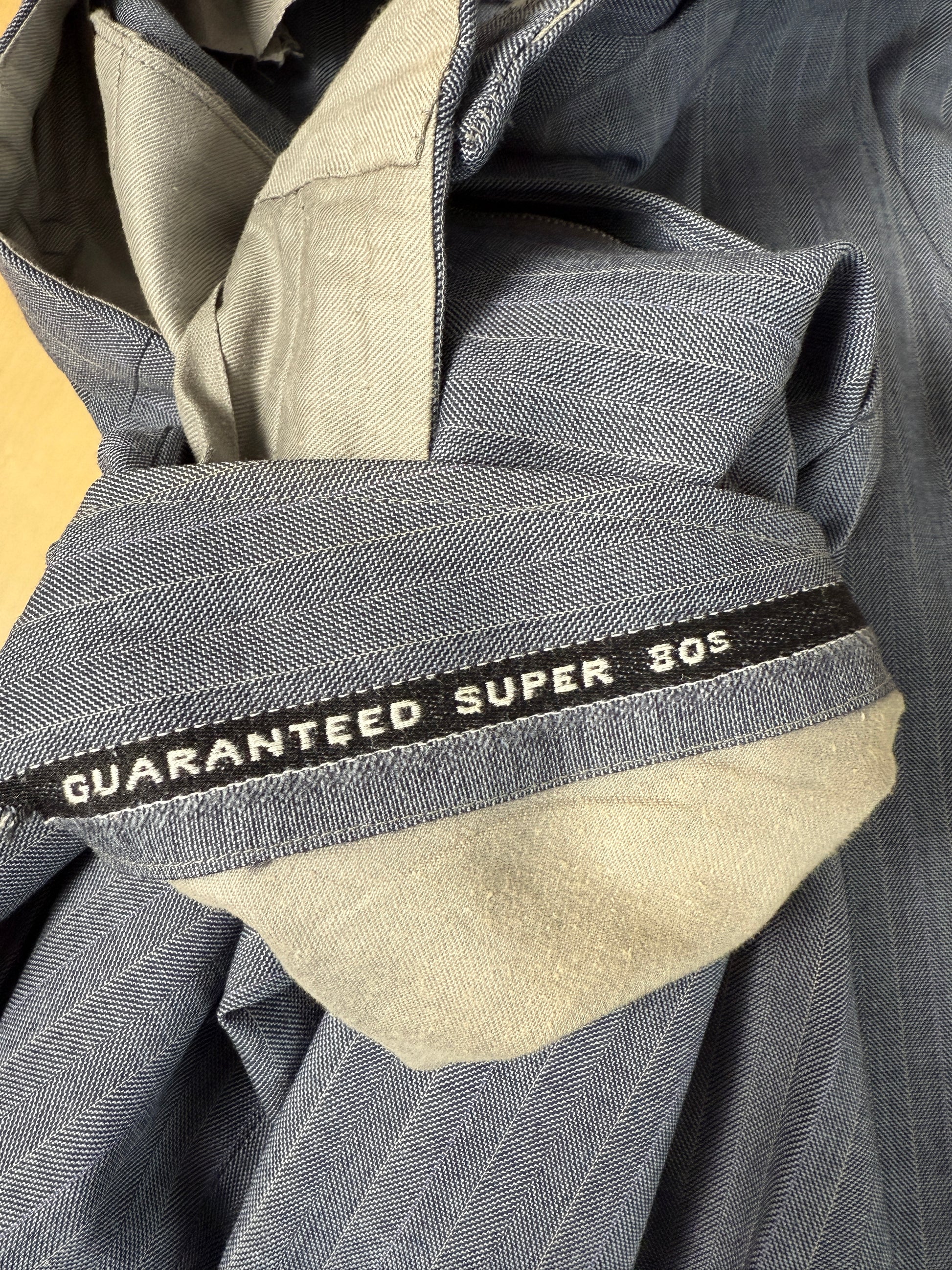 Da notare la finezza sartoriale della cimosa del tessuto conservata dal tagliatore all'interno delle tasche, il che permette di leggere il titolo del filato: super 80s! Un titolo sotto i 100s, che sarebbe snobbato dai più ai giorni d'oggi su un tessuto pettinato, ma è invece davvero tipico dell'epoca.