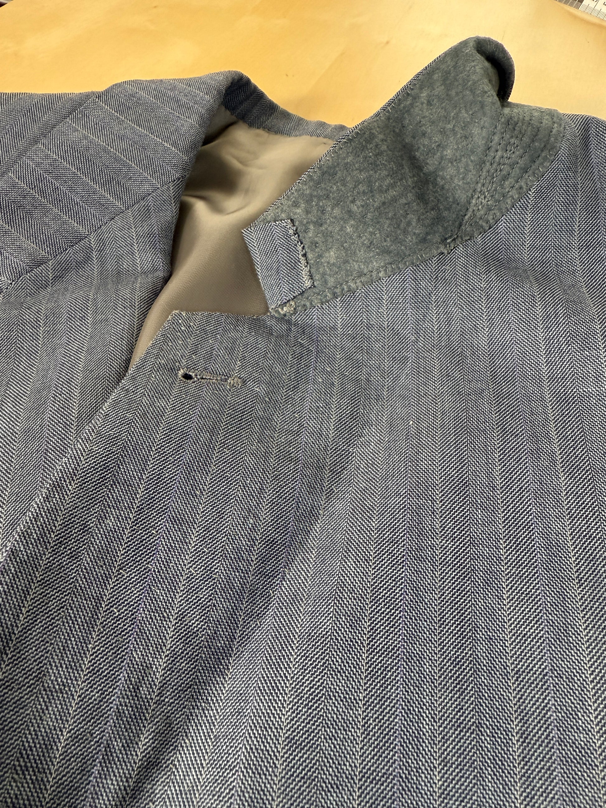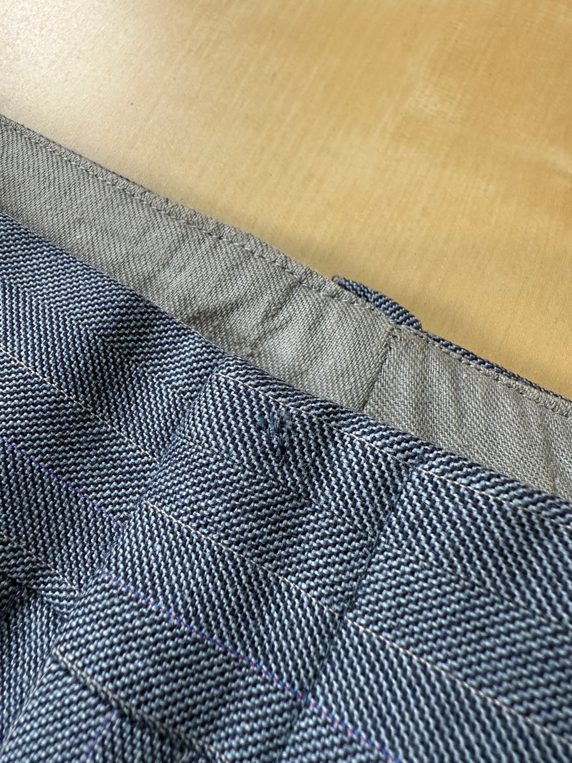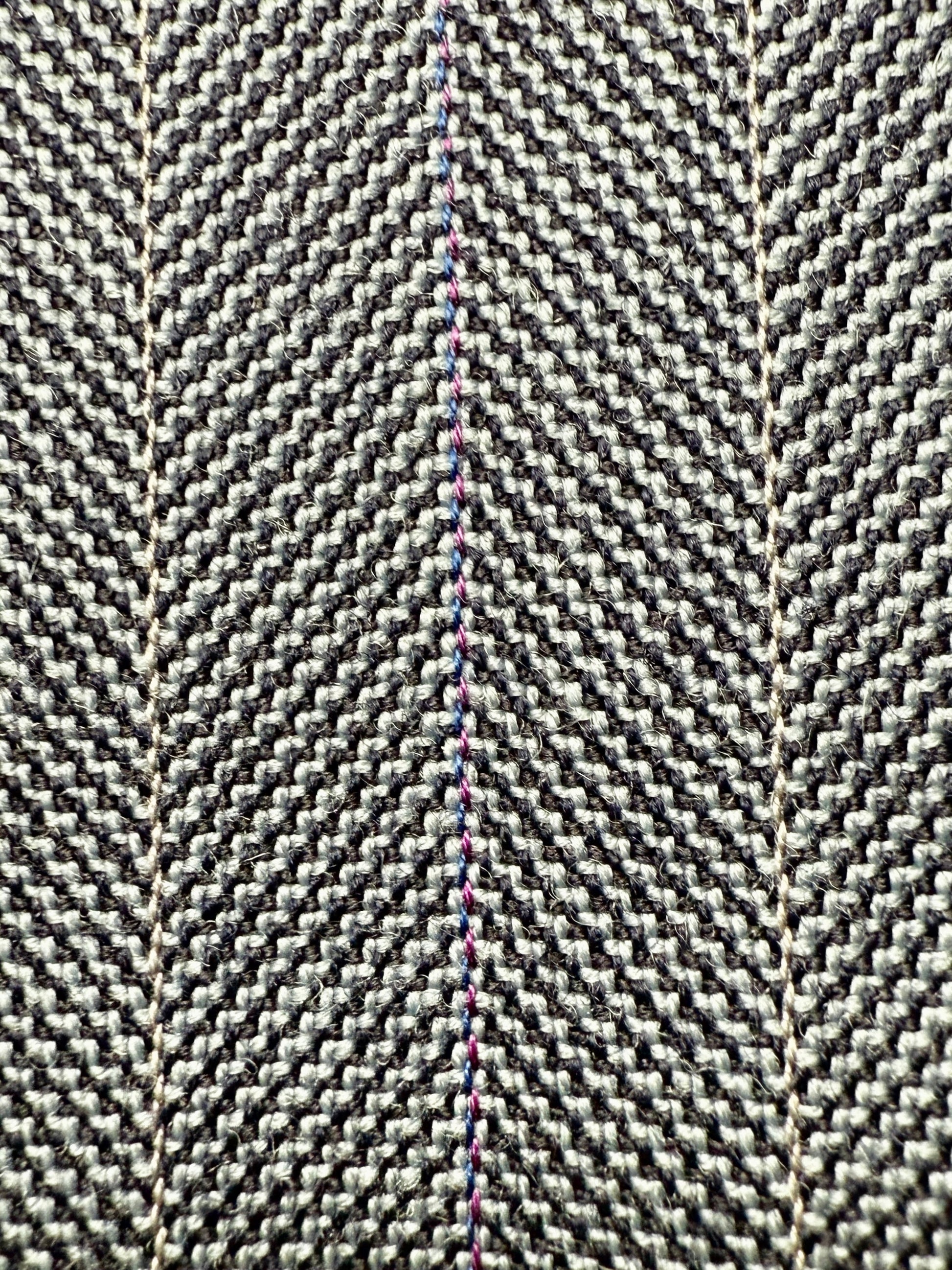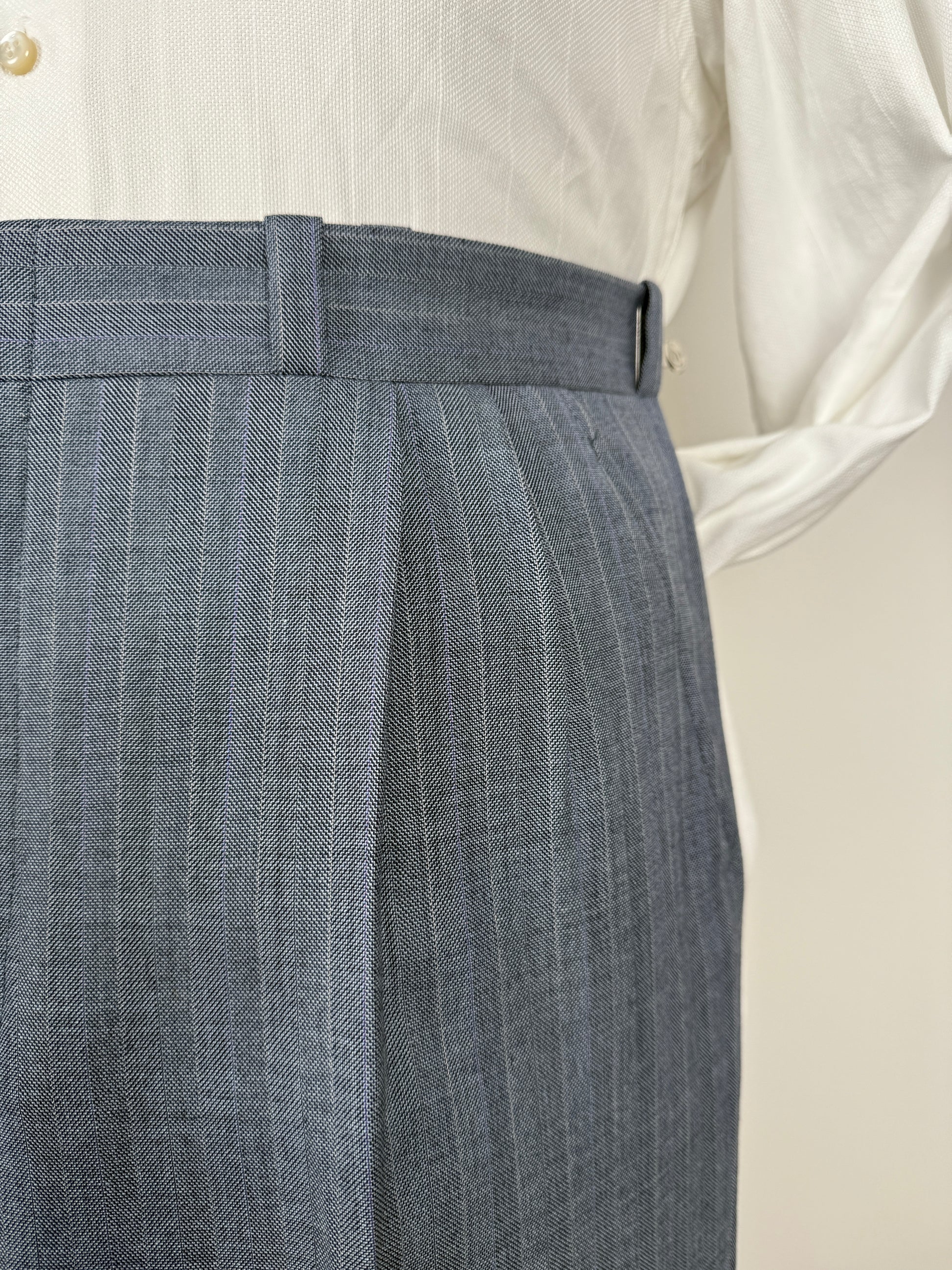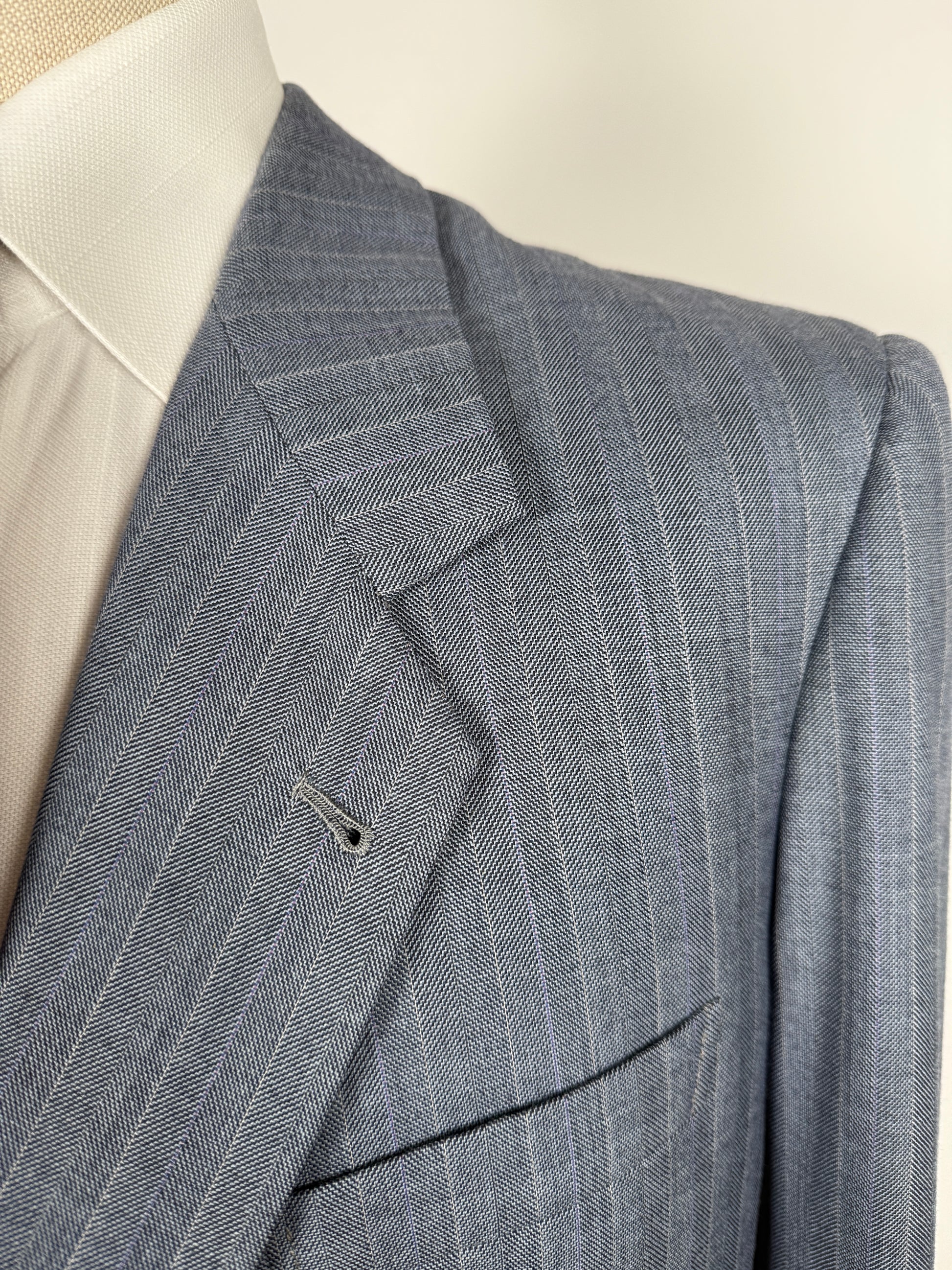 Da notare la finezza sartoriale della cimosa del tessuto conservata dal tagliatore all'interno delle tasche, il che permette di leggere il titolo del filato: super 80s! Un titolo sotto i 100s, che sarebbe snobbato dai più ai giorni d'oggi su un tessuto pettinato, ma è invece davvero tipico dell'epoca.