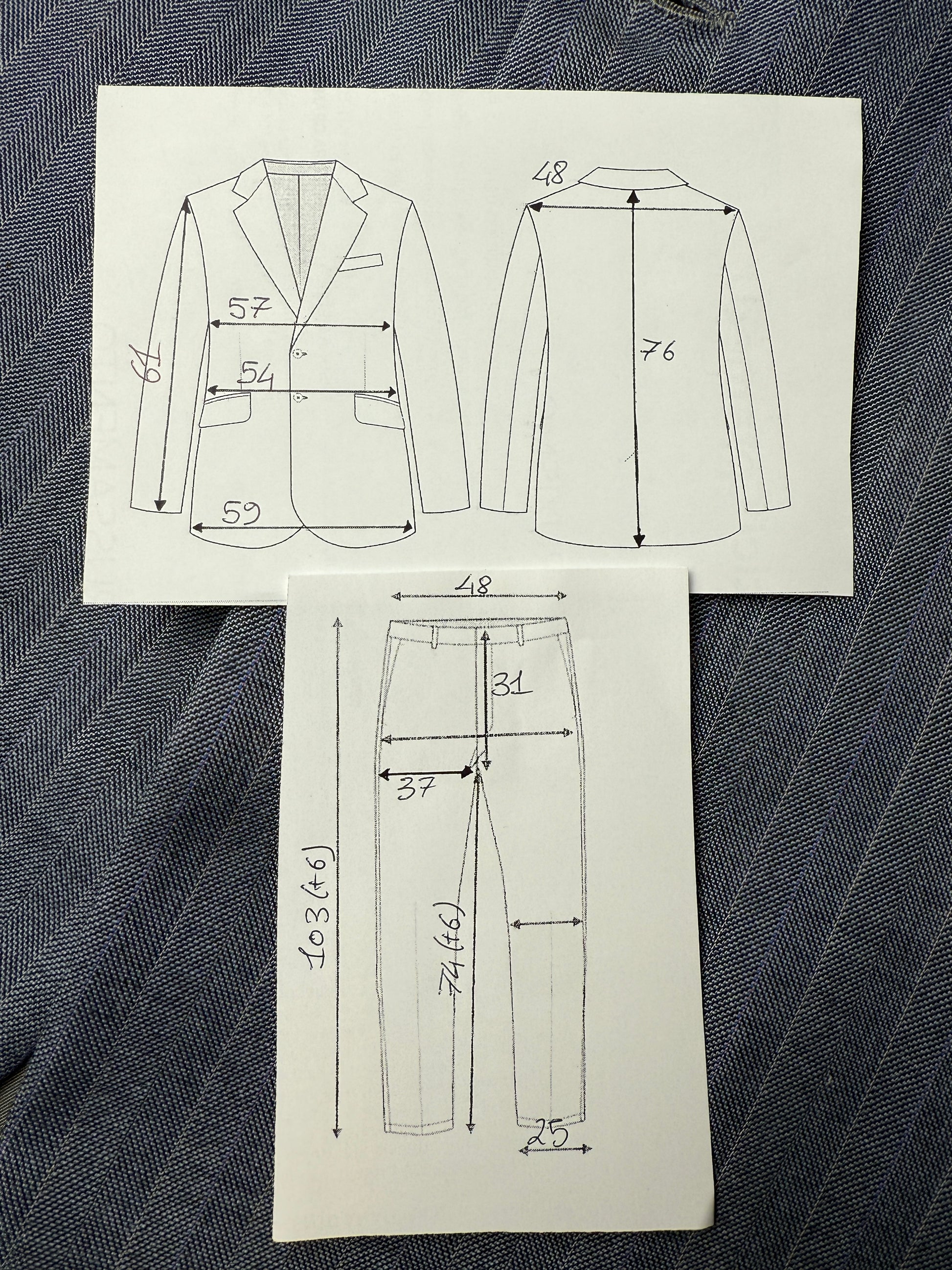 ⚠️ Per un confronto il più utile e accurato possibile, è necessario confrontare le misure solo fra abiti dal taglio simile: ad esempio, un abito dal taglio classico (giacca morbida e pantalone a vita alta) con un altro abito analogo, non con un abito slim fit o con un abito tipo anni '70 dal taglio snello e avvitato (e viceversa).
