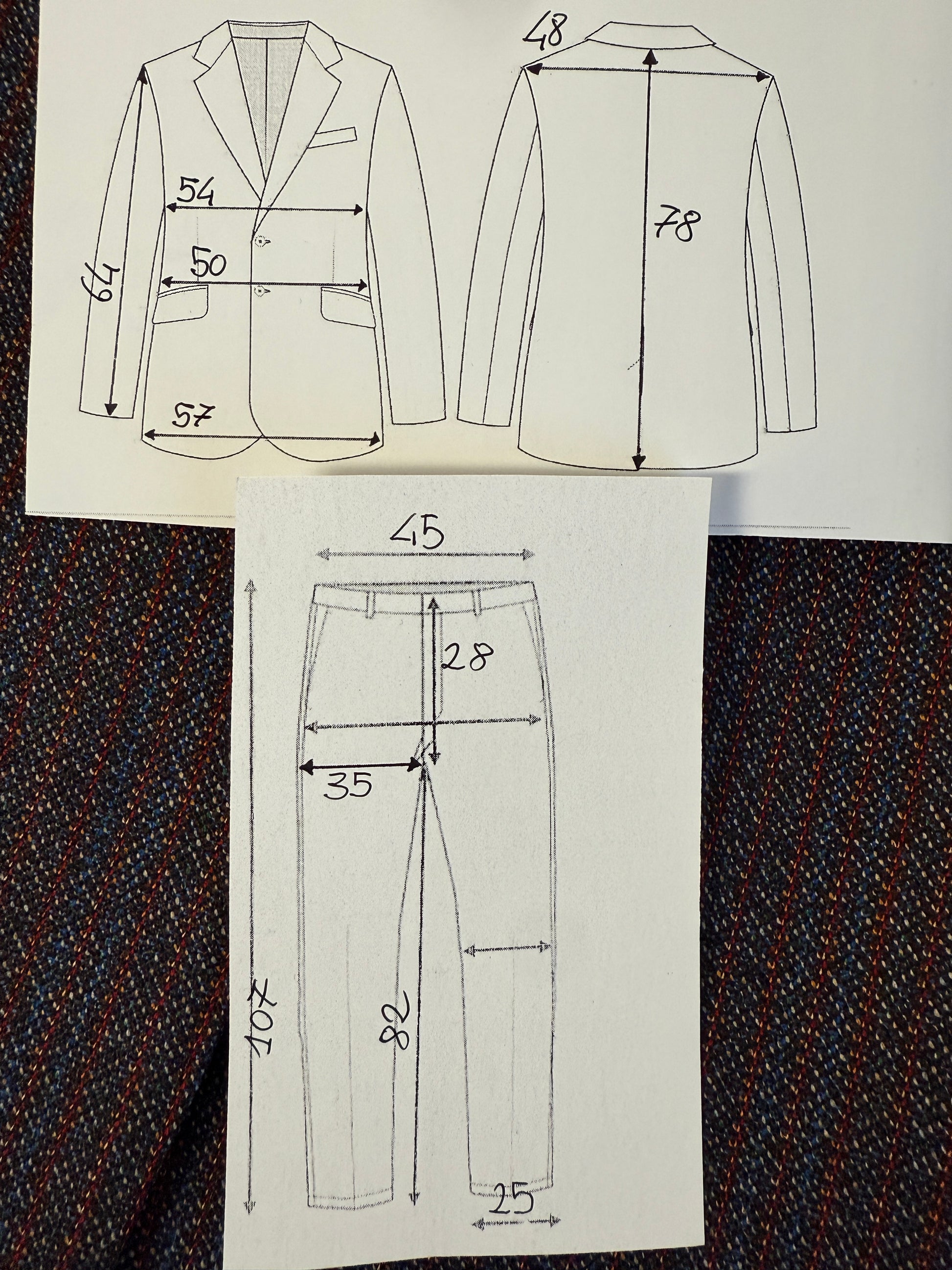 ⚠️ Per un confronto il più utile e accurato possibile, è necessario confrontare le misure solo fra abiti dal taglio simile: ad esempio, un abito dal taglio classico (giacca morbida e pantalone a vita alta) con un altro abito analogo, non con un abito slim fit o con un abito tipo anni '70 dal taglio snello e avvitato (e viceversa).