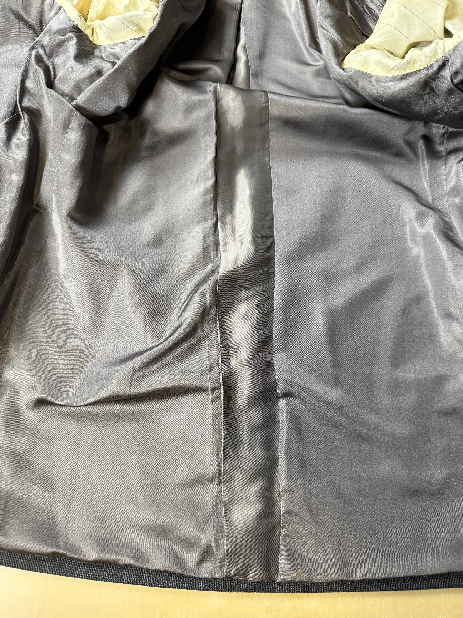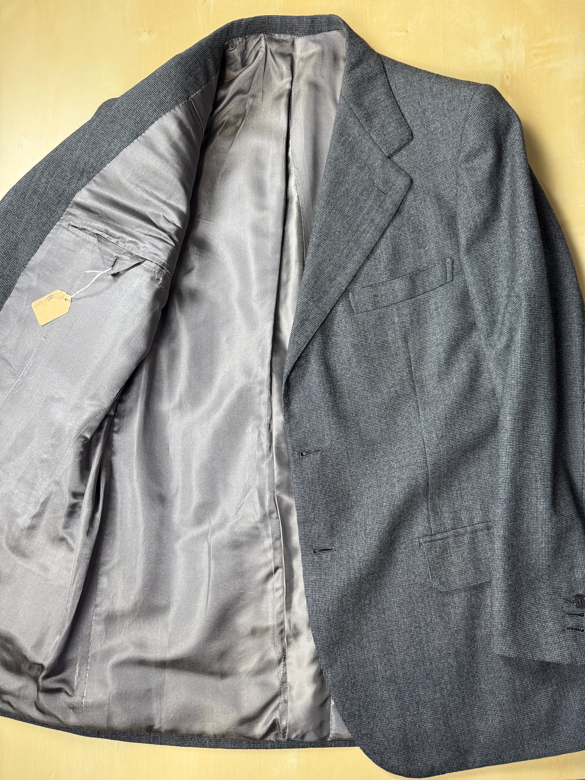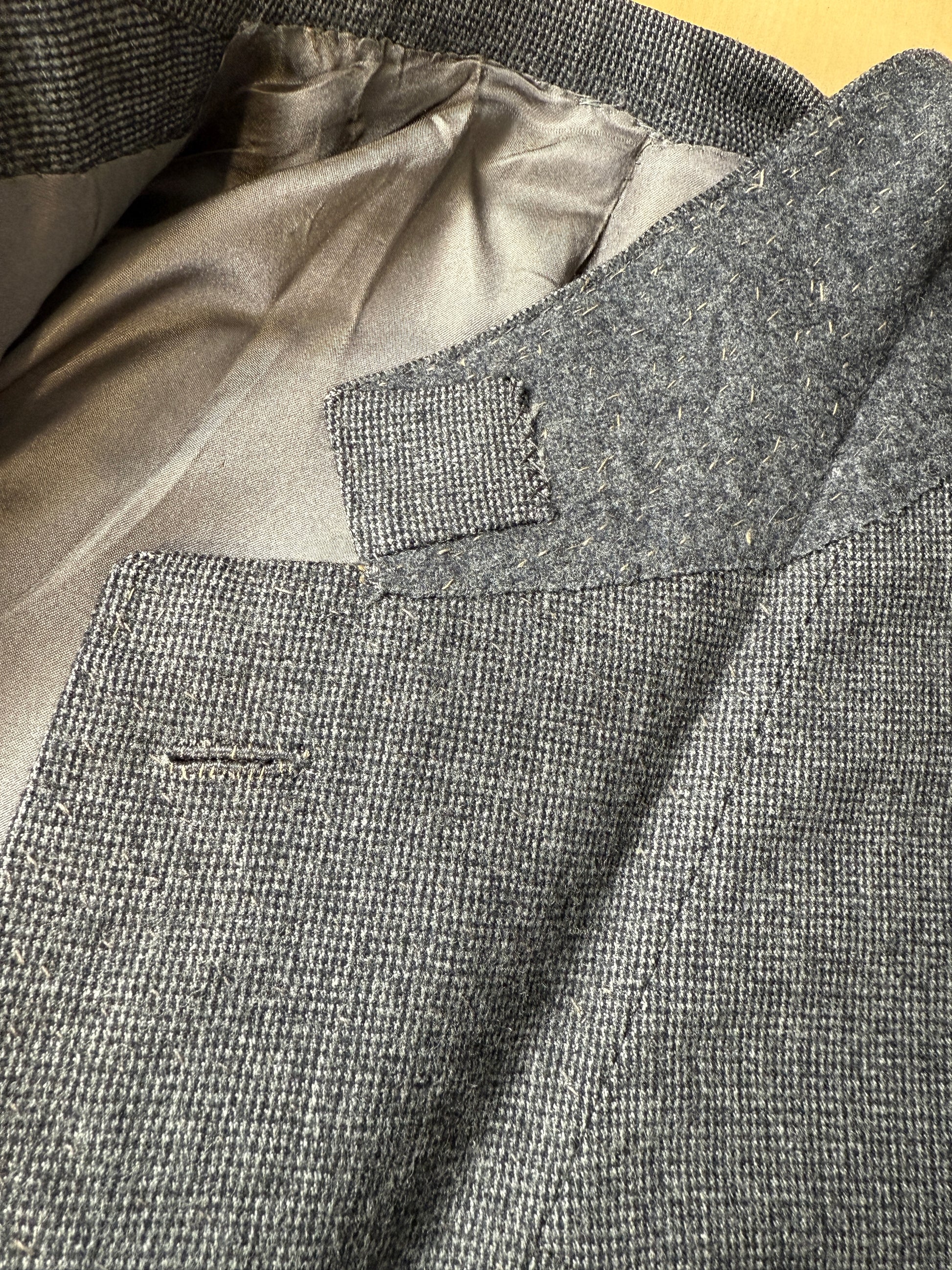Giacca completamente intelata a mano, con un bel taglio a 3 bottoni (attualmente stirato a 2), revers ampi, tasche a pattina e senza spacchi.