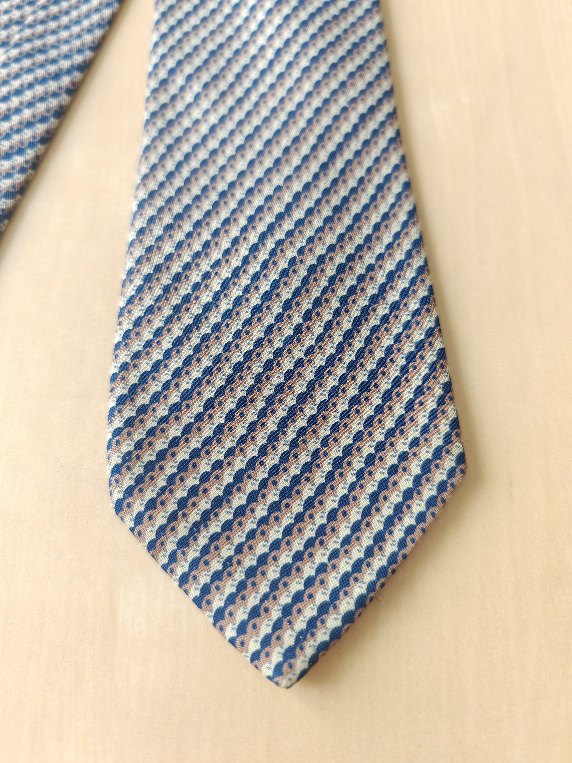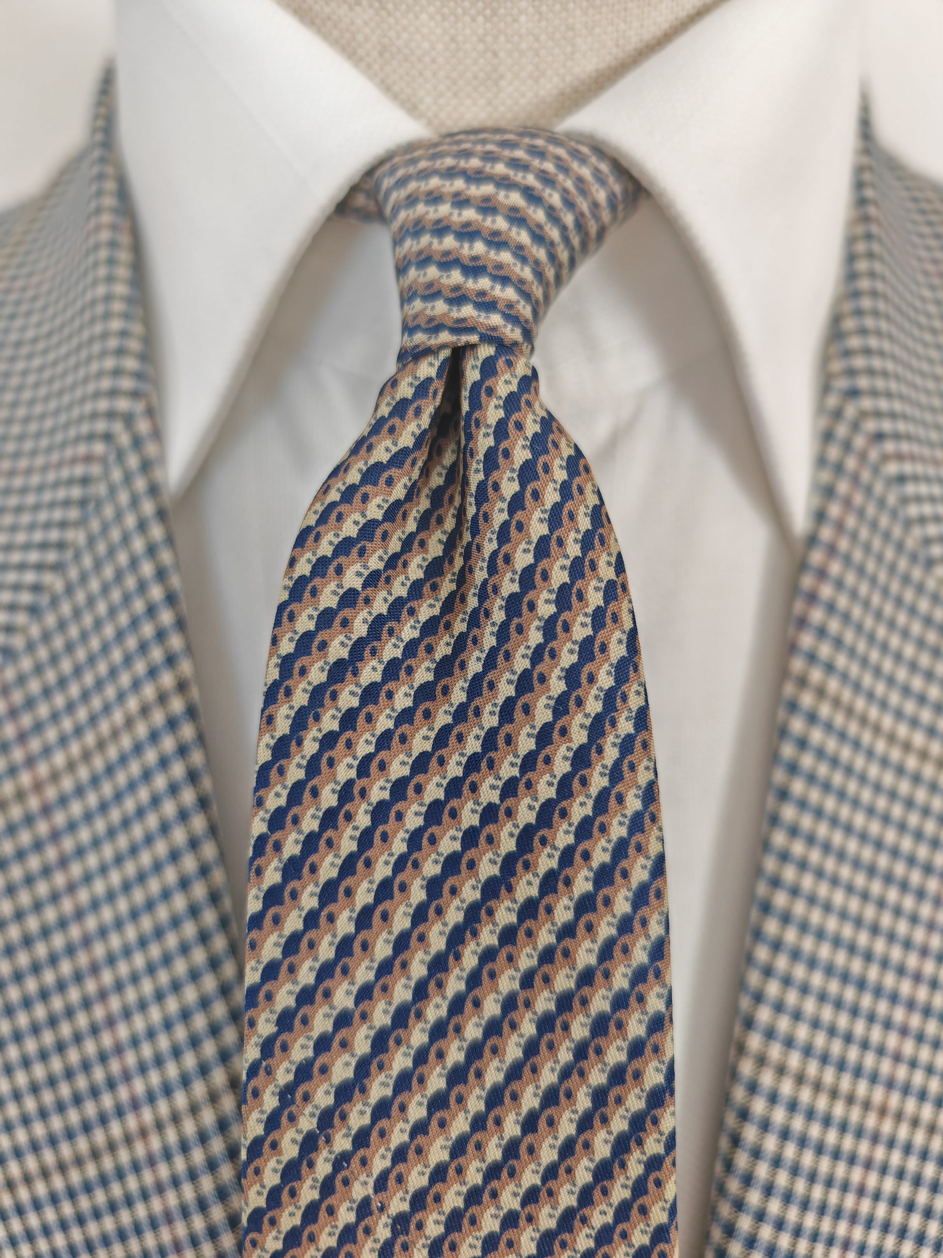 Micro-fantasia geometrica/optical sui toni del blu, marrone e beige.