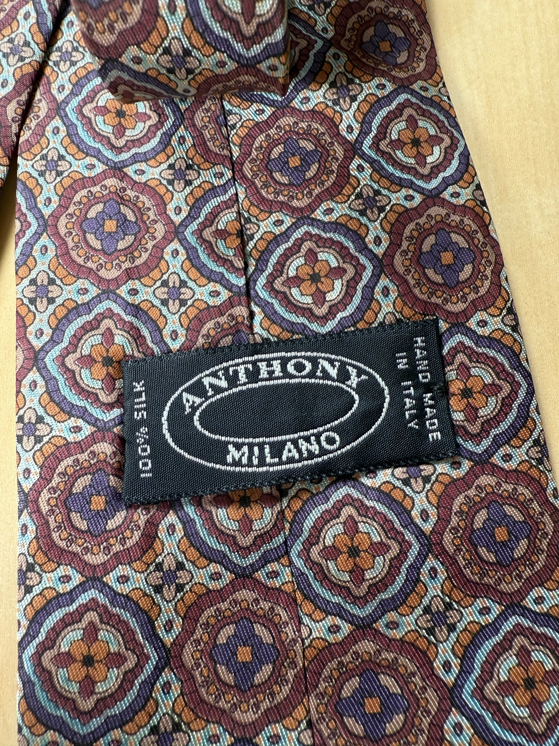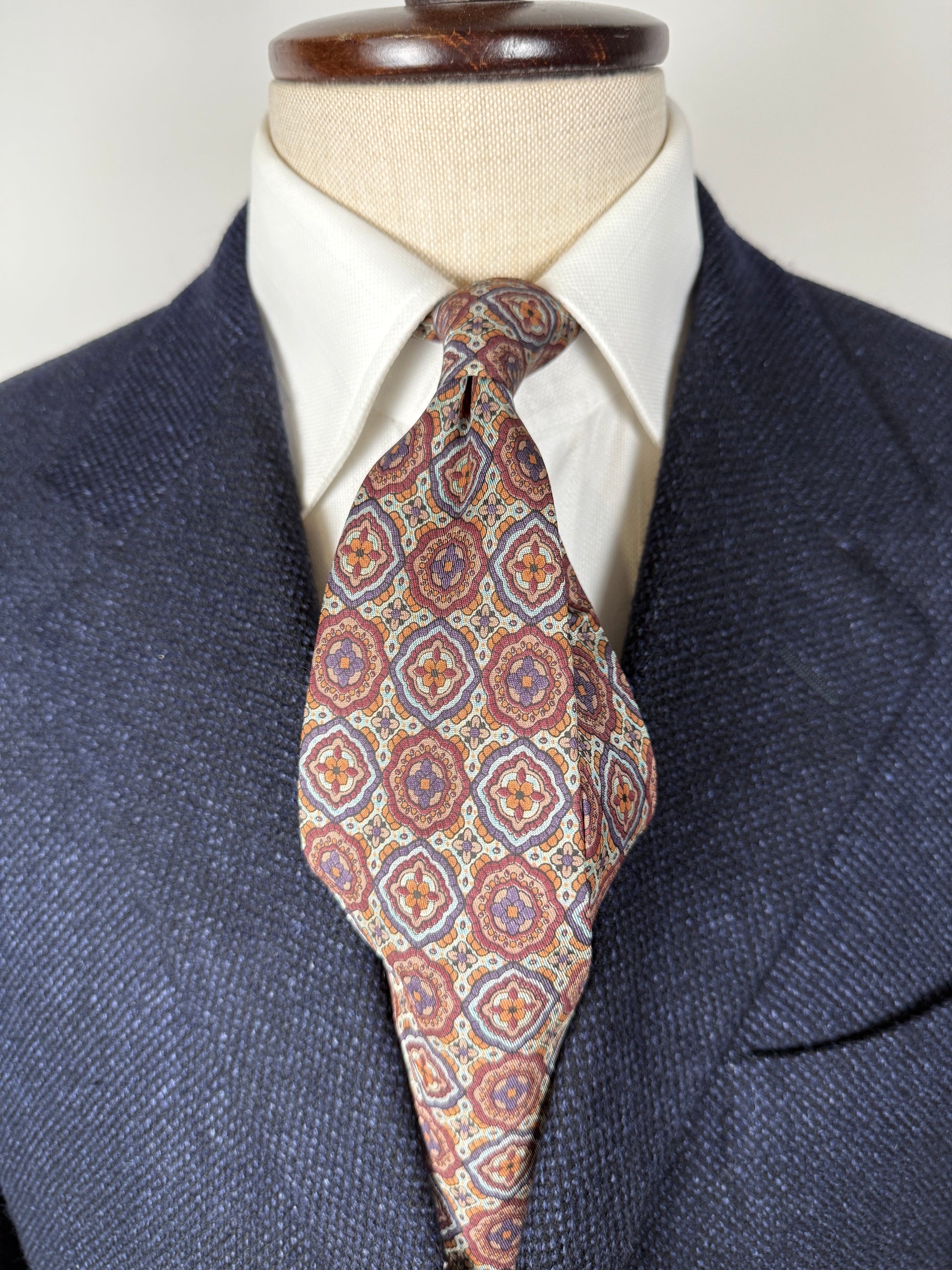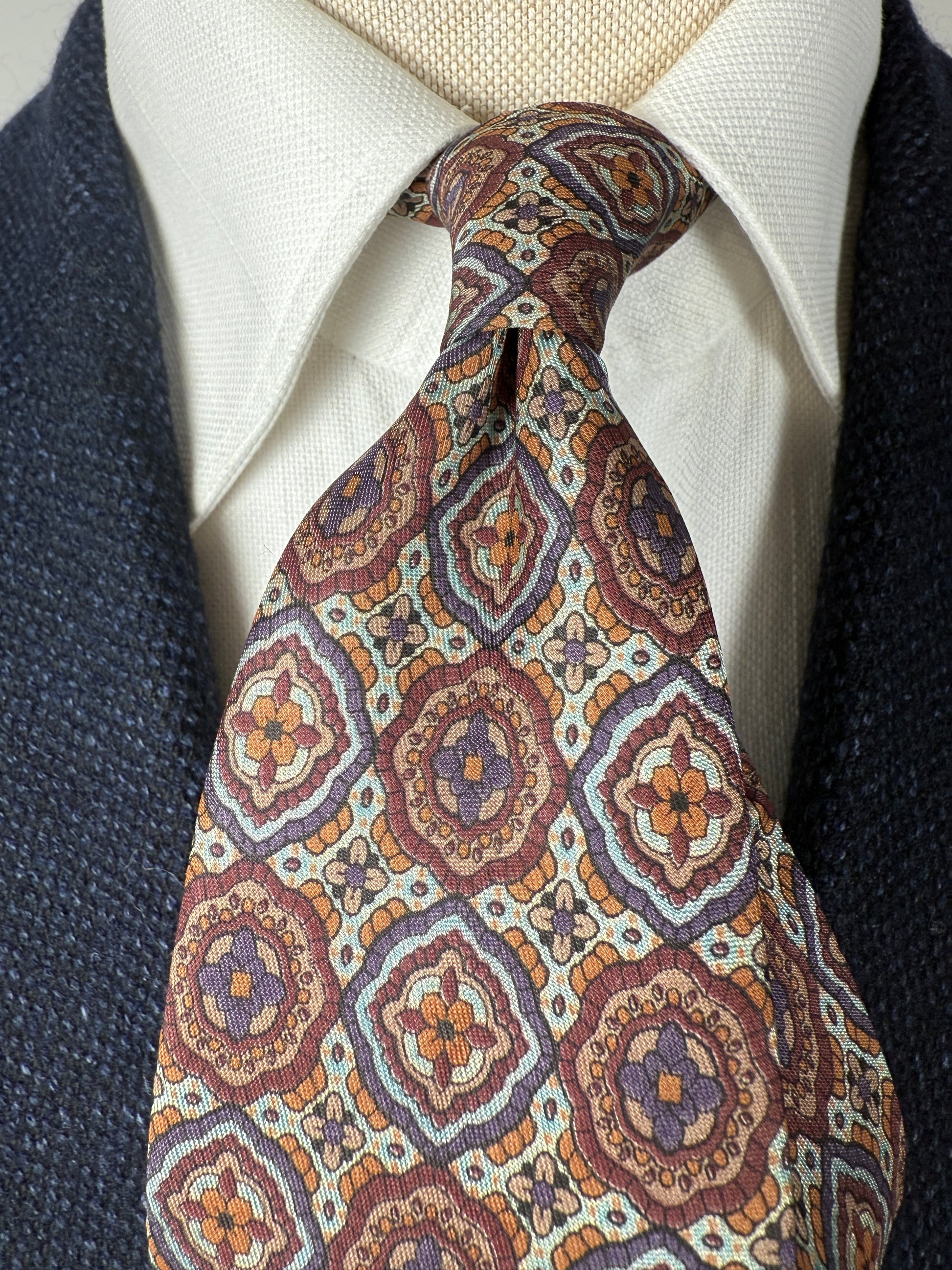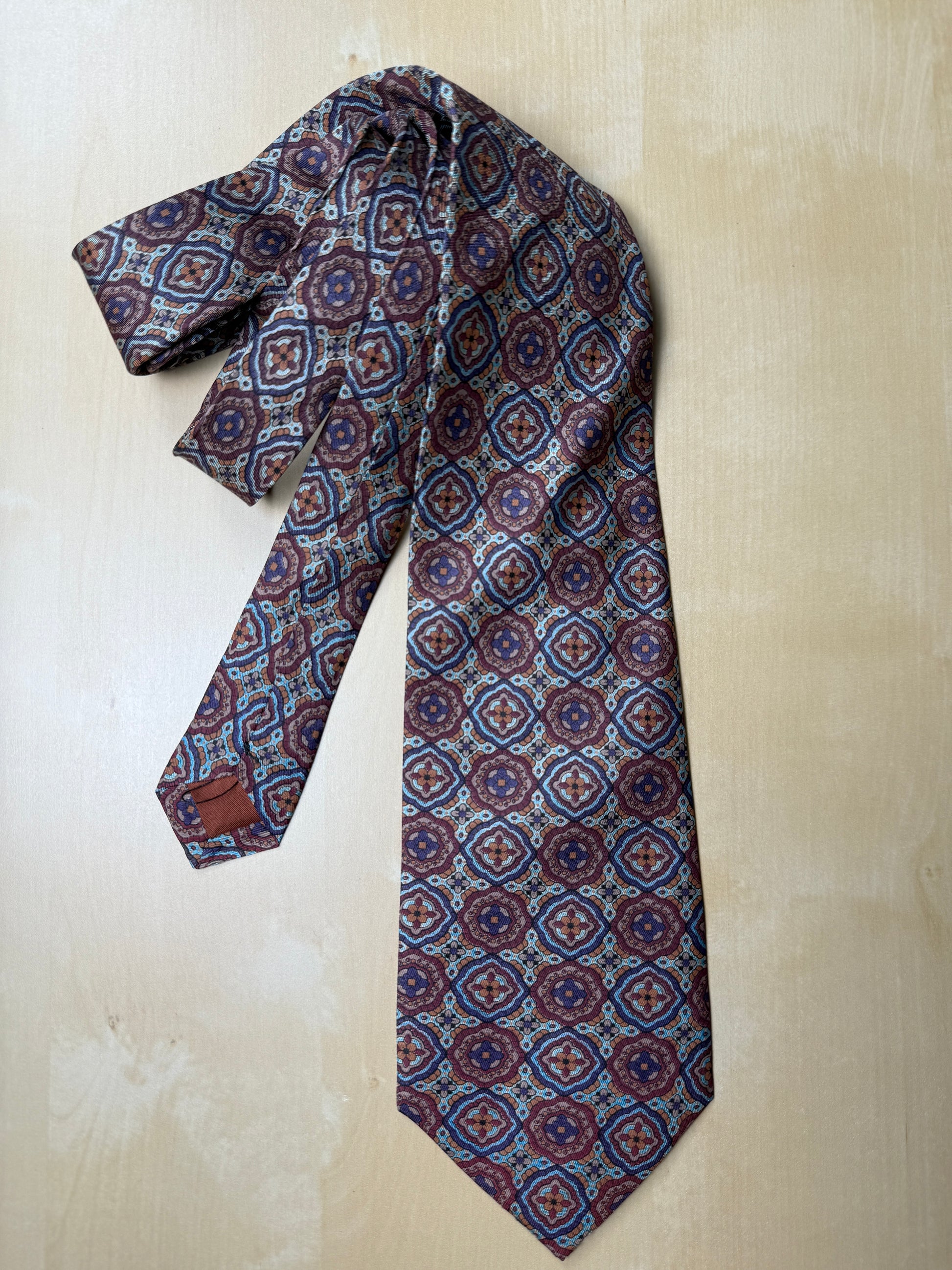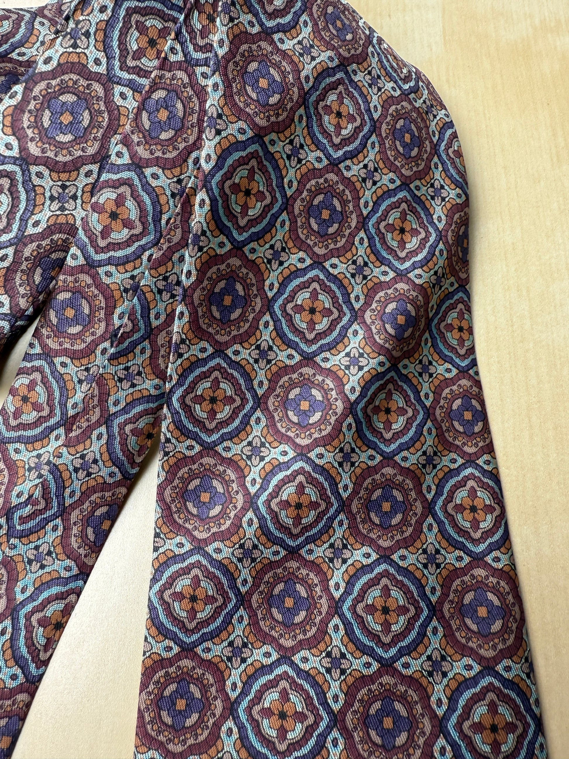 Cravatta in pura seta con fantasia geometrica a rosette mandala, nei toni del rosa, lilla, rosso bordeaux.