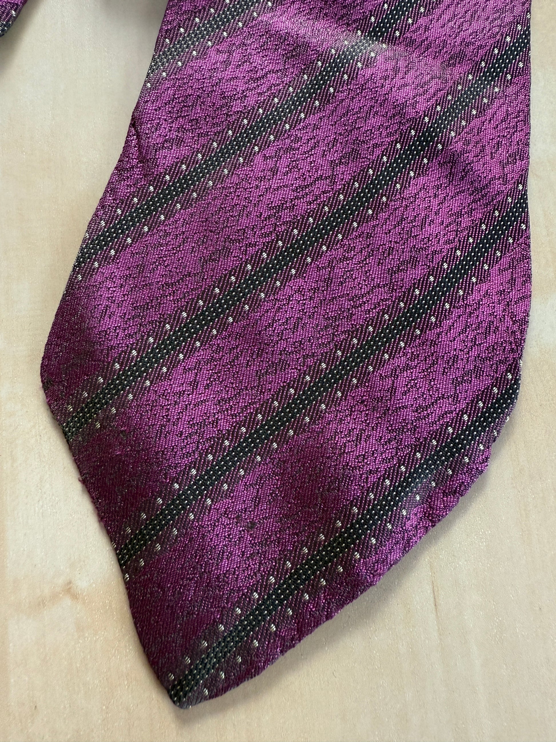 Cravatta vintage Hilton in crêpe di pura seta lavorata jacquard, bel colore fucsia con fantasia a righe marrone scuro.