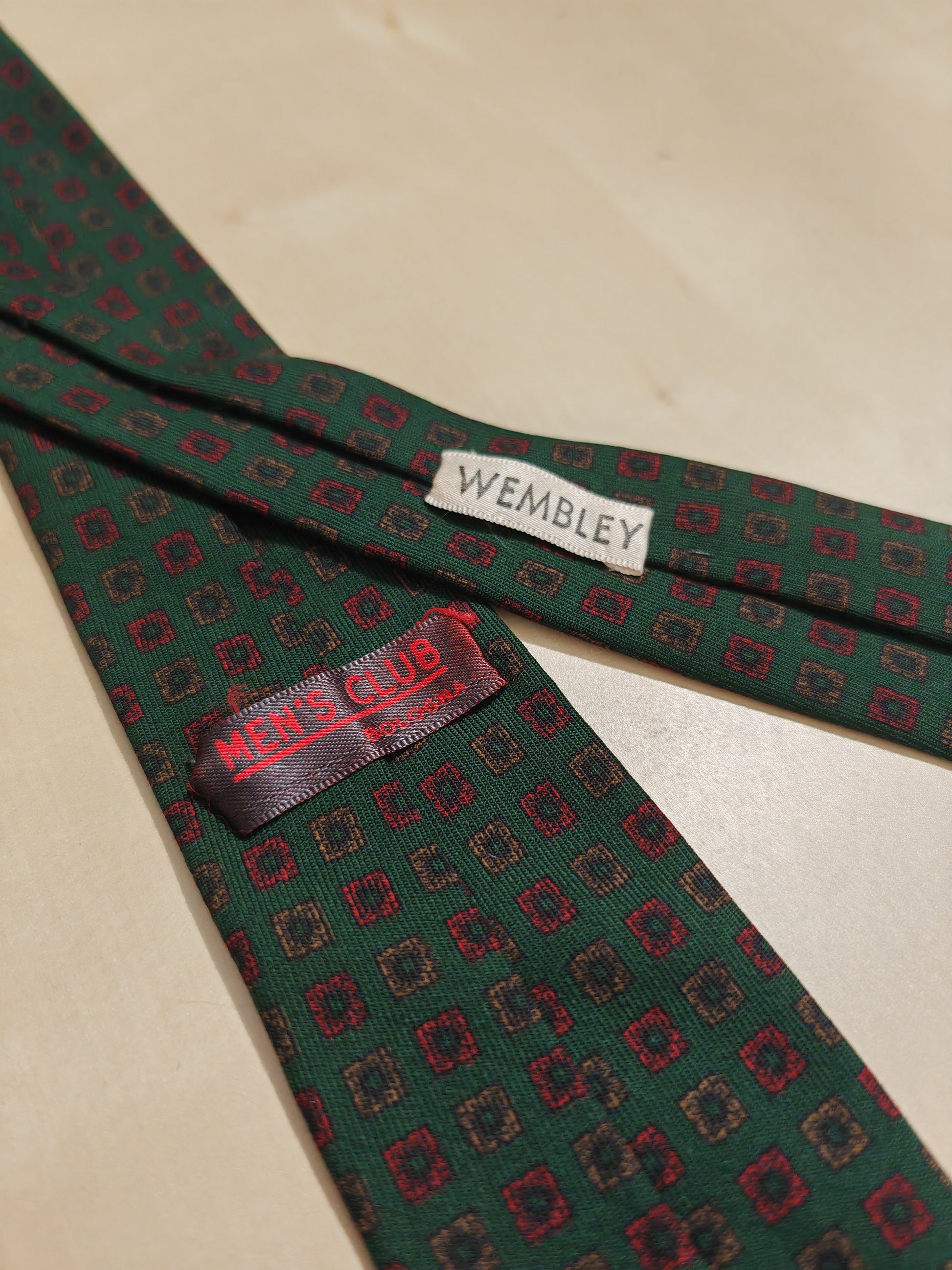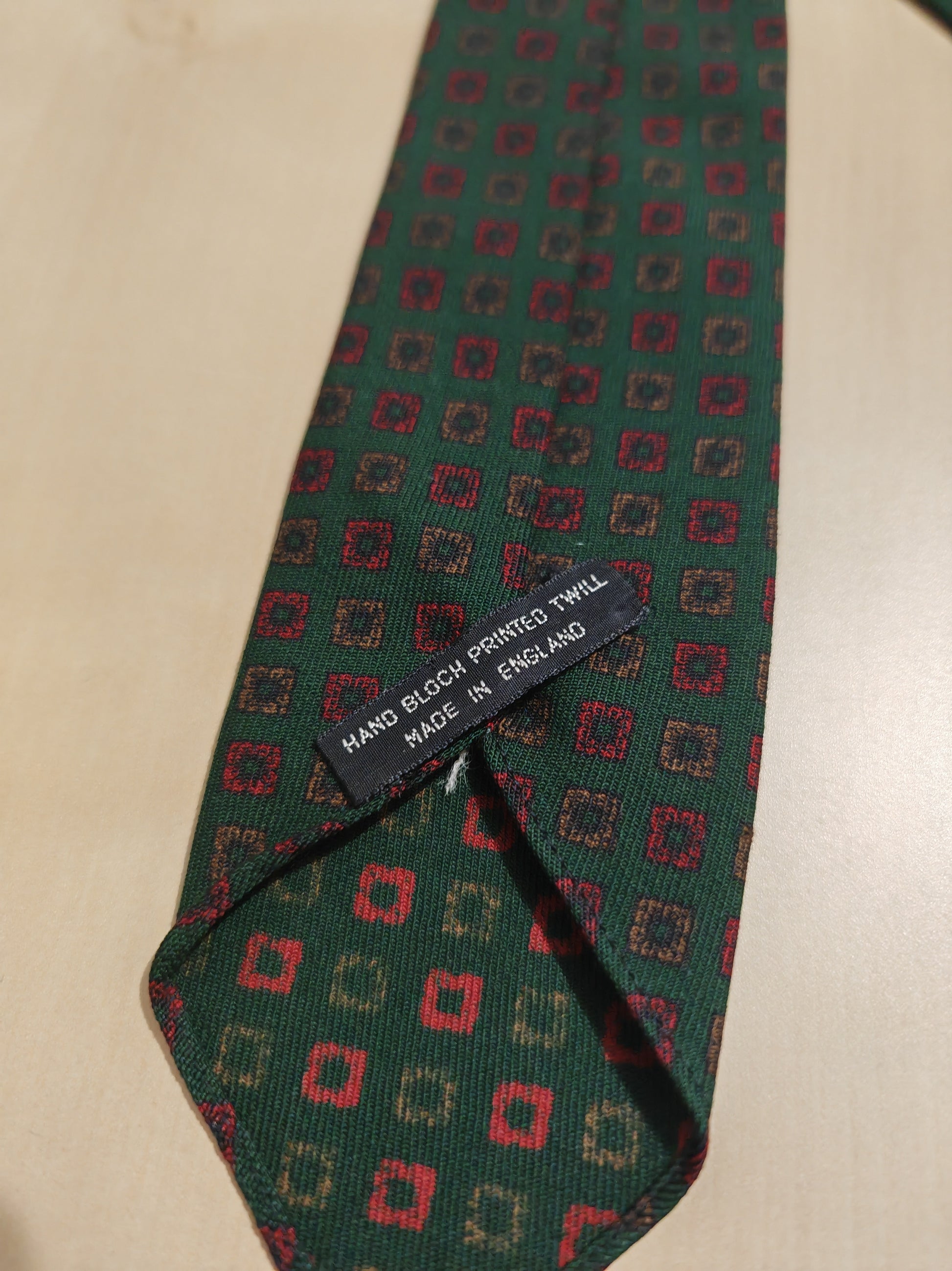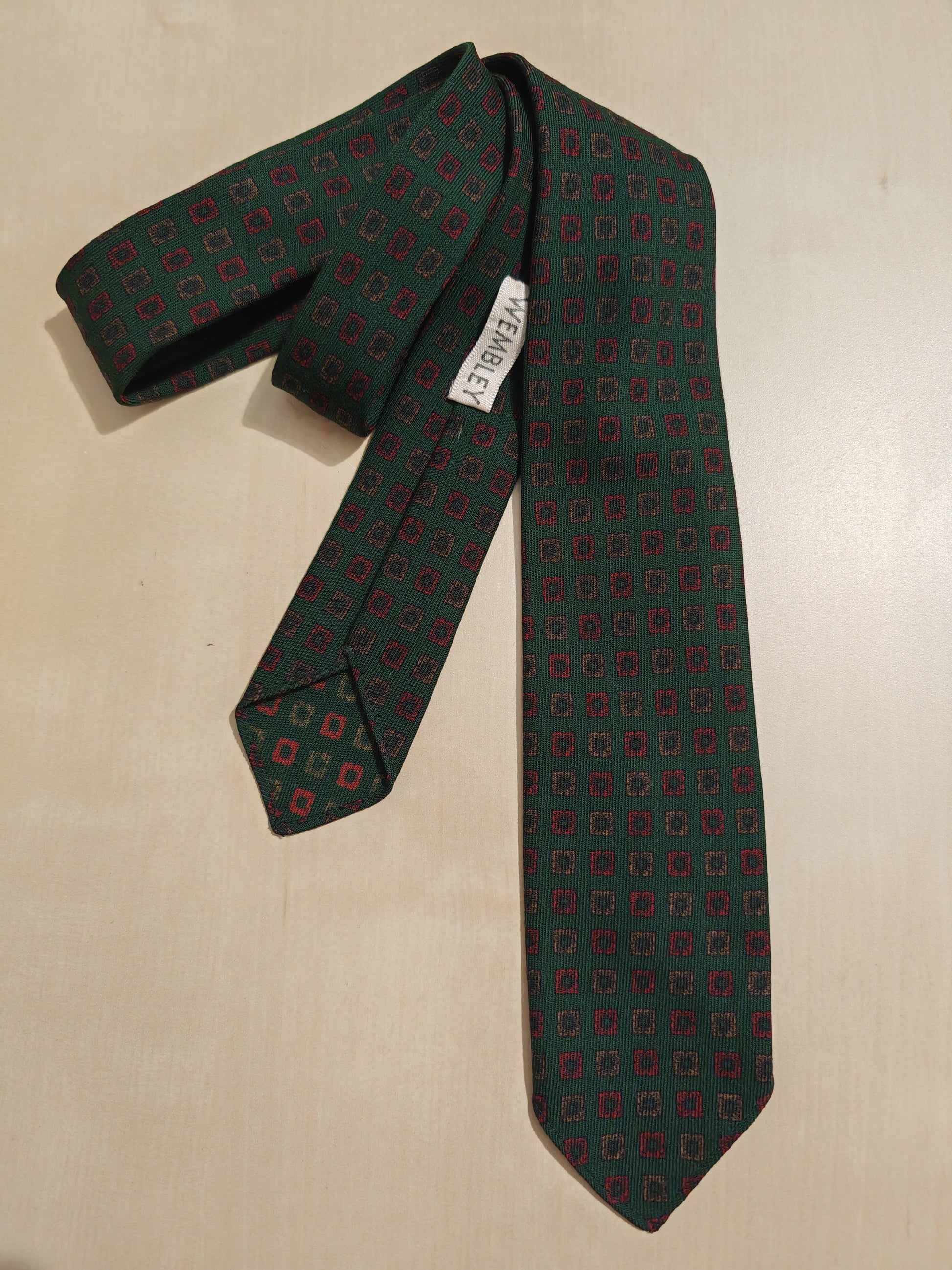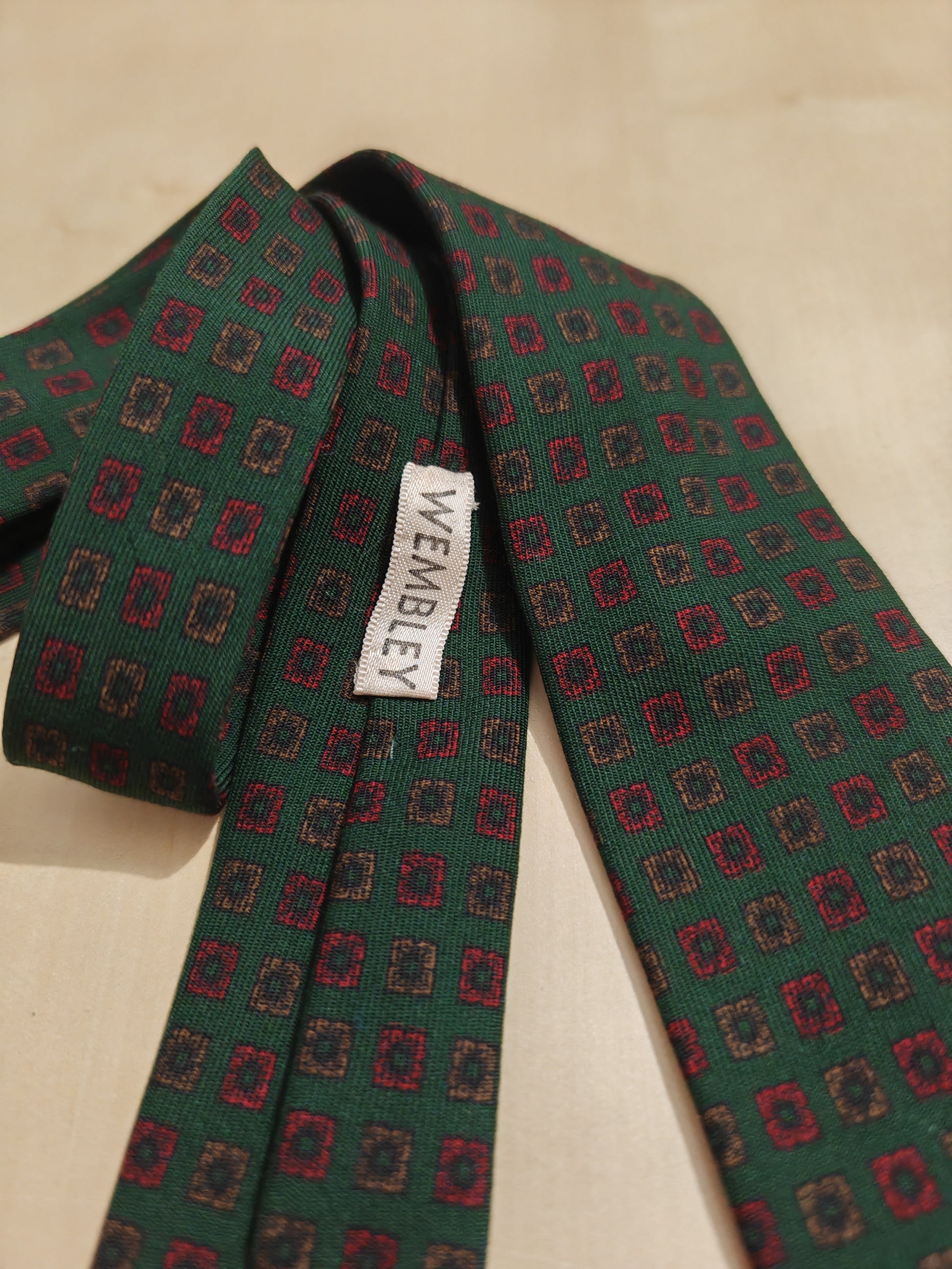 Cravatta Wembley vintage made in England, in flanella twill di lana pettinata (tessuto molto fine) con stampa hand block (cioè, tessuto stampato a mano con stampi in legno).