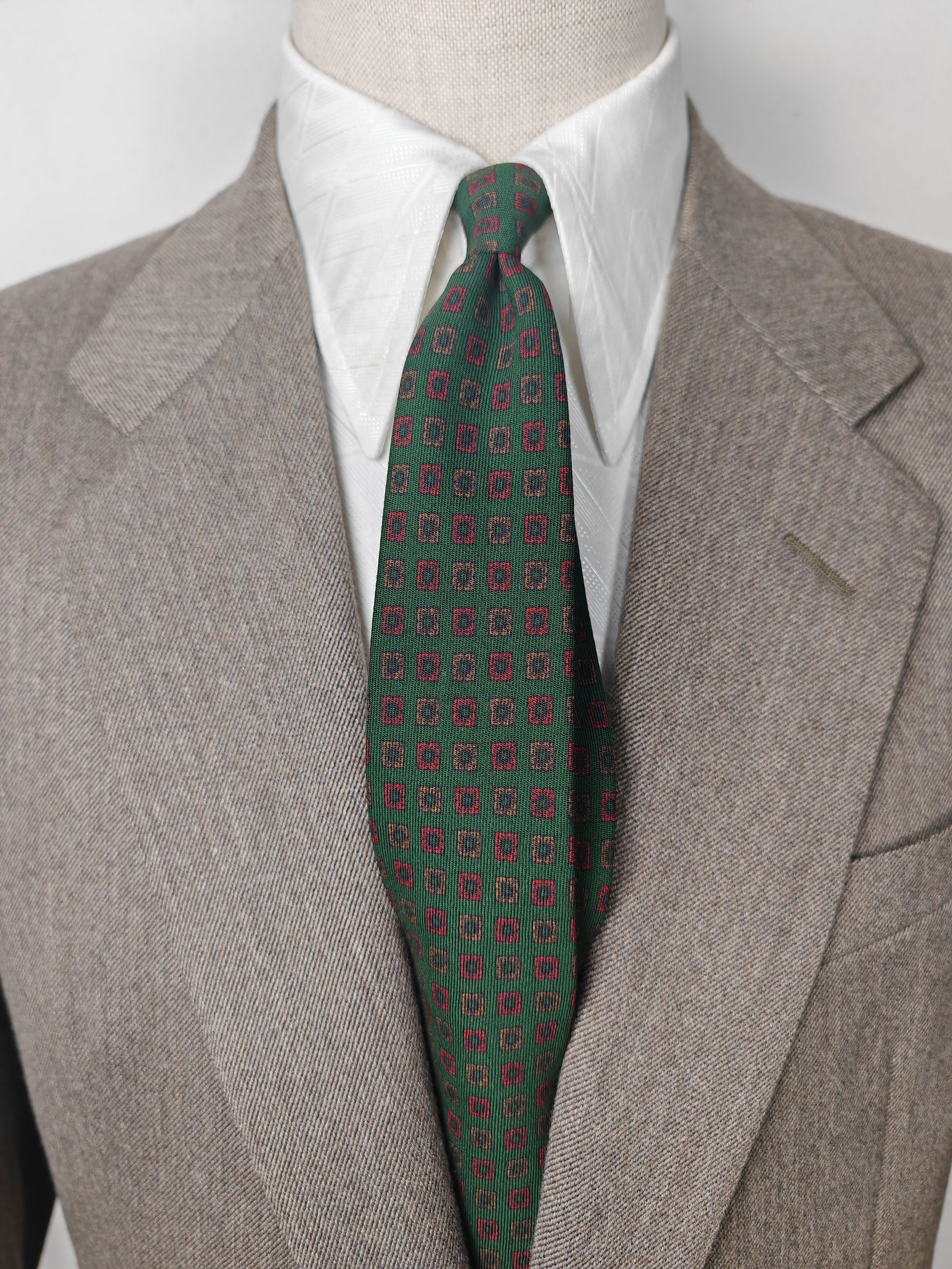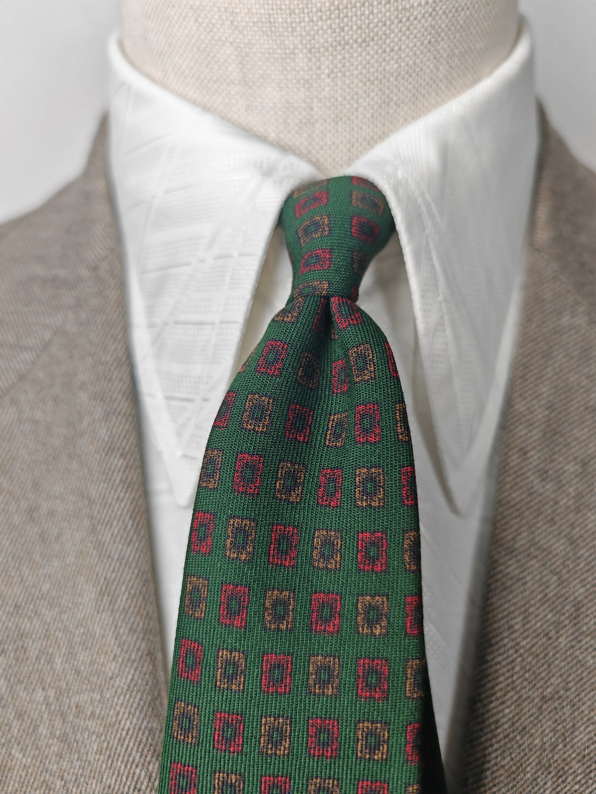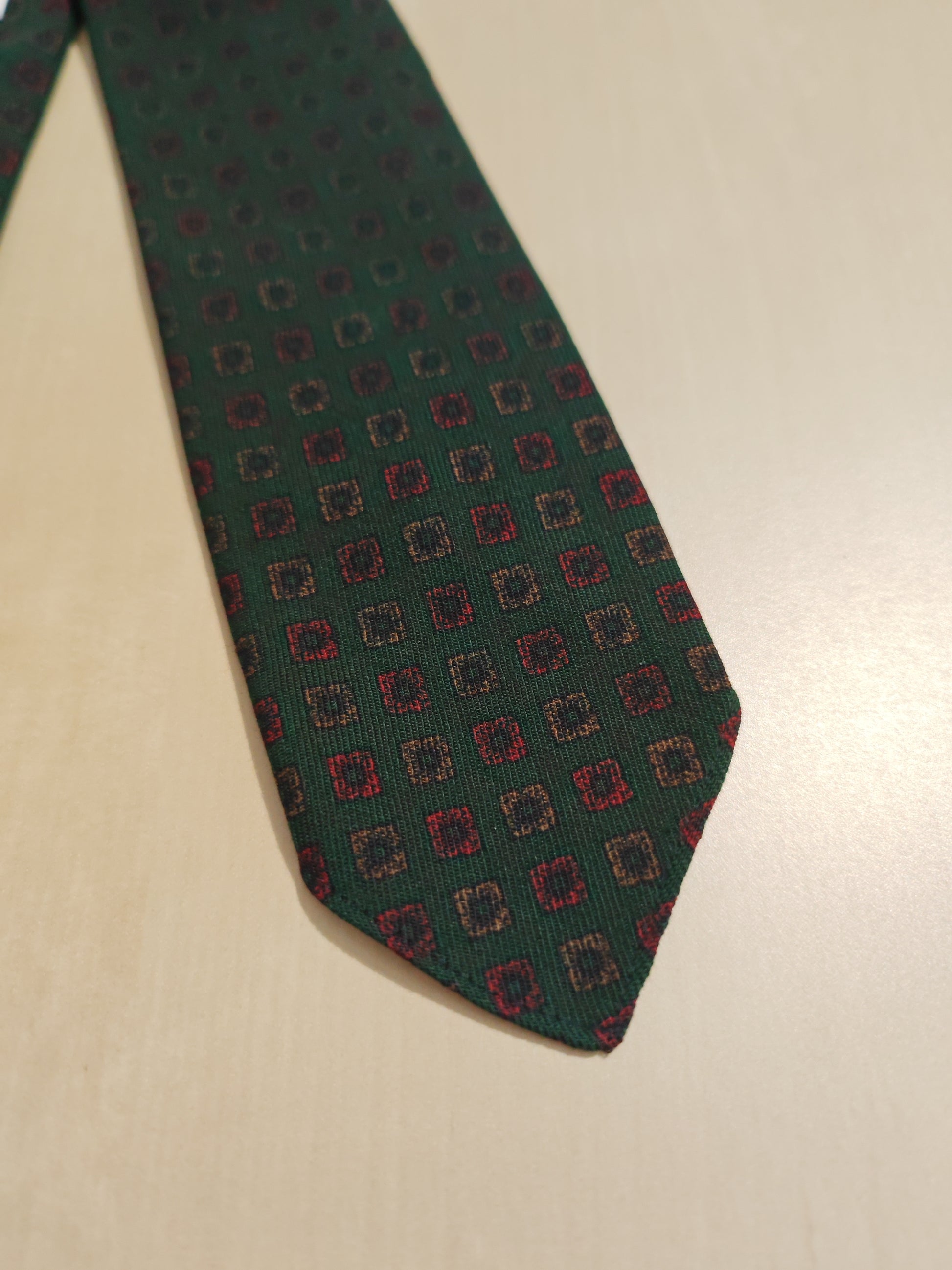 Verde scuro con micro fantasia geometrica in rosso.