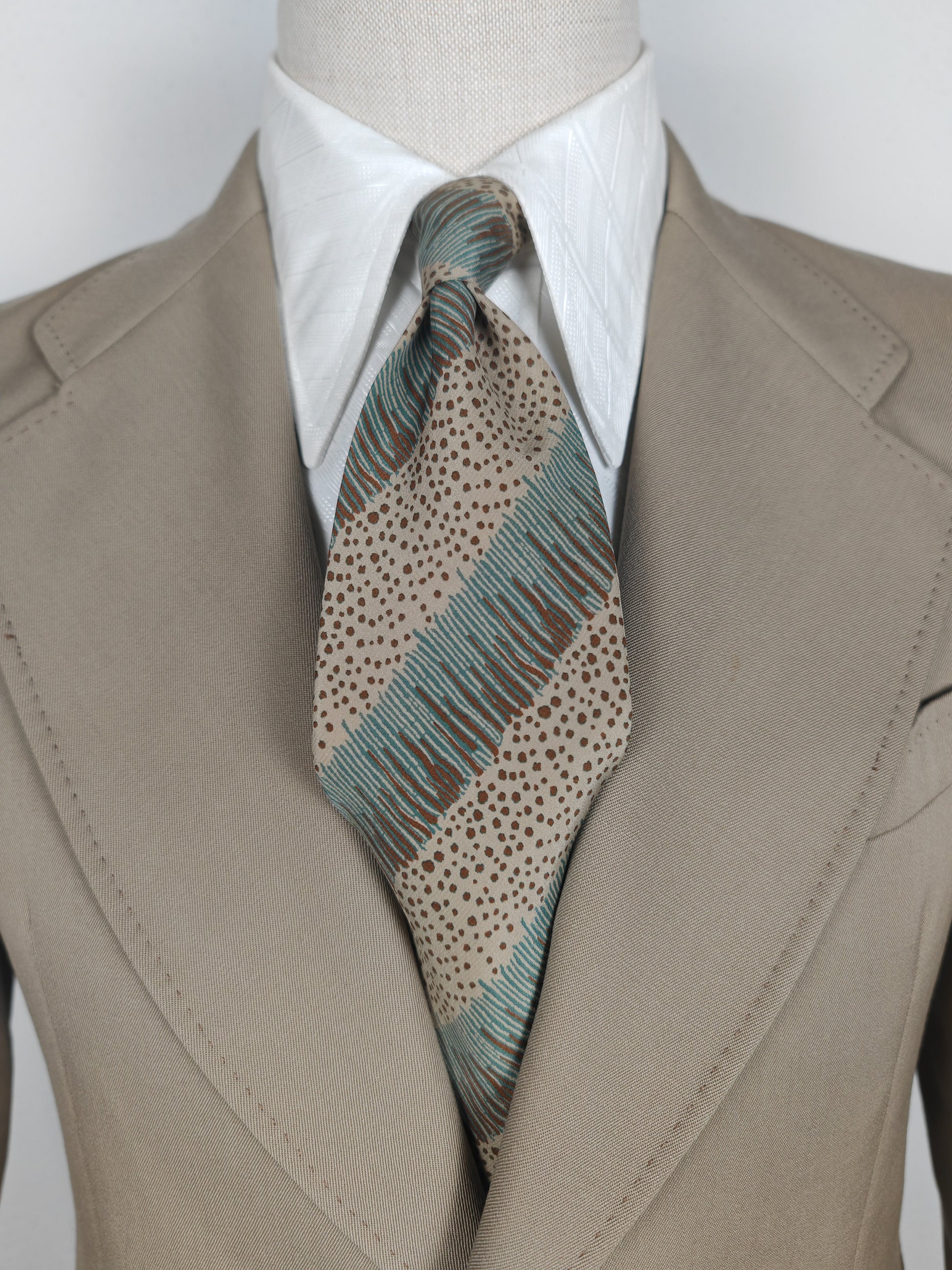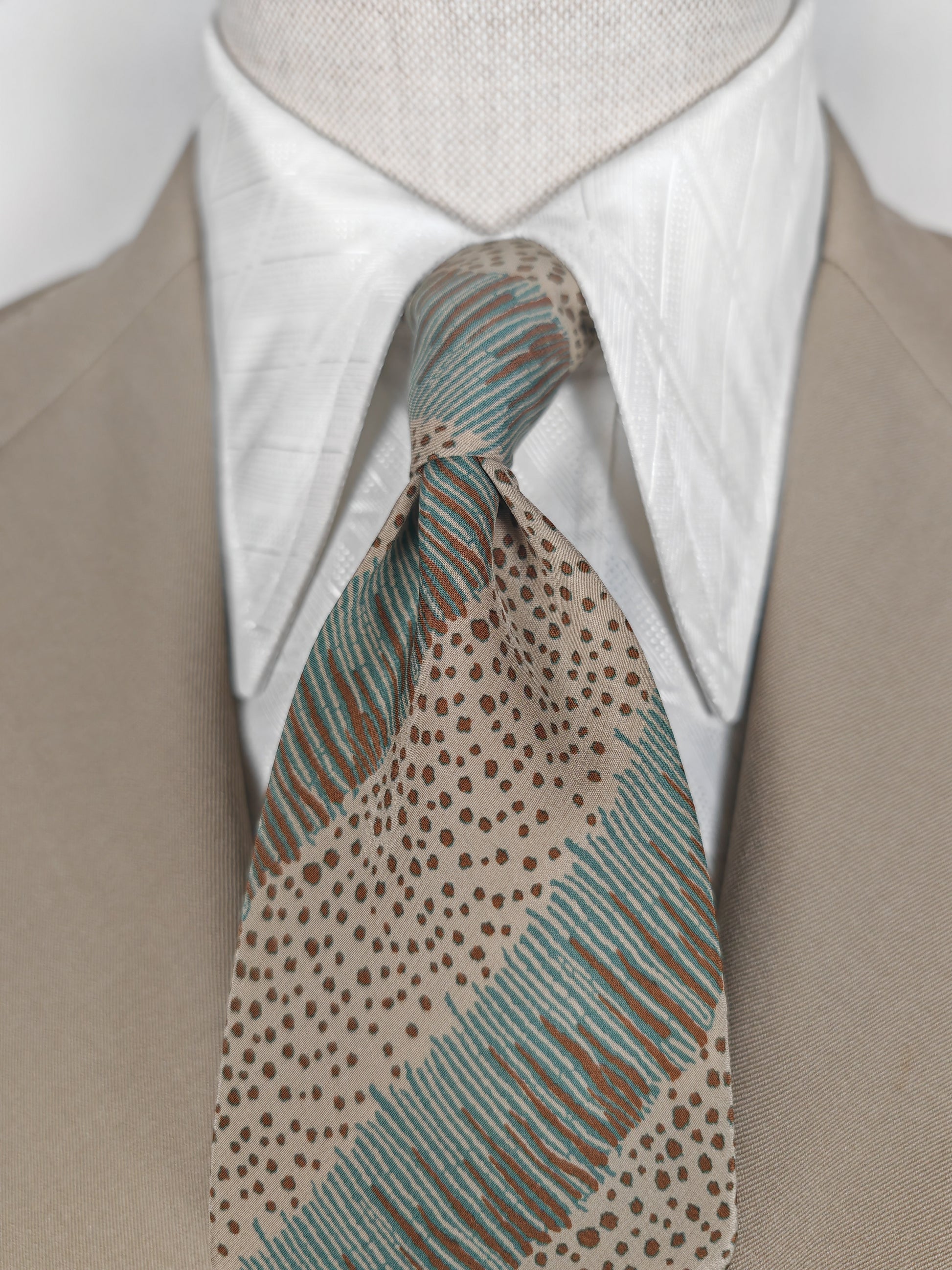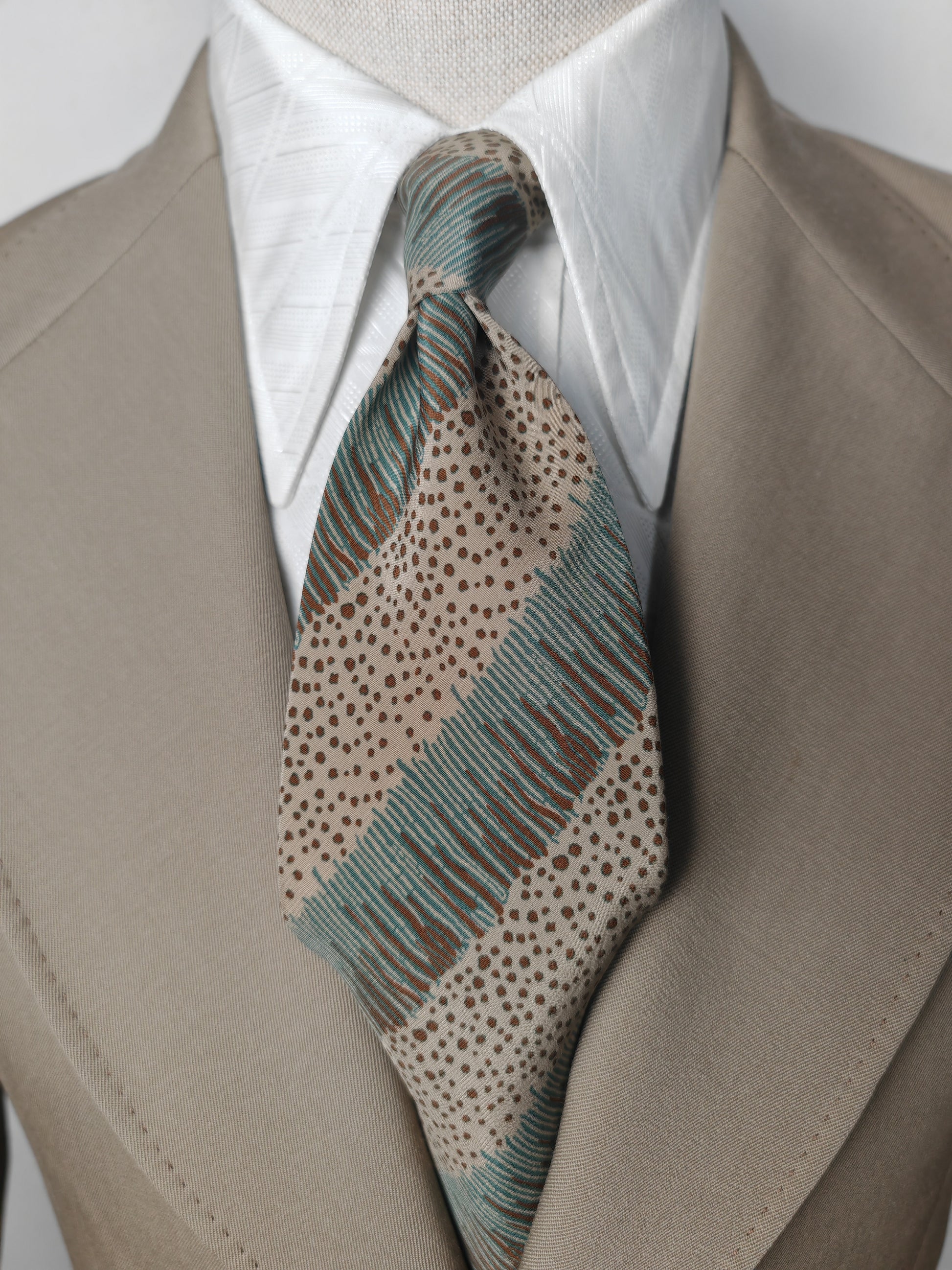 Fantasia con righe diagonali e texture astratta, colori verde salvia, beige cachi e marrone.