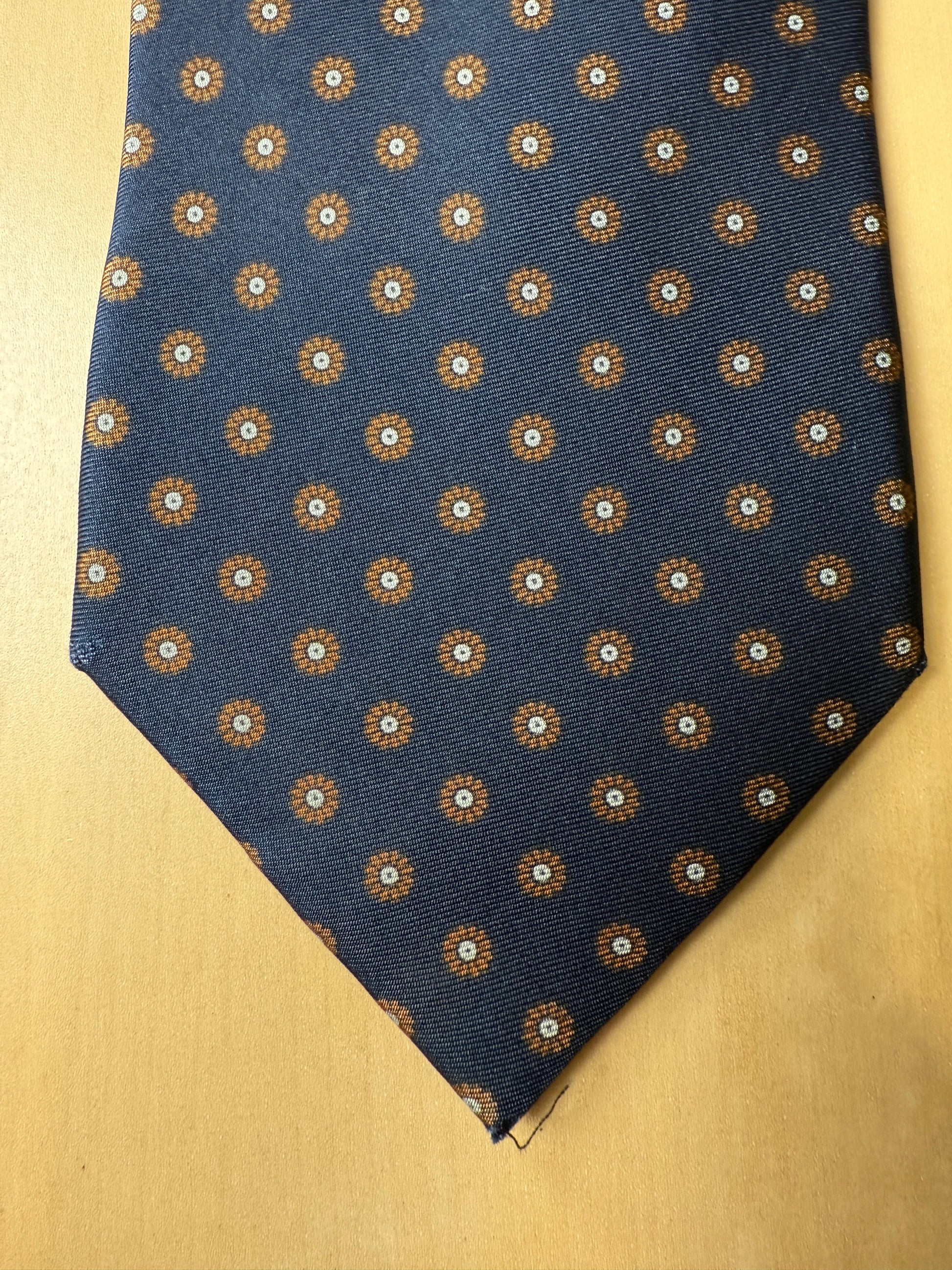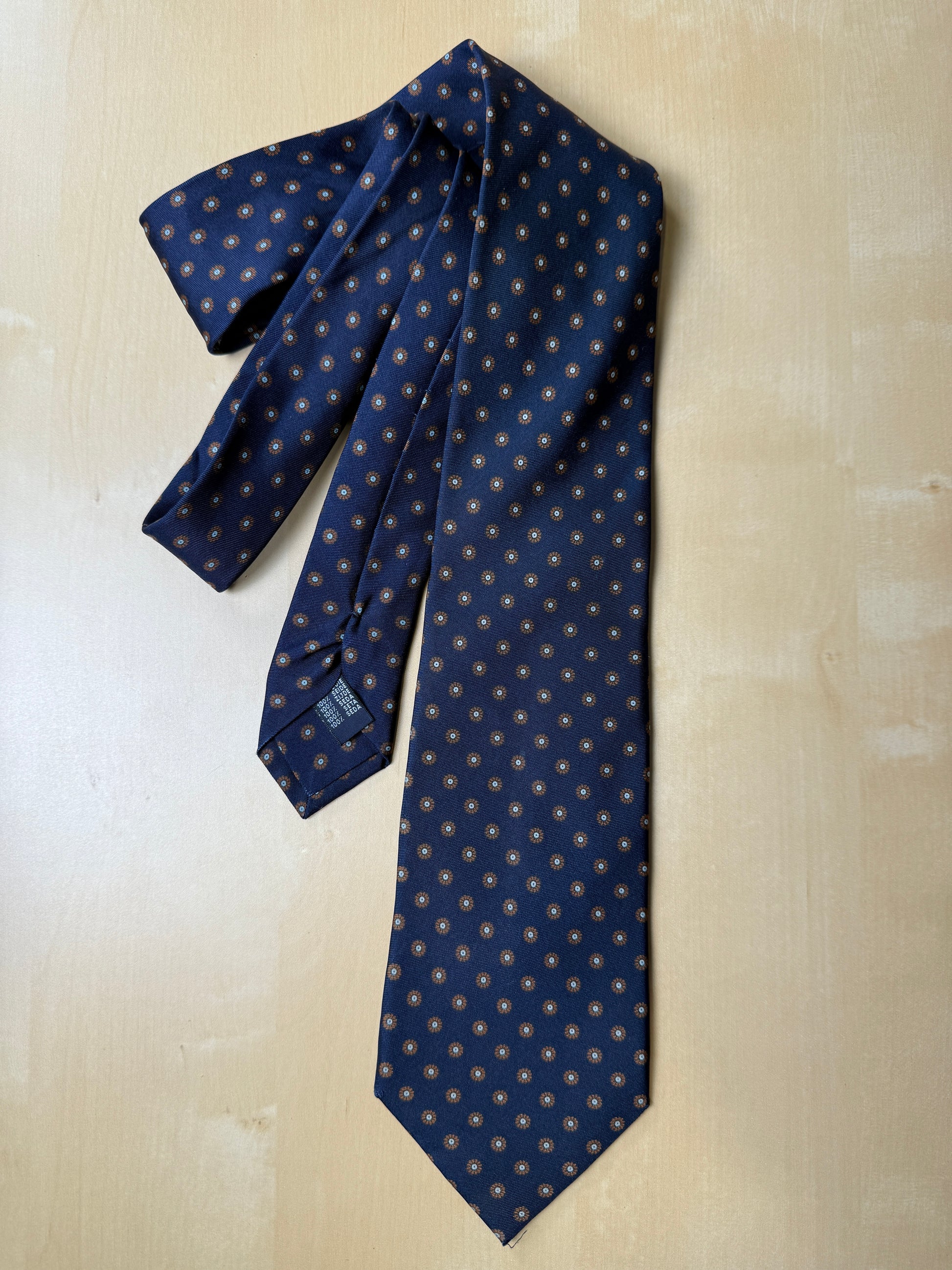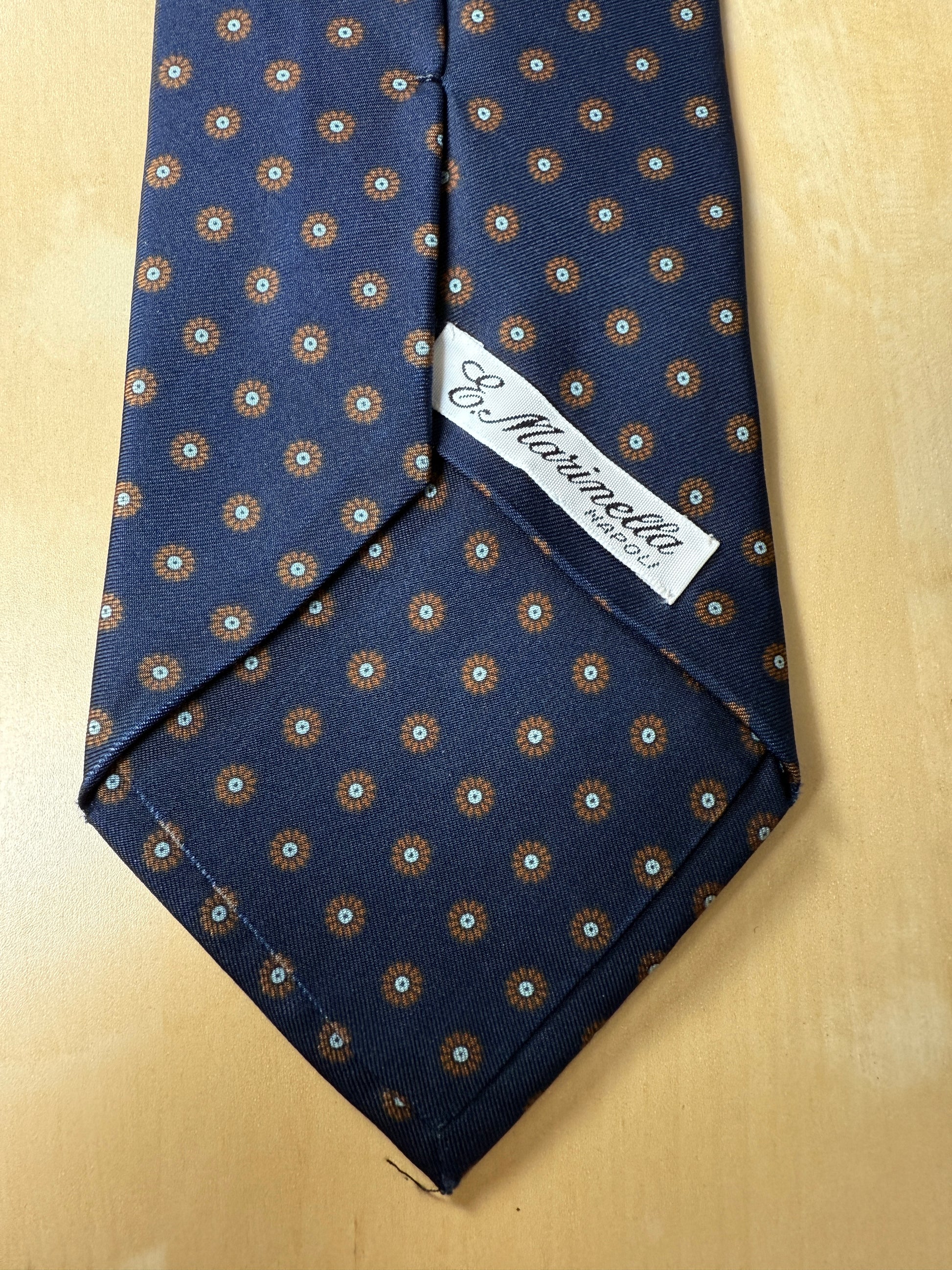 Cravatta Marinella in pura seta blu navy con micro fantasia a rosette/fiorellini in marrone e bianco.