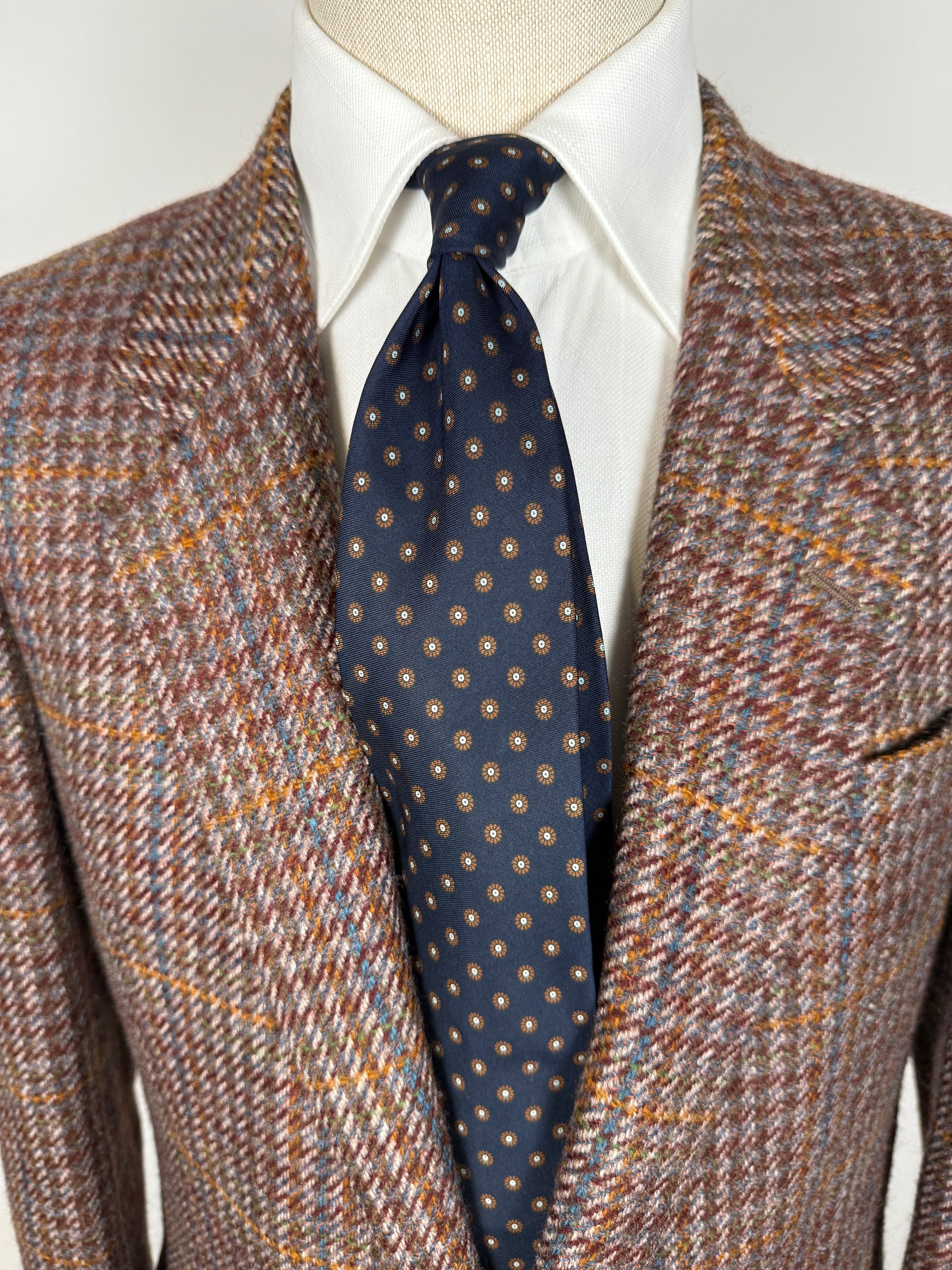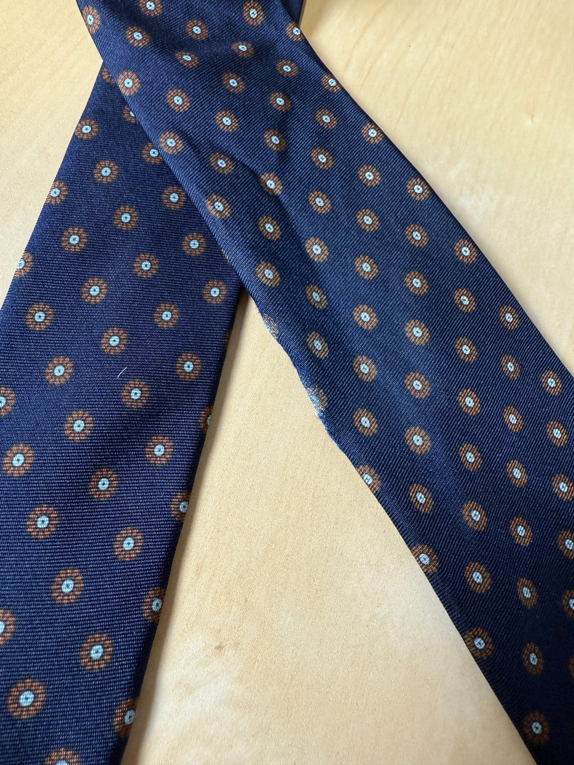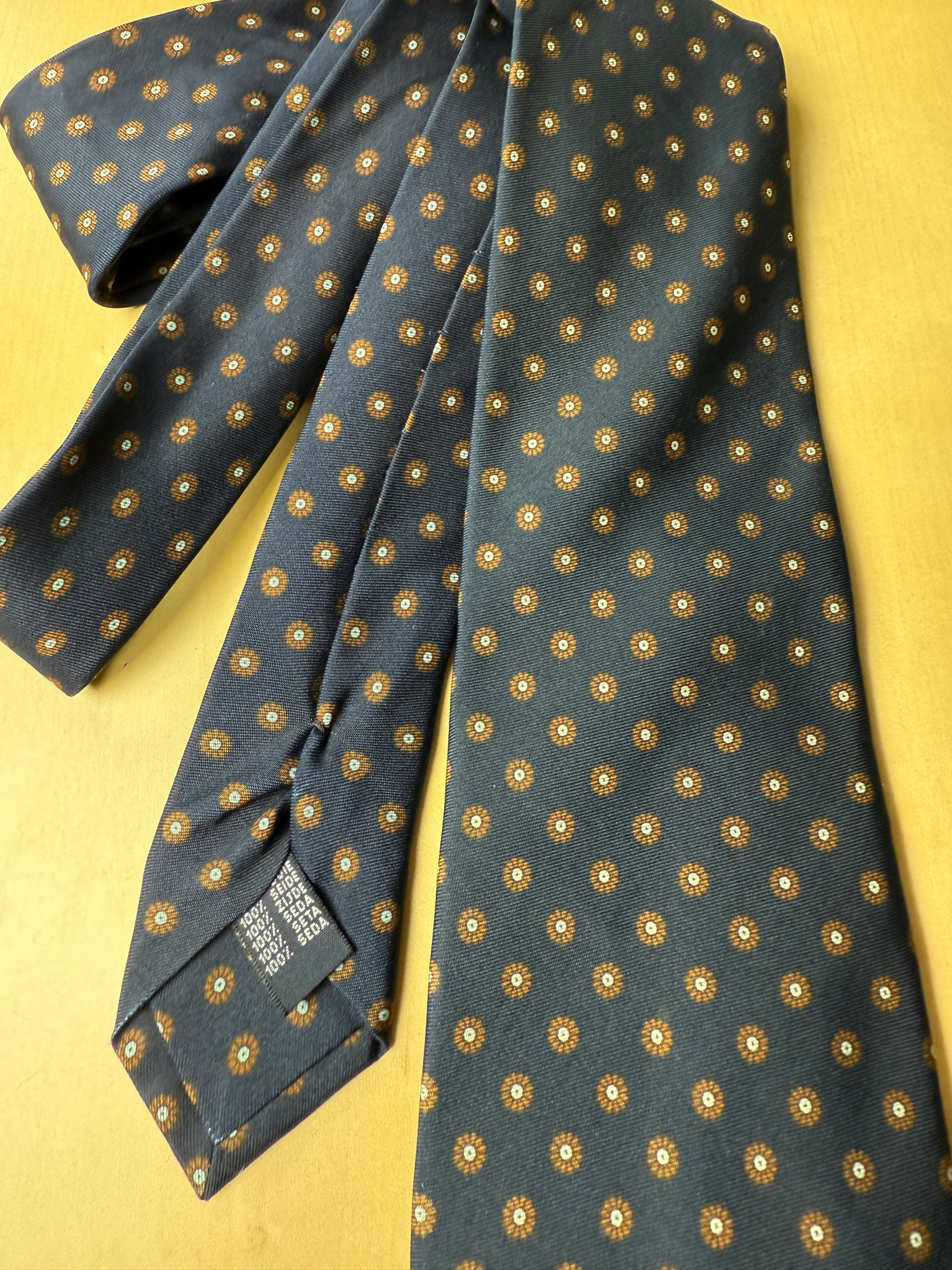 Cravatta Marinella in pura seta blu navy con micro fantasia a rosette/fiorellini in marrone e bianco.
