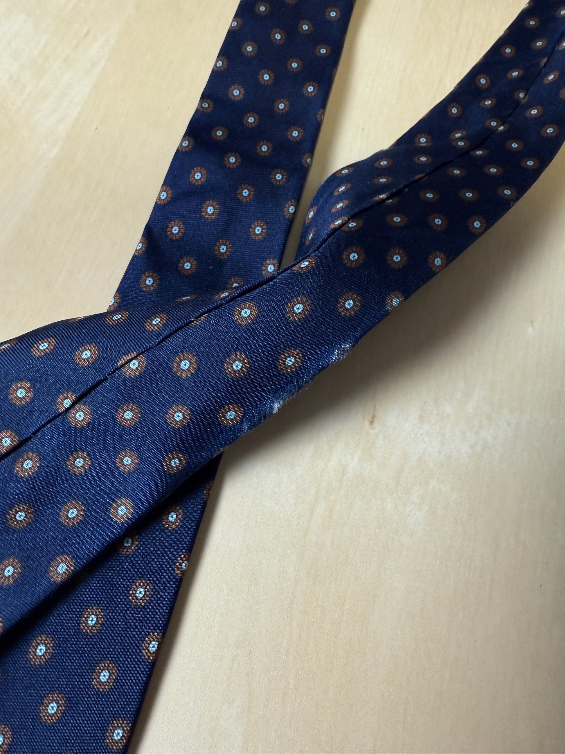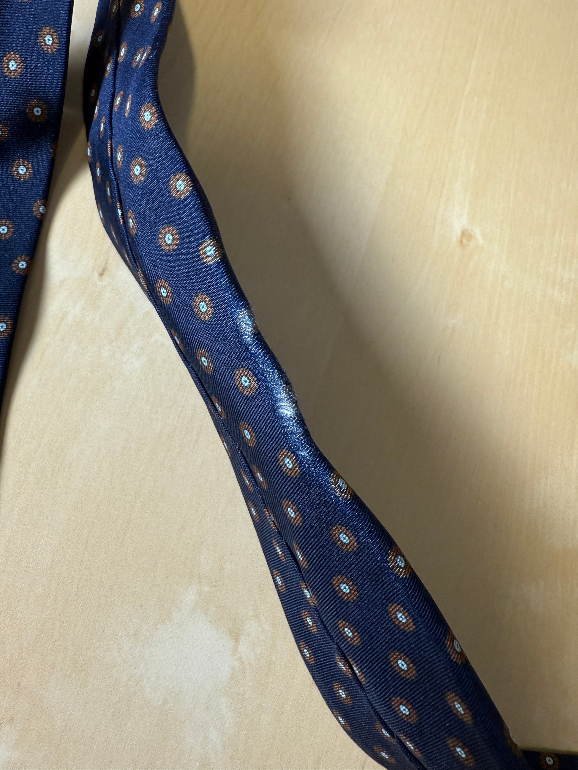 La cravatta presenta un difetto di usura sulla parte stretta in corrispondenza del nodo (vedere foto): è ancora comunque indossabile, mascherando il difetto con un nodo adeguato.