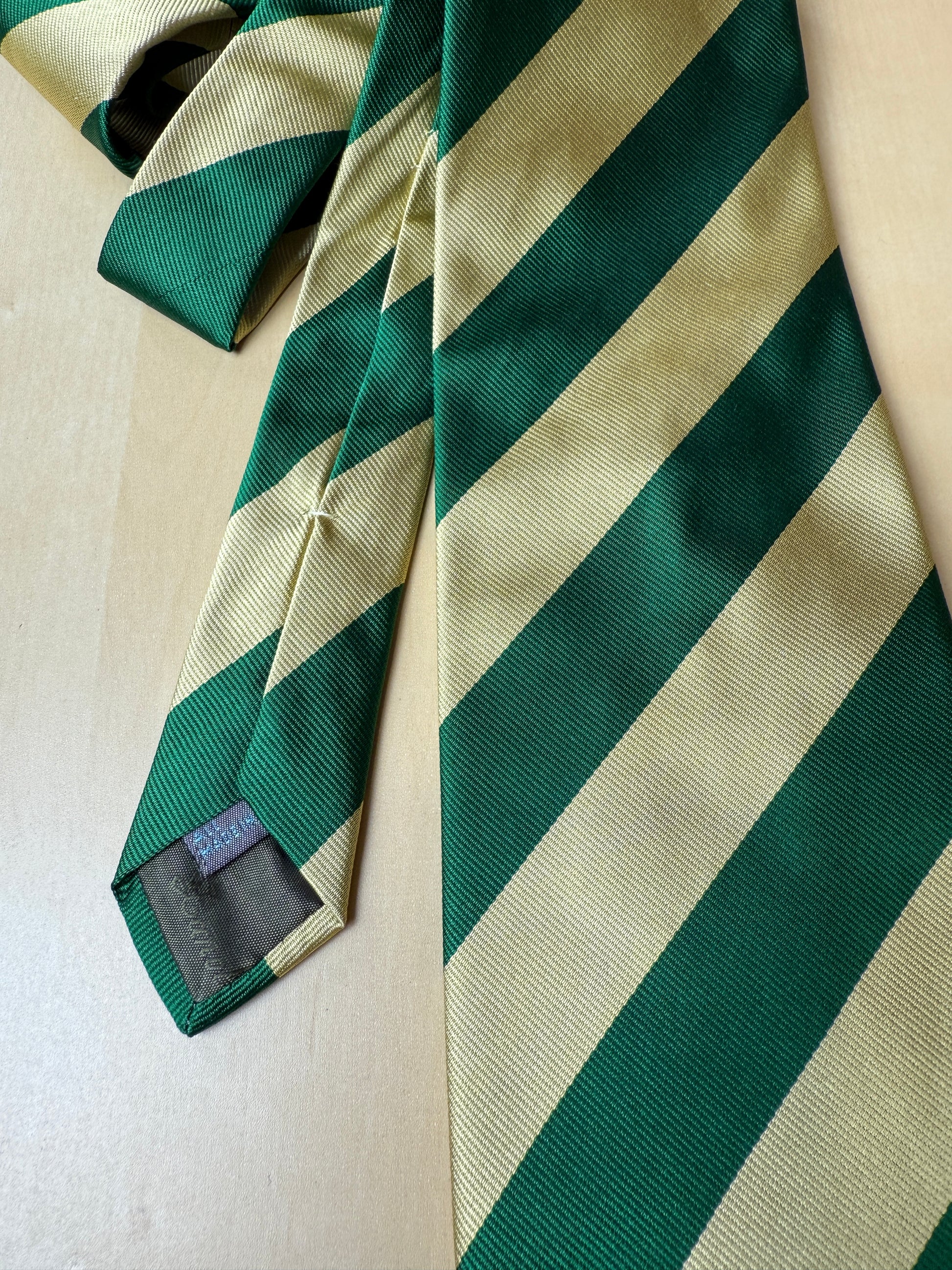 Cravatta Zanolini in pura seta micro cannettata, fantasia a righe regimental verde e giallo oro.