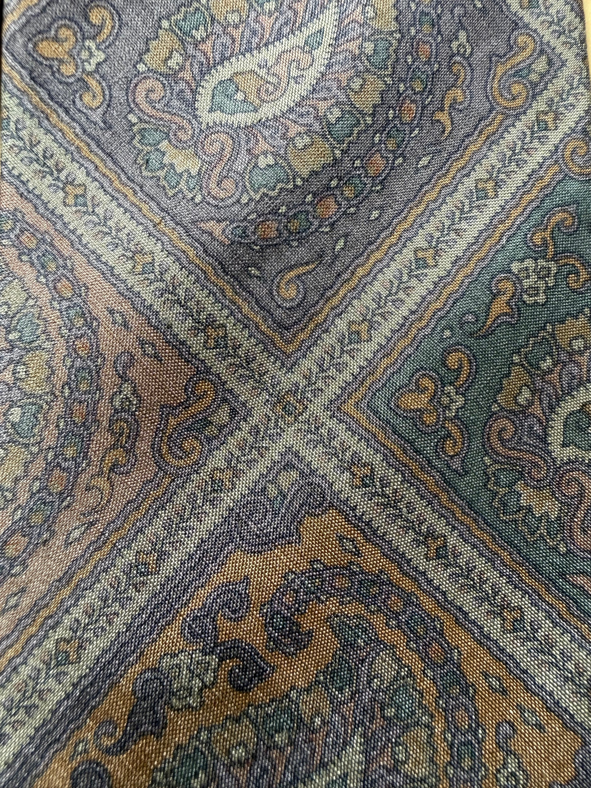 Fantasia paisley sulle tinte pastello del lilla, rosa antico e beige, inscritta dentro a losanghe. Con tipica firma obliqua sul codino.