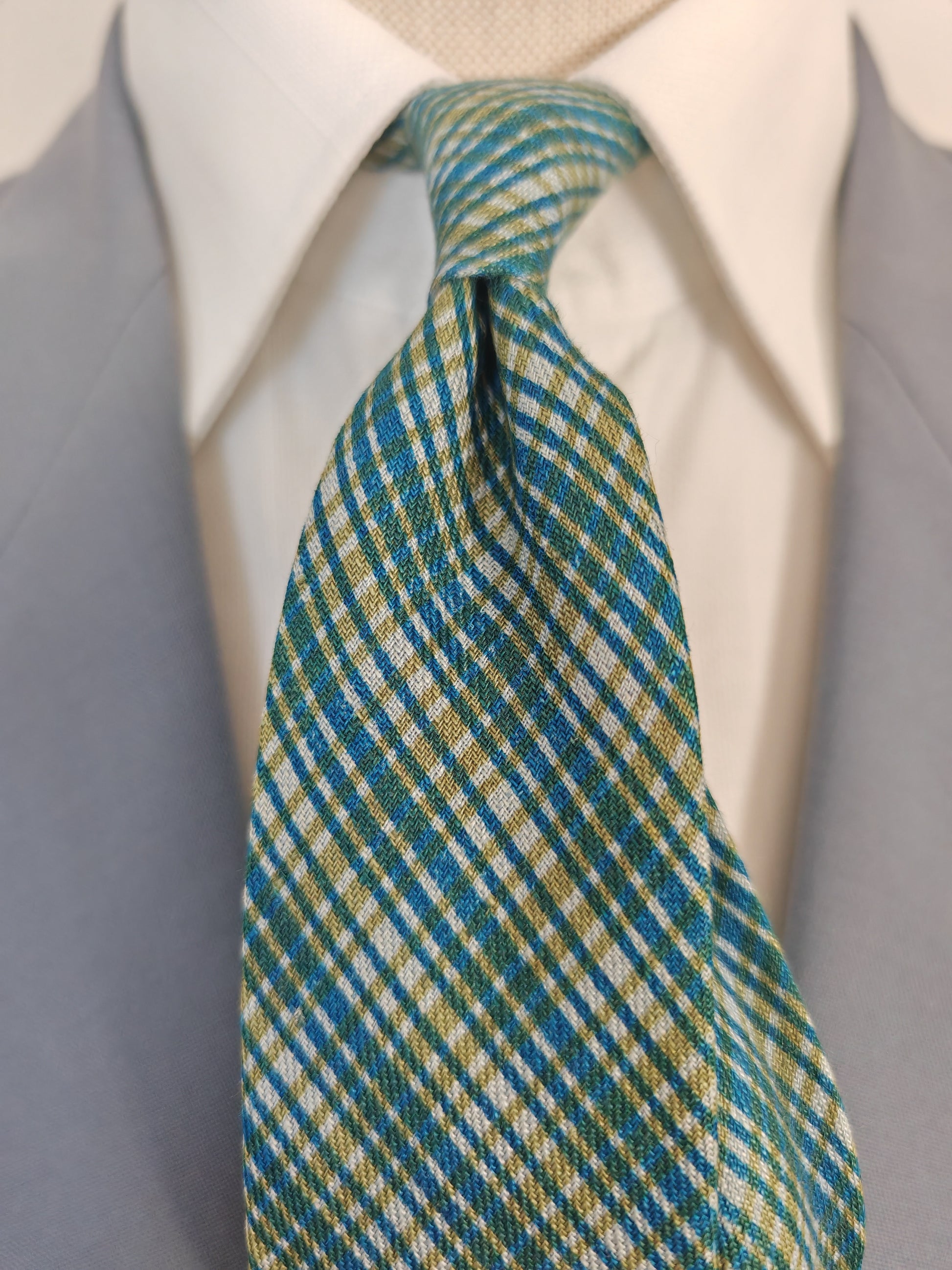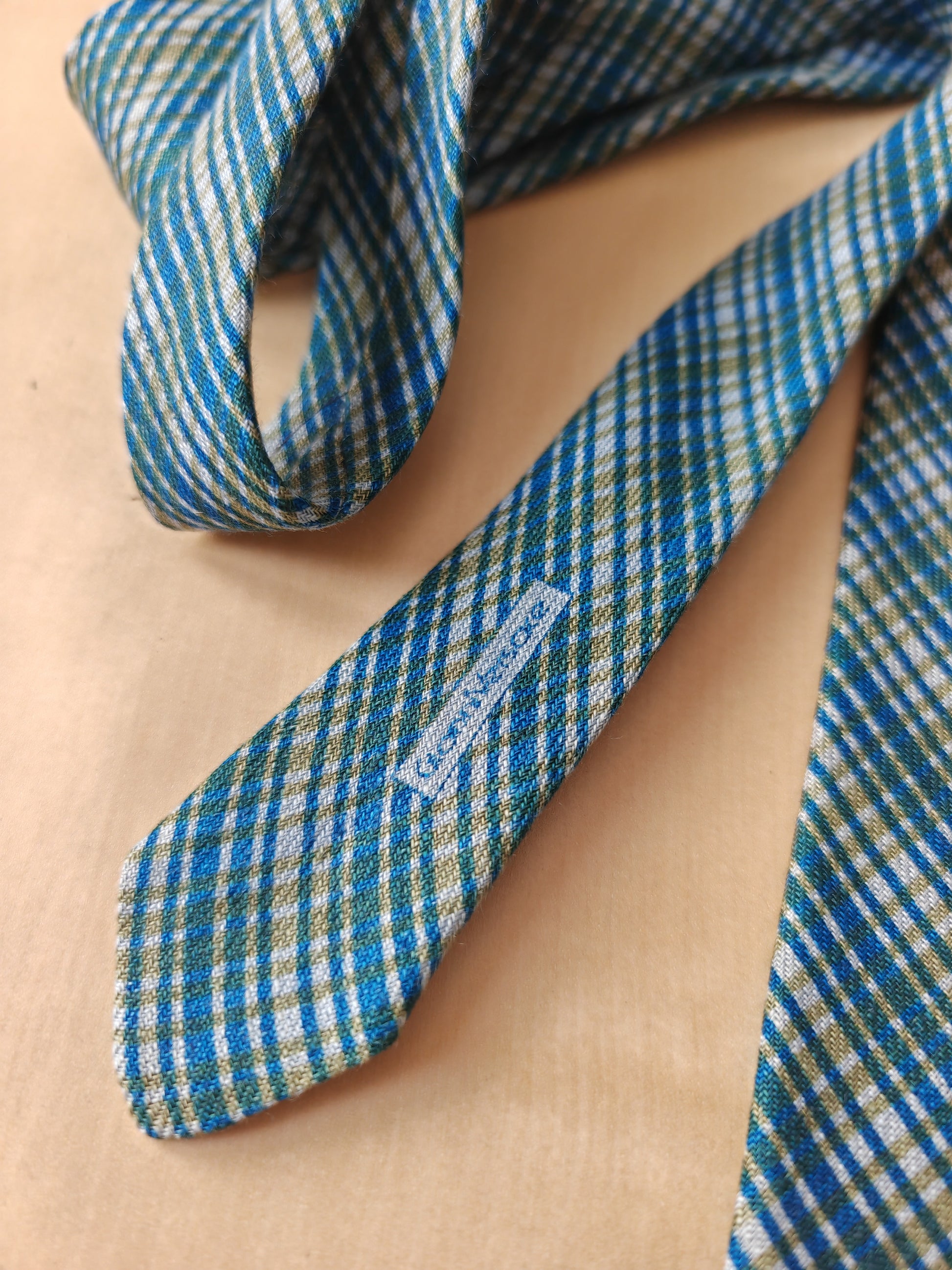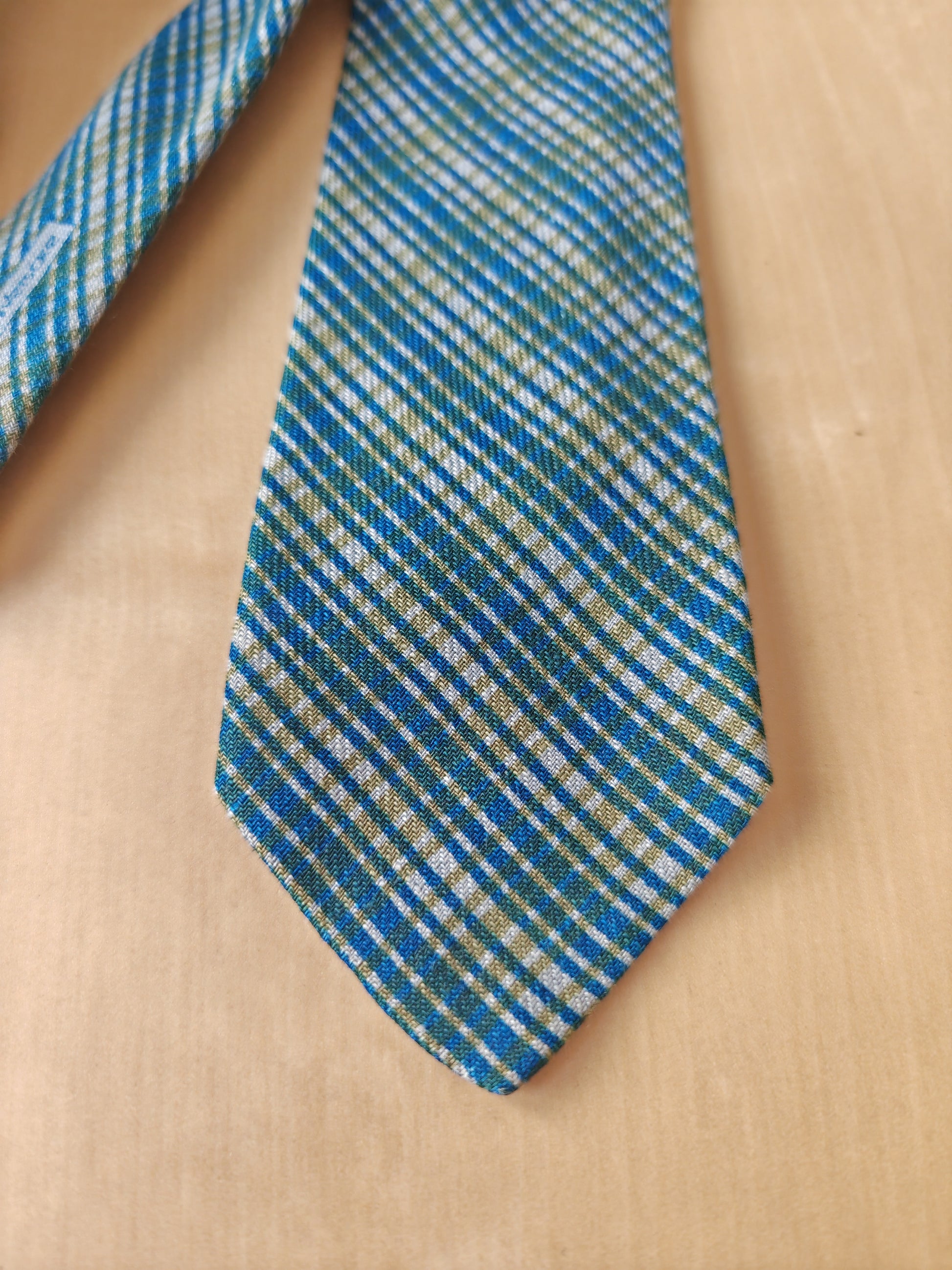 Cravatta Versace vintage con fantasia a reticolo, colori azzurro e verde acquamarina.