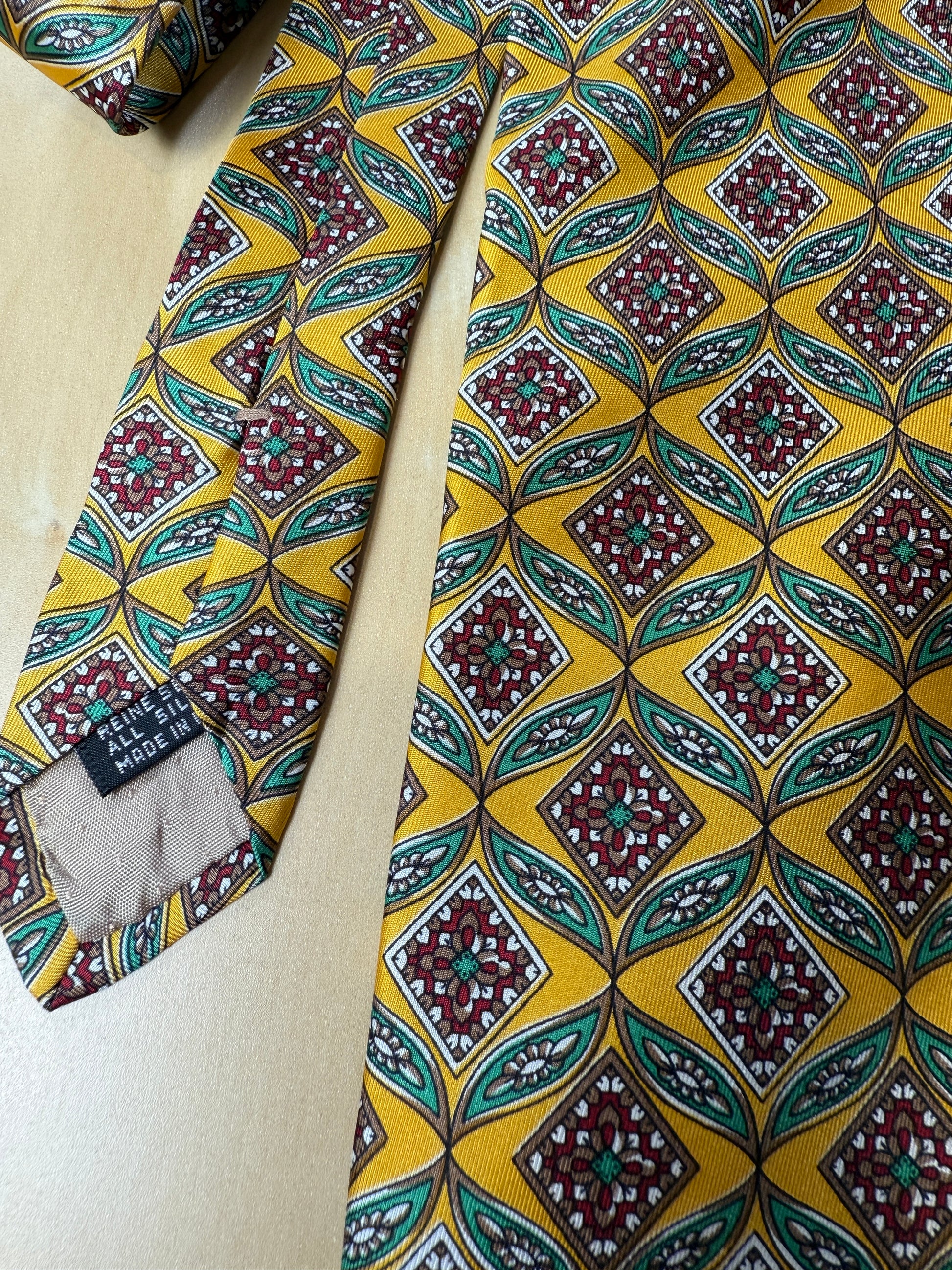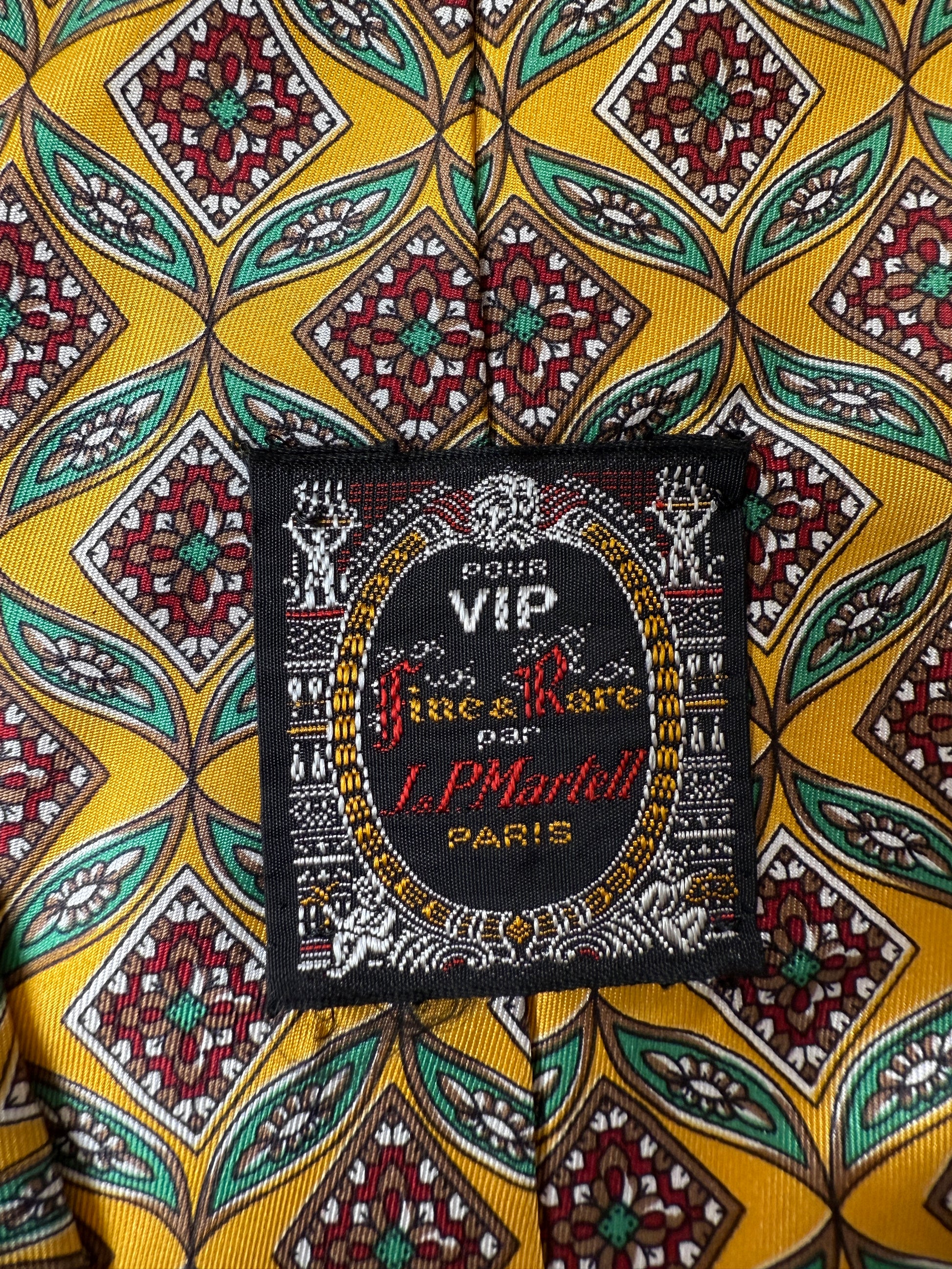 Cravatta vintage J. P. Martell in morbidissimo twill 100% seta, con fantasia geometrica in verde e rosso su fondo giallo.