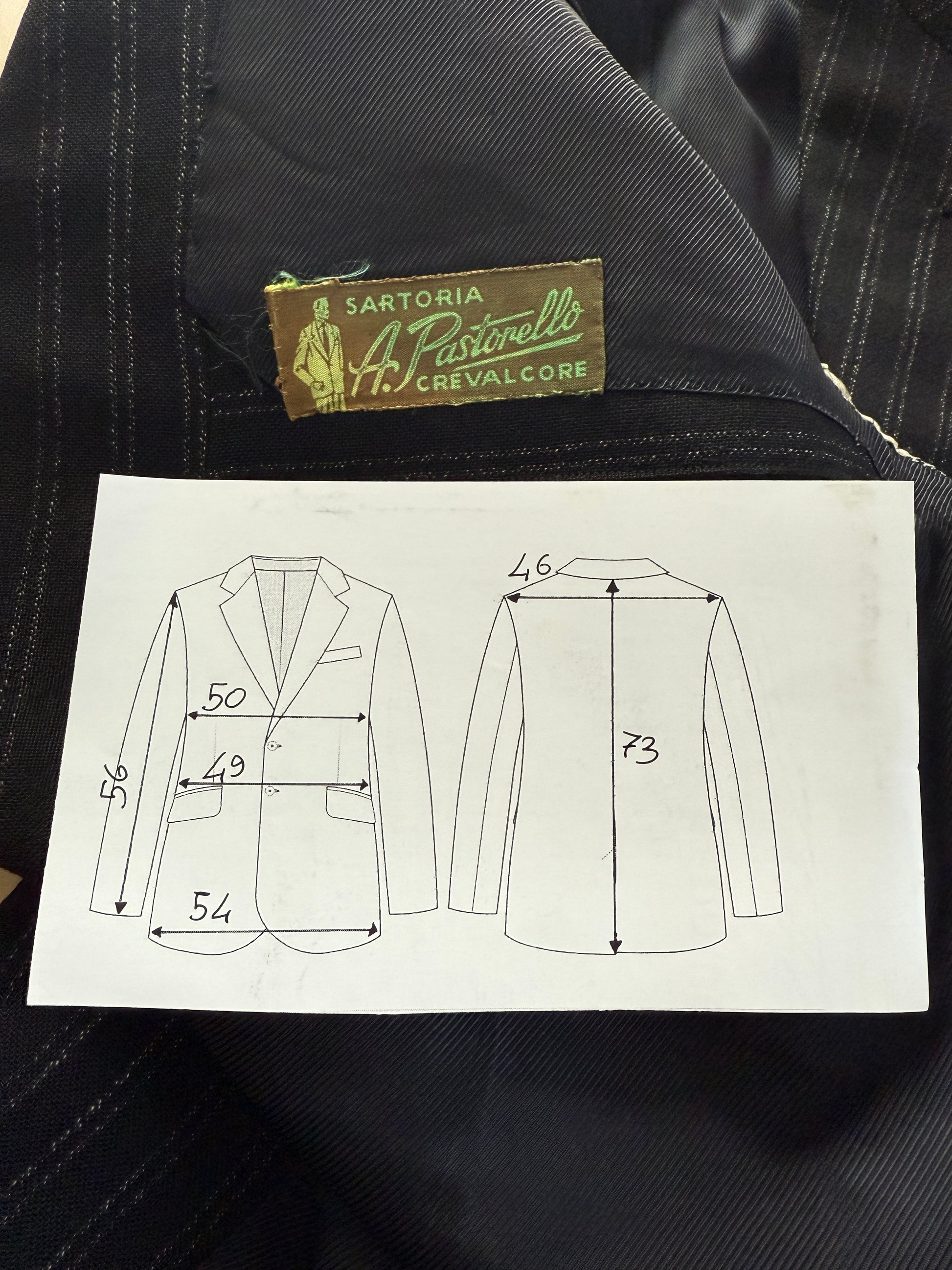 🔎Esempio pratico: la giacca usata come modello in questa guida (v. foto) ha una misura torace di 54 cm. Si tratta della giacca di un abito anni '90 dal taglio generale abbastanza morbido; inoltre, l'abito è un 3 pezzi e va quindi considerato un po' più di margine di vestibilità della giacca per poter indossare comodamente il gilet. Perciò, come da nostra prassi enunciata sopra consideriamo un margine di vestibilità di 6-7 cm: la taglia della giacca sarà quindi 54-6 o 7 = 47 o 48, che corrisponde a una tg. 46/48.