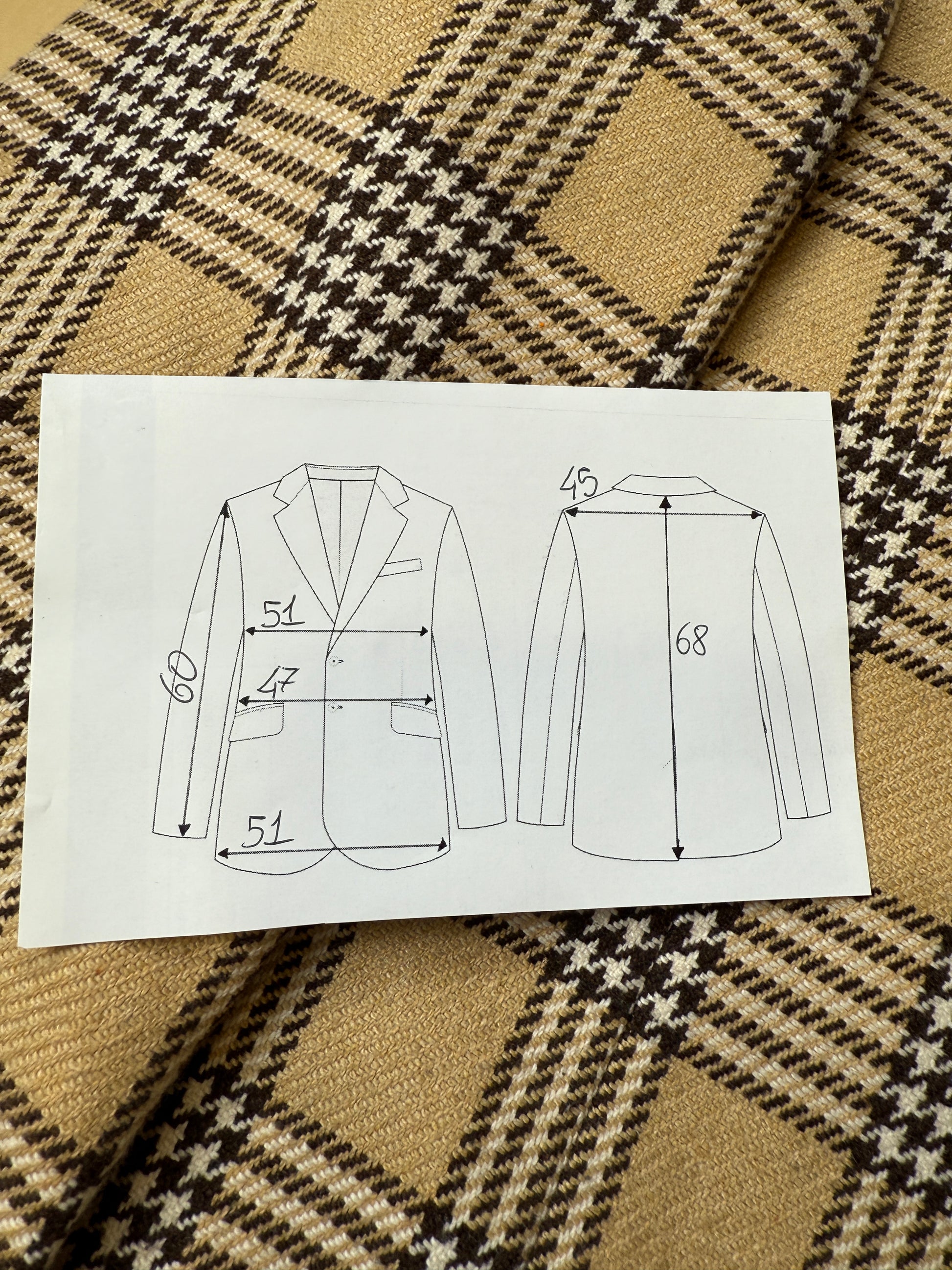 Iconica giacca anni ‘70 in lana pesante, colore beige crema con fantasia finestrata a quadri marrone.