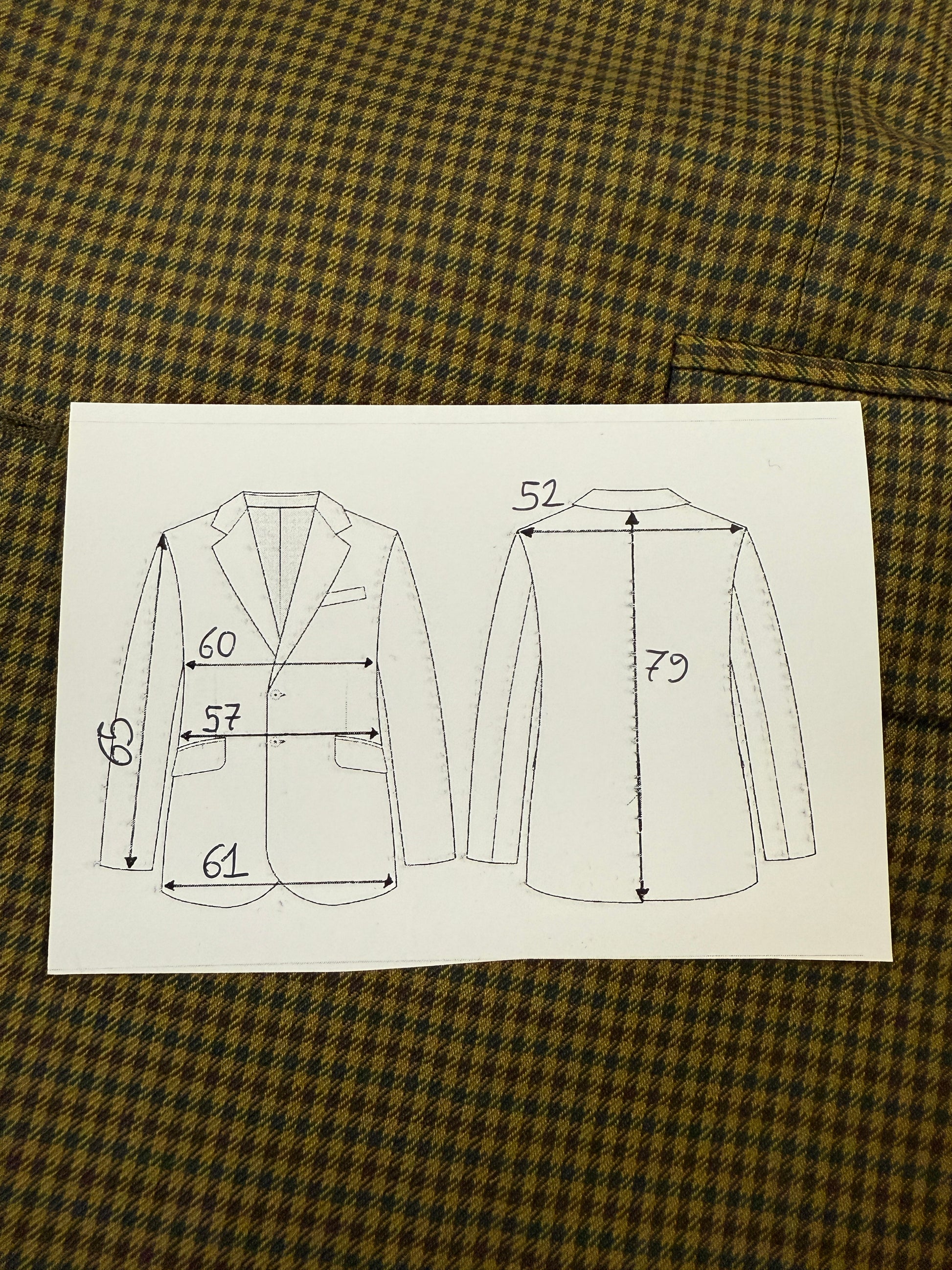 🔎Esempio pratico: la giacca usata come modello in questa guida (v. foto) ha una misura torace di 54 cm. Si tratta della giacca di un abito anni '90 dal taglio generale abbastanza morbido; inoltre, l'abito è un 3 pezzi e va quindi considerato un po' più di margine di vestibilità della giacca per poter indossare comodamente il gilet. Perciò, come da nostra prassi enunciata sopra consideriamo un margine di vestibilità di 6-7 cm: la taglia della giacca sarà quindi 54-6 o 7 = 47 o 48, che corrisponde a una tg. 46/48.