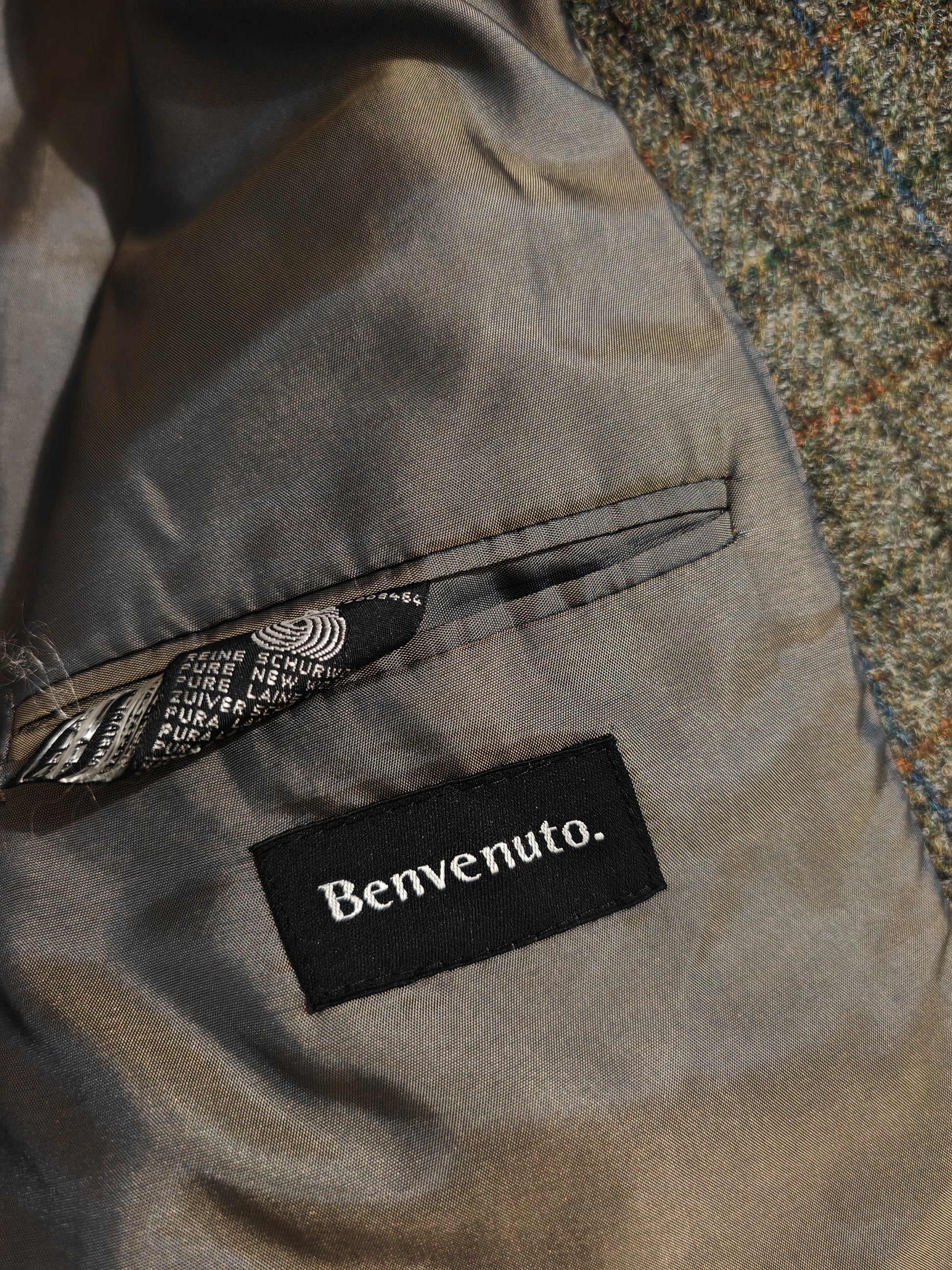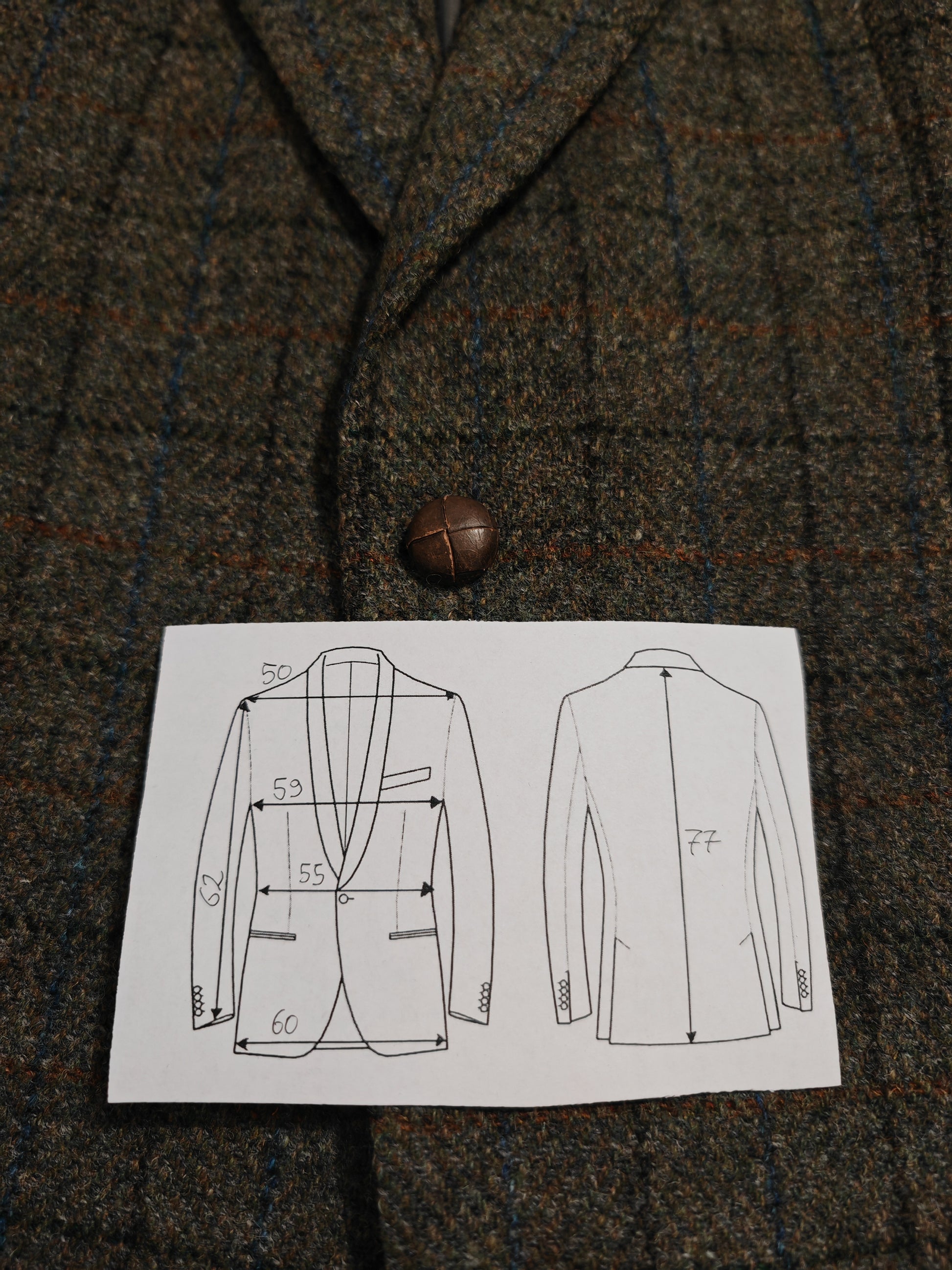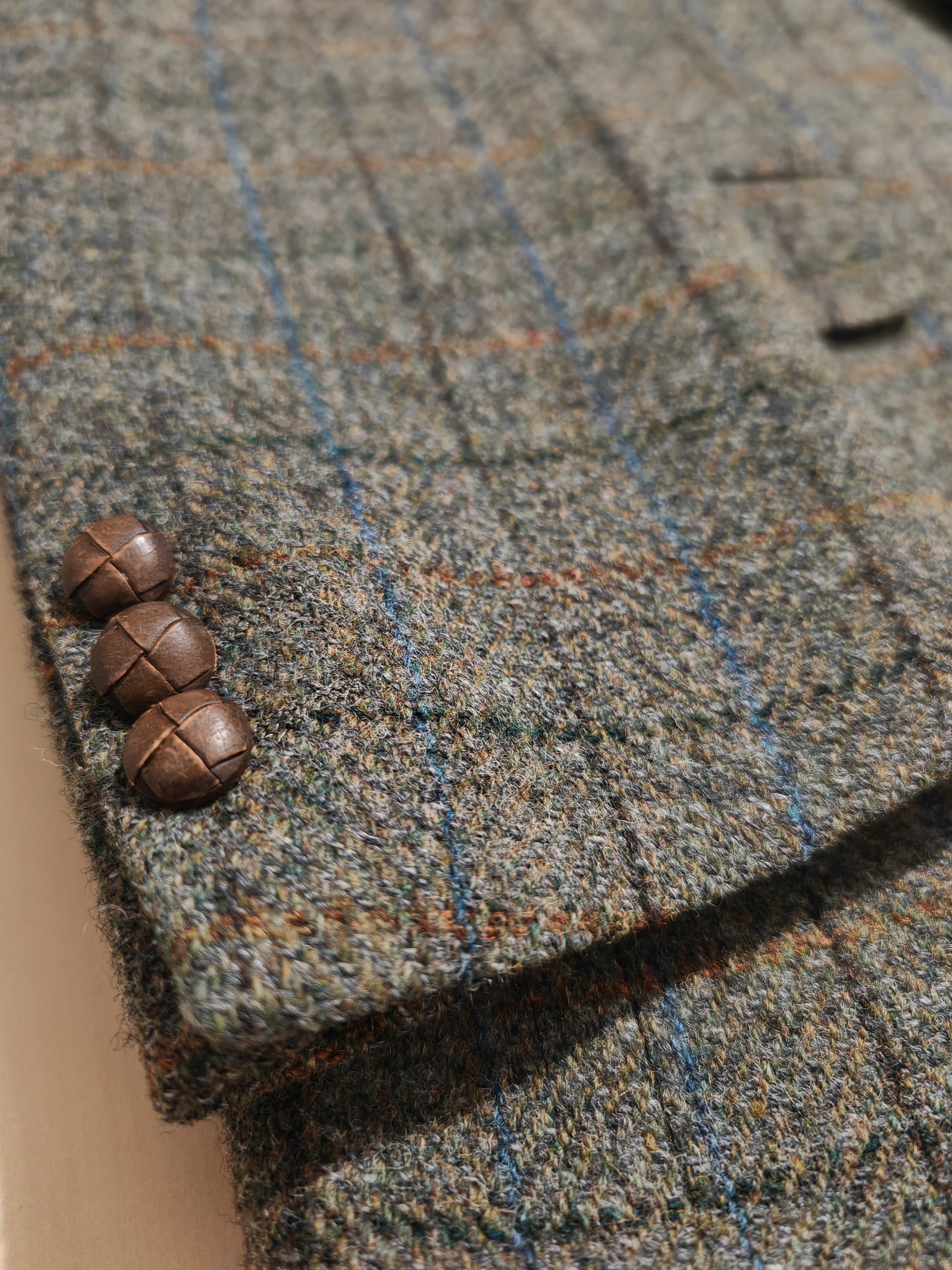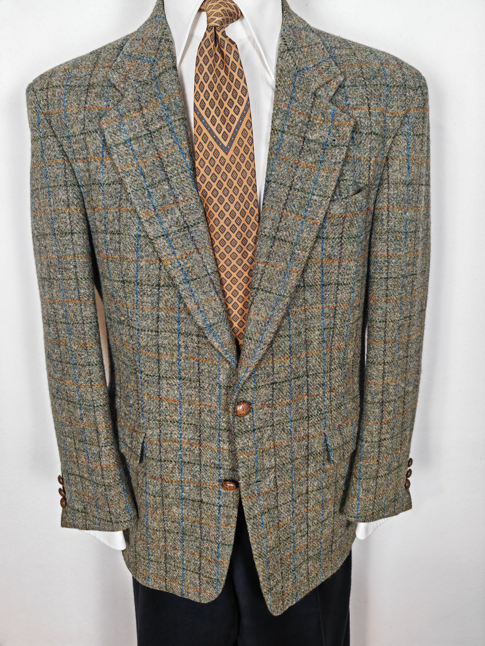 Giacca di confezione anni '80 in uno stupendo tessuto Harris Tweed verde cachi con tripla fantasia finestrata (riga blu, ruggine/arancio, verdone). Tweed molto pesante e cardato.