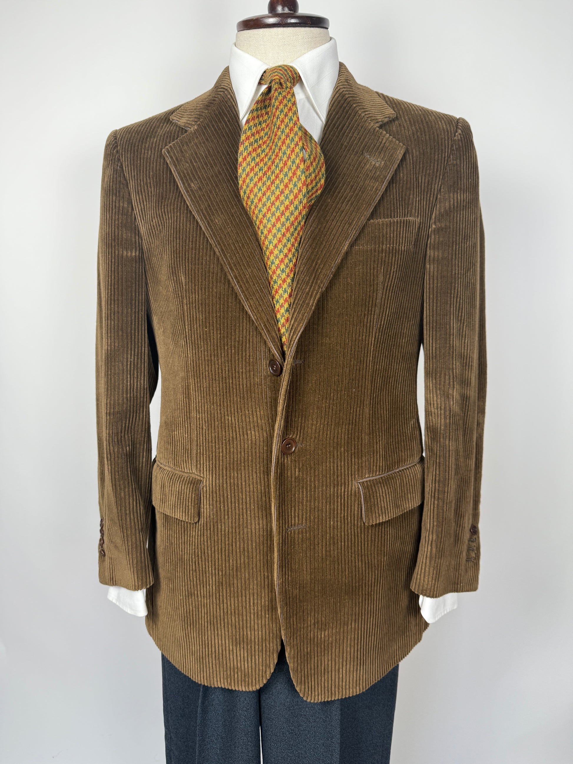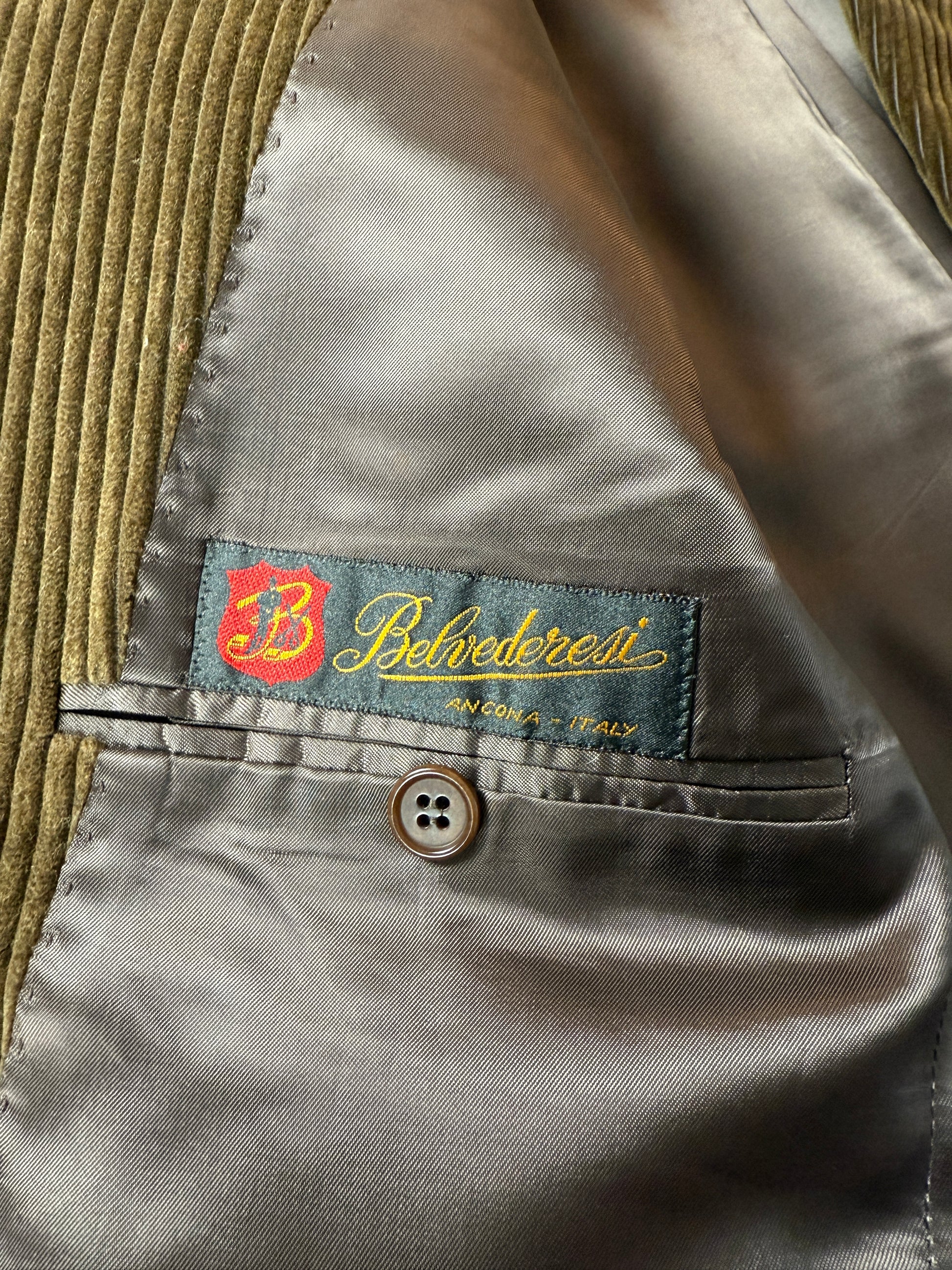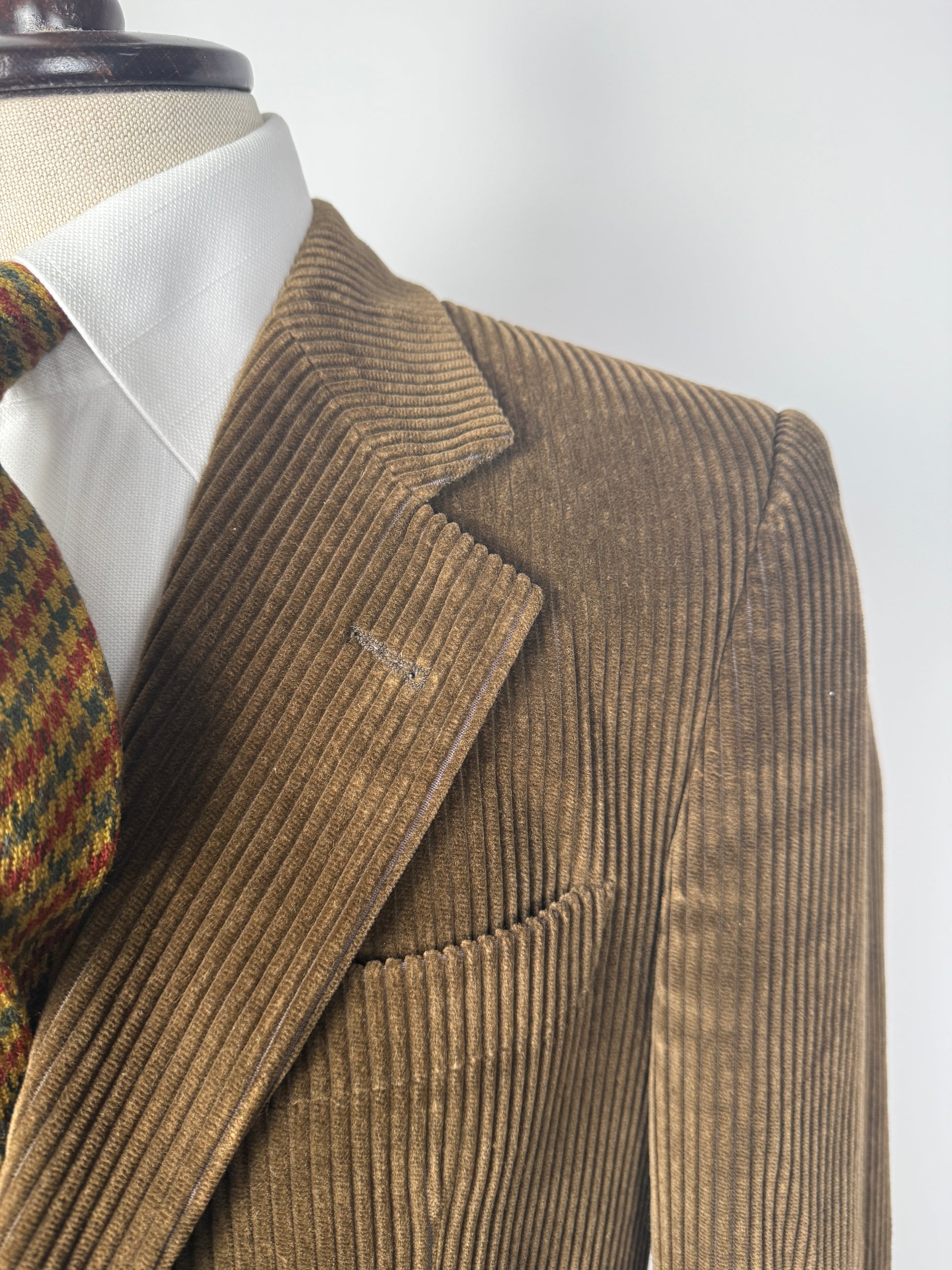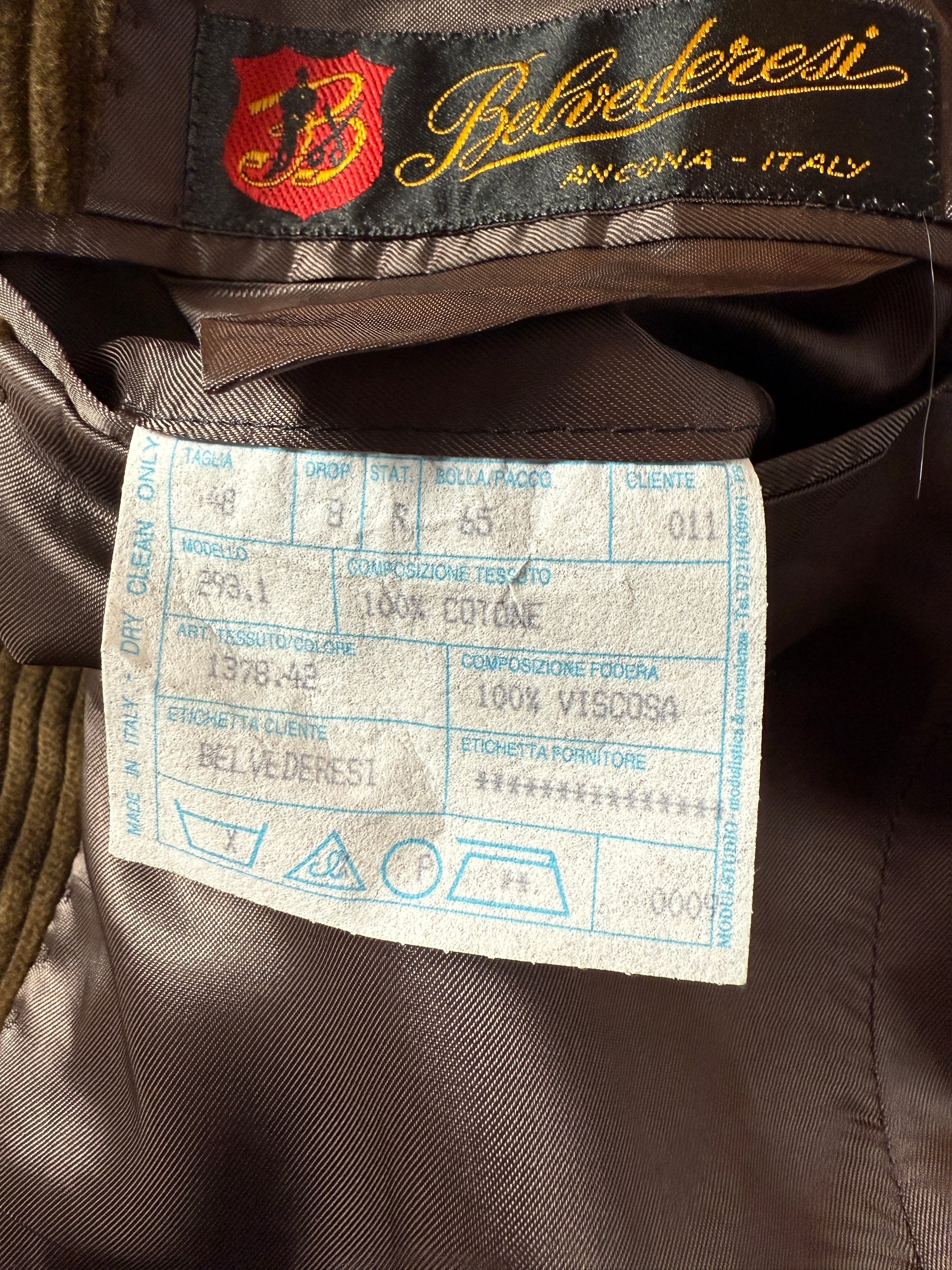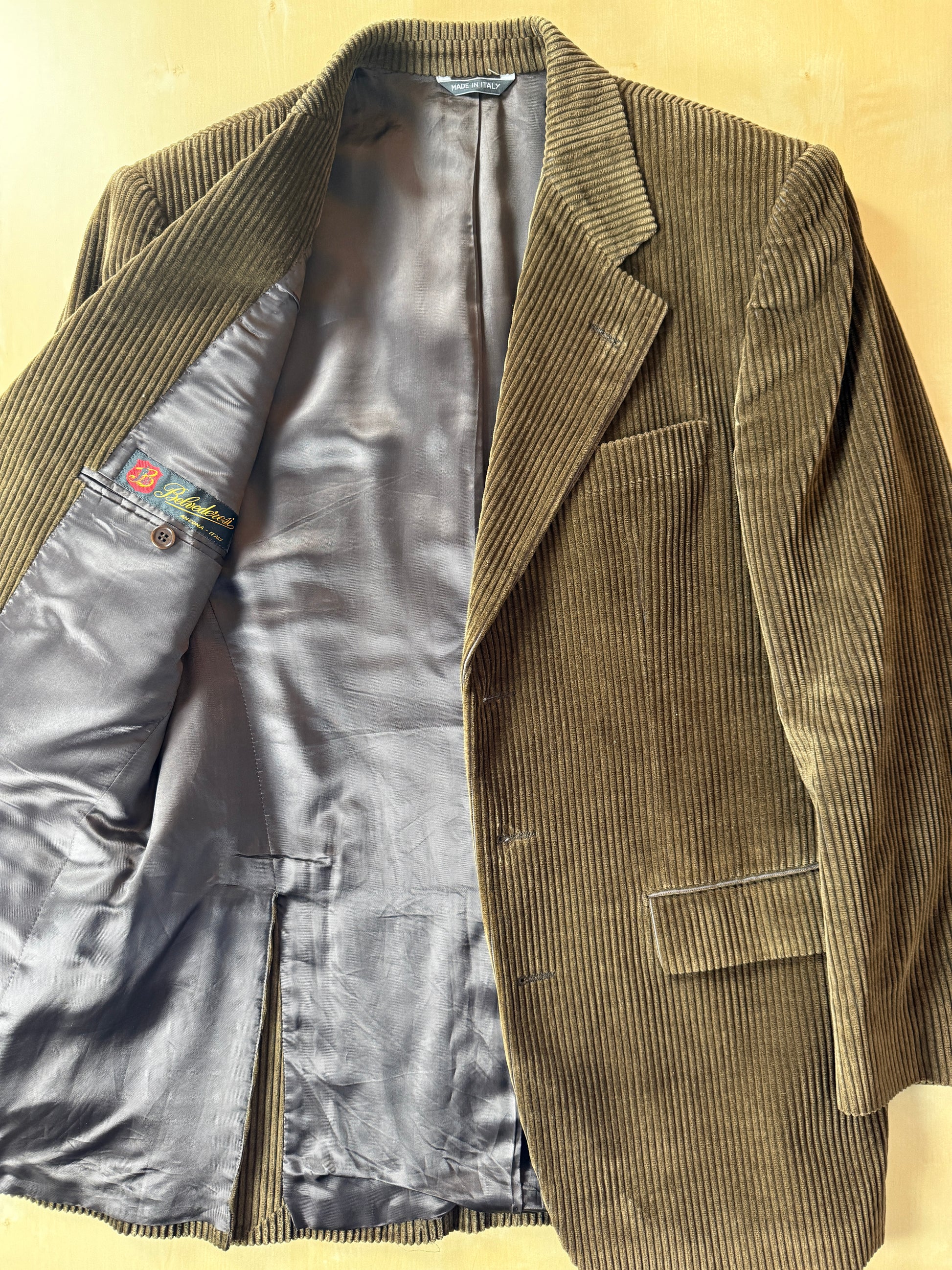 Giacca anni '80 in velluto a coste ampie, 100% cotone, colore a metà fra il marrone e il verde scuro/cachi.