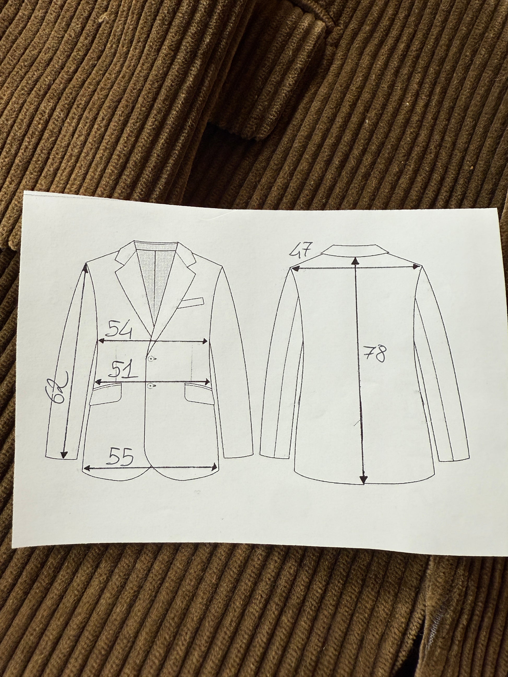 🔎Esempio pratico: la giacca usata come modello in questa guida (v. foto) ha una misura torace di 54 cm. Si tratta della giacca di un abito anni '90 dal taglio generale abbastanza morbido; inoltre, l'abito è un 3 pezzi e va quindi considerato un po' più di margine di vestibilità della giacca per poter indossare comodamente il gilet. Perciò, come da nostra prassi enunciata sopra consideriamo un margine di vestibilità di 6-7 cm: la taglia della giacca sarà quindi 54-6 o 7 = 47 o 48, che corrisponde a una tg. 46/48.